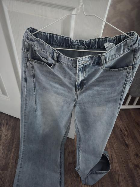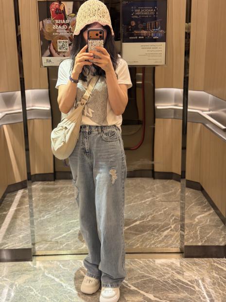 [KiiiKiii 착용] 레이스 배색 세미 와이드 데님 팬츠