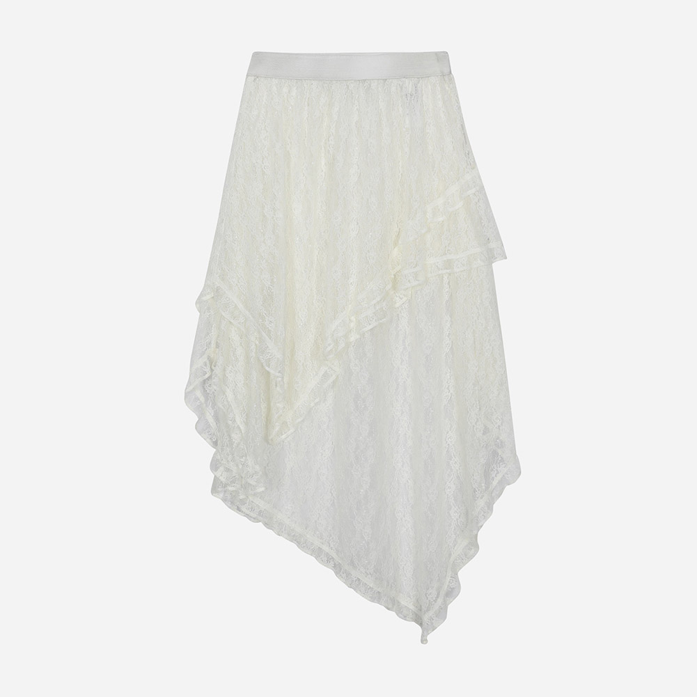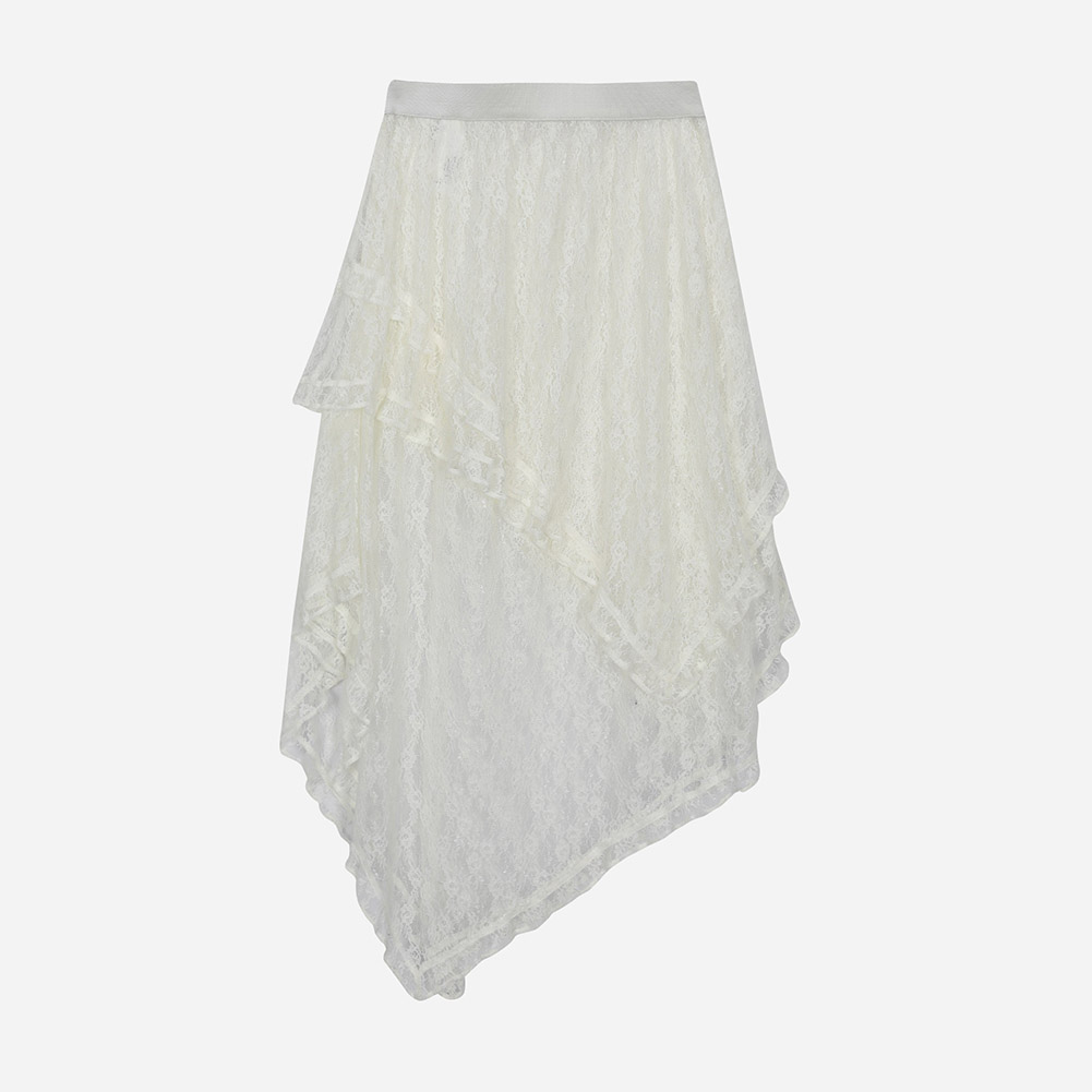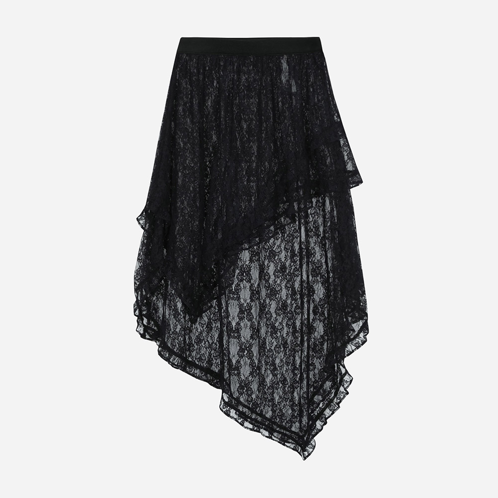 언발란스한 기장감의 레이스 스커트언발란스한 기장 편차를 주어 팬츠와 레이어링 했을 때, 멋스러운 아이템.