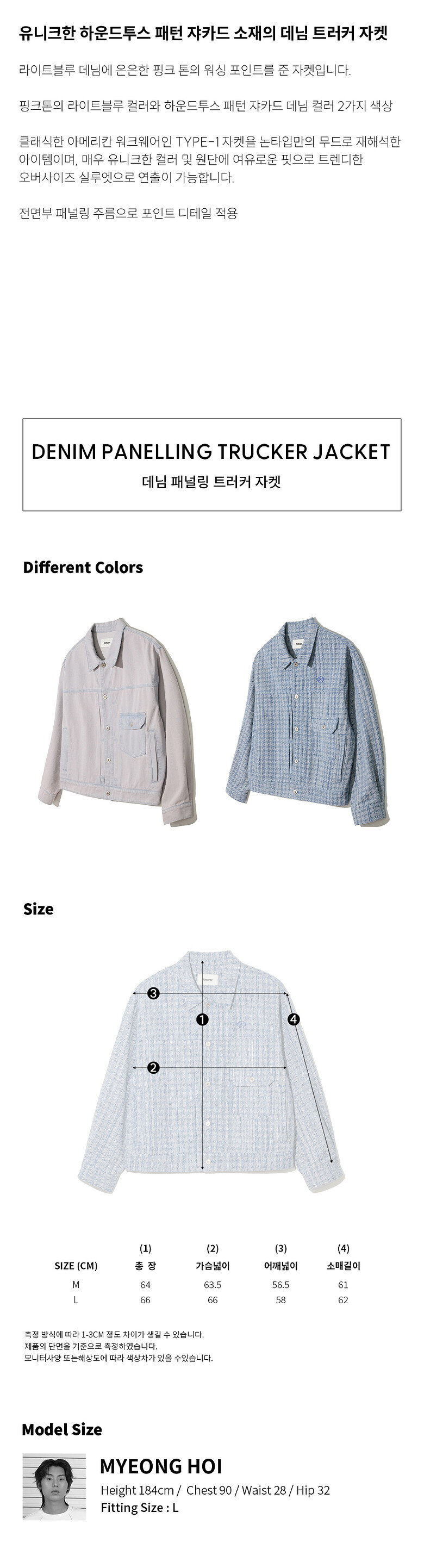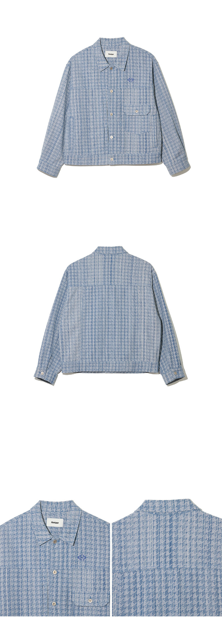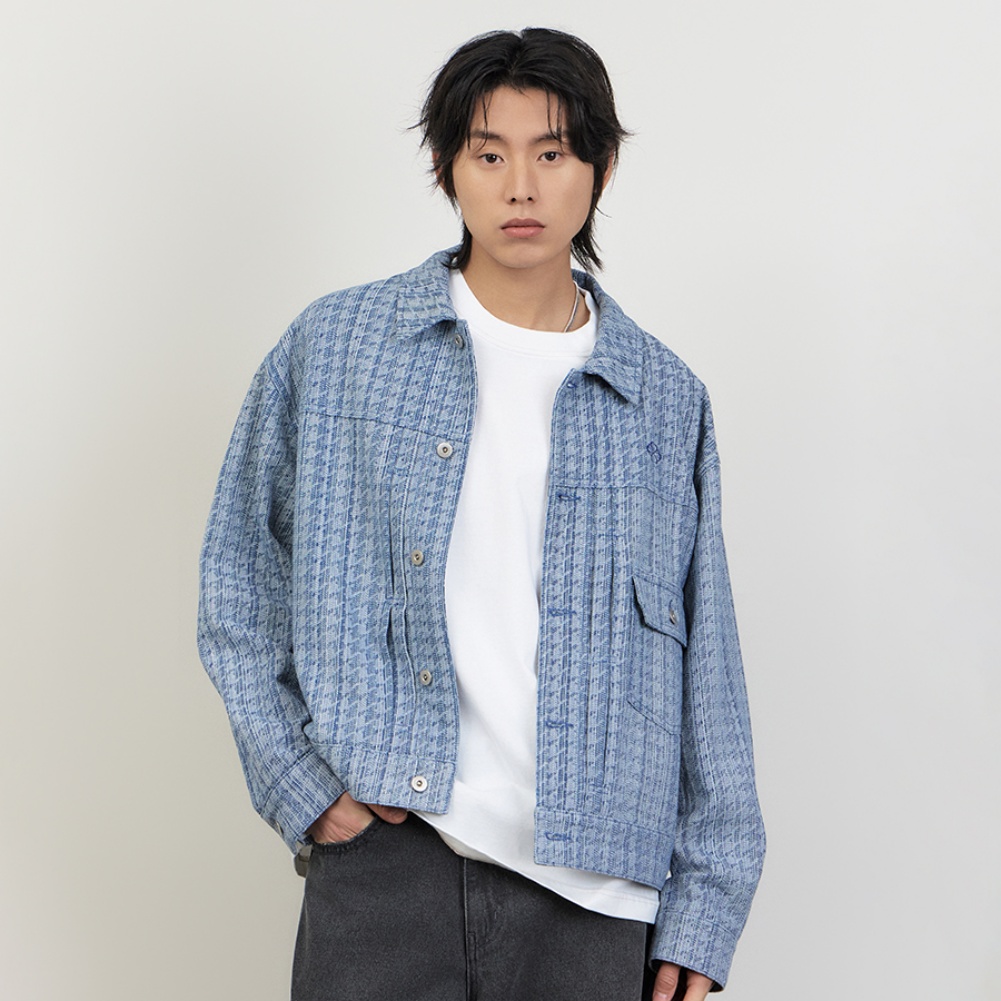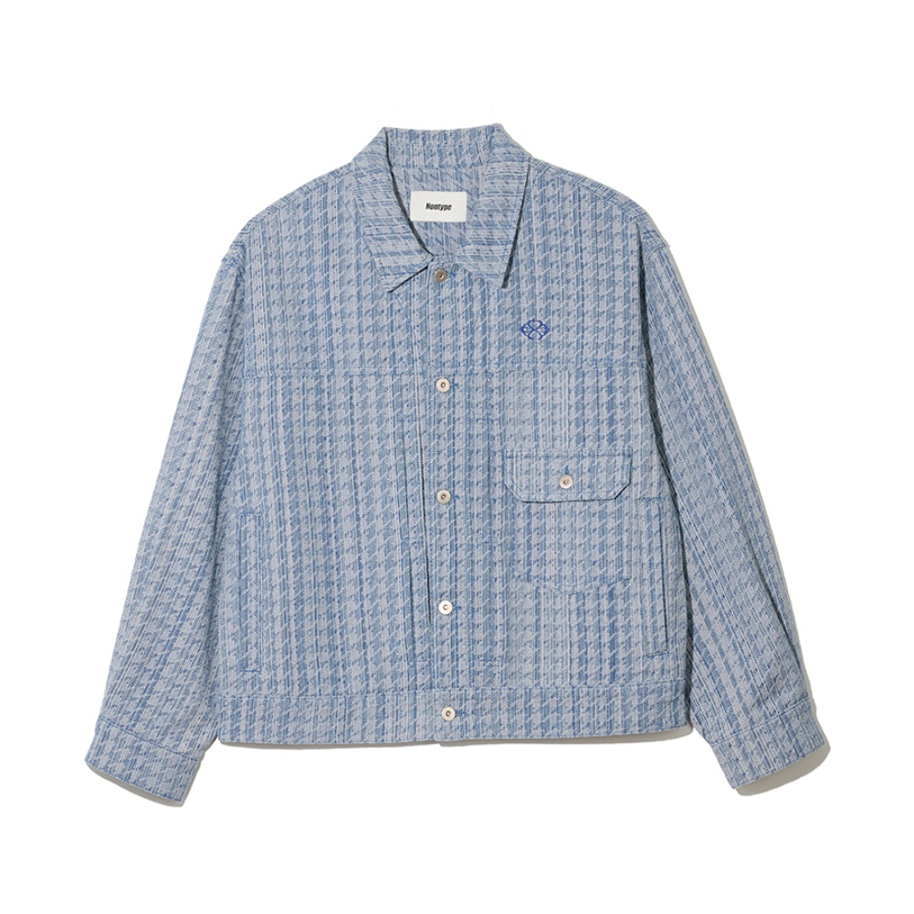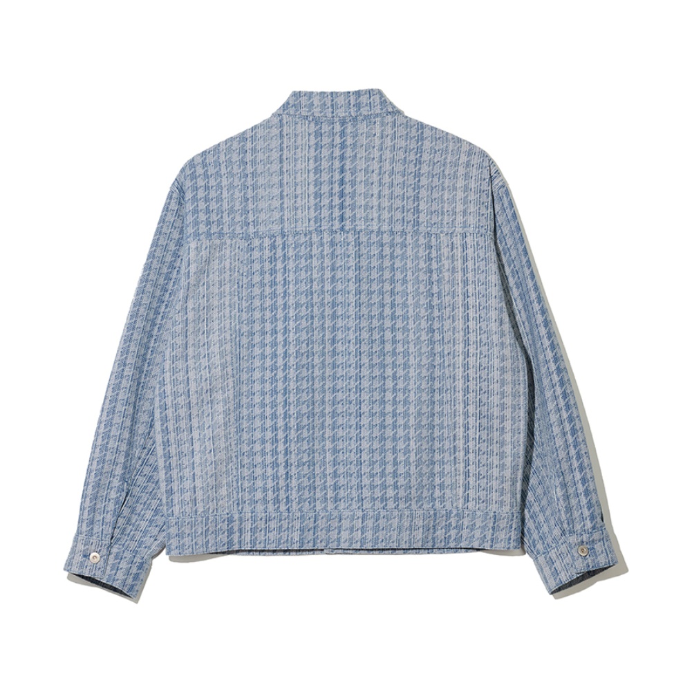 - 매우 유니크한 하운드투스 패턴 쟈카드 소재를 활용한 라이트블루 데님 트러커 자켓