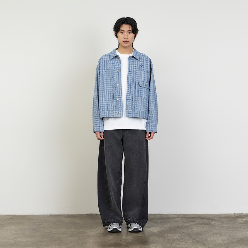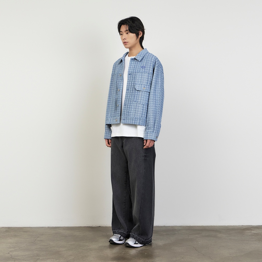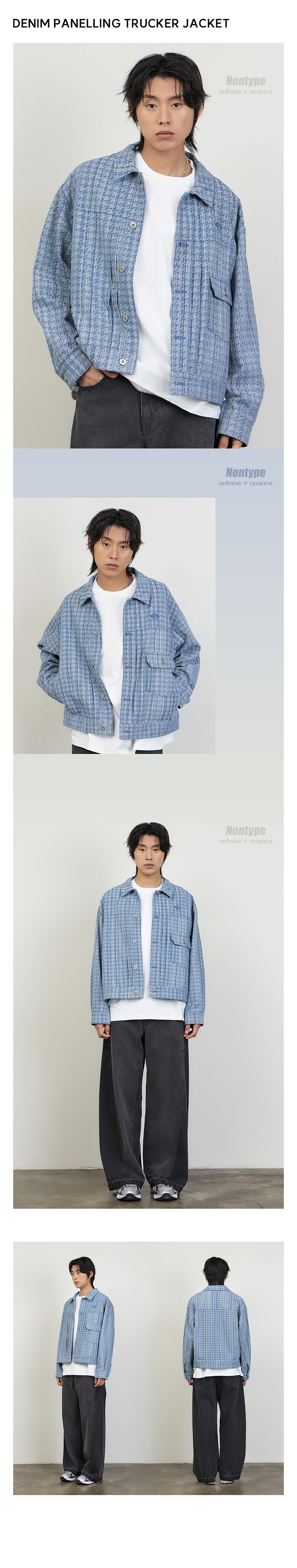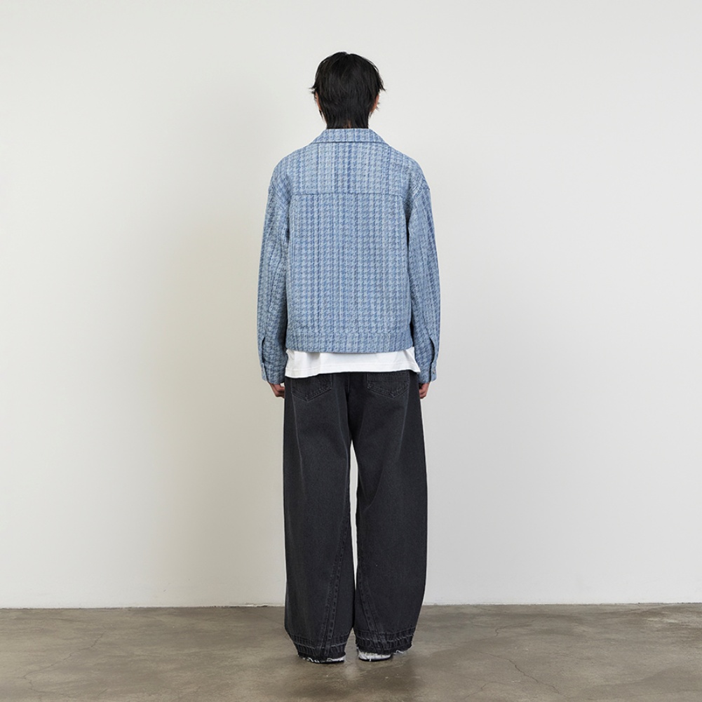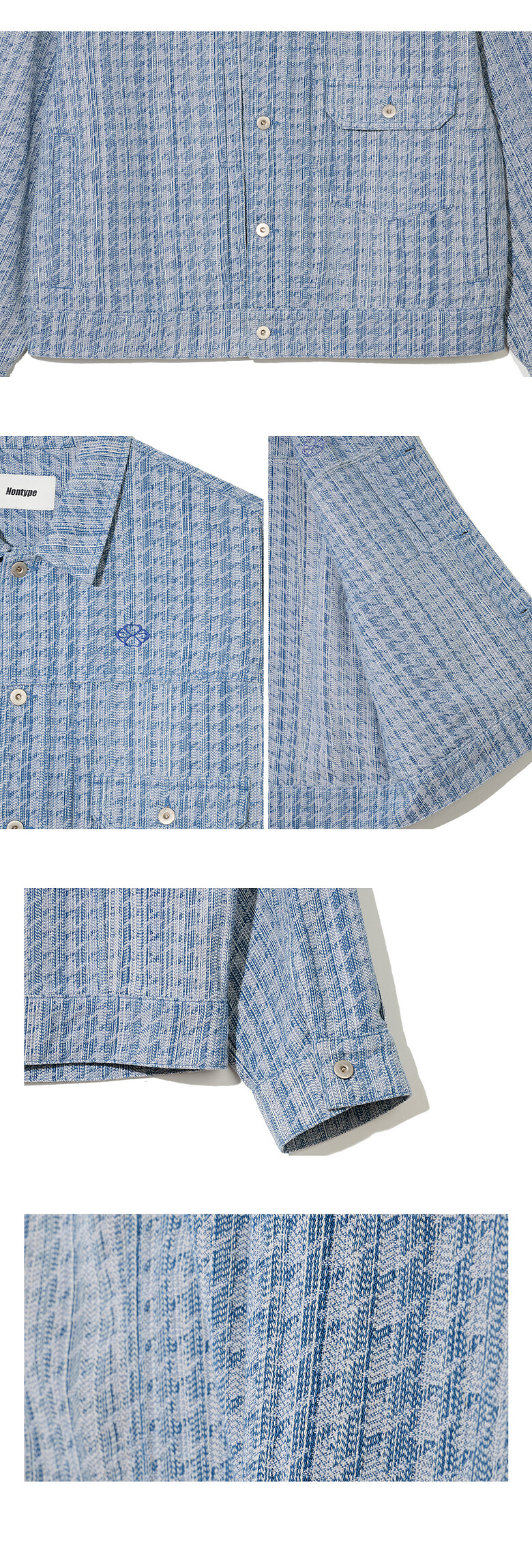 - 매우 유니크한 하운드투스 패턴 쟈카드 소재를 활용한 라이트블루 데님 트러커 자켓