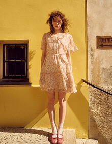 플라워 자수 원단의 풀 오픈 원피스.사다리 레이스를 스커트에 사용해 포인트를 준 여성스러운 아이템.