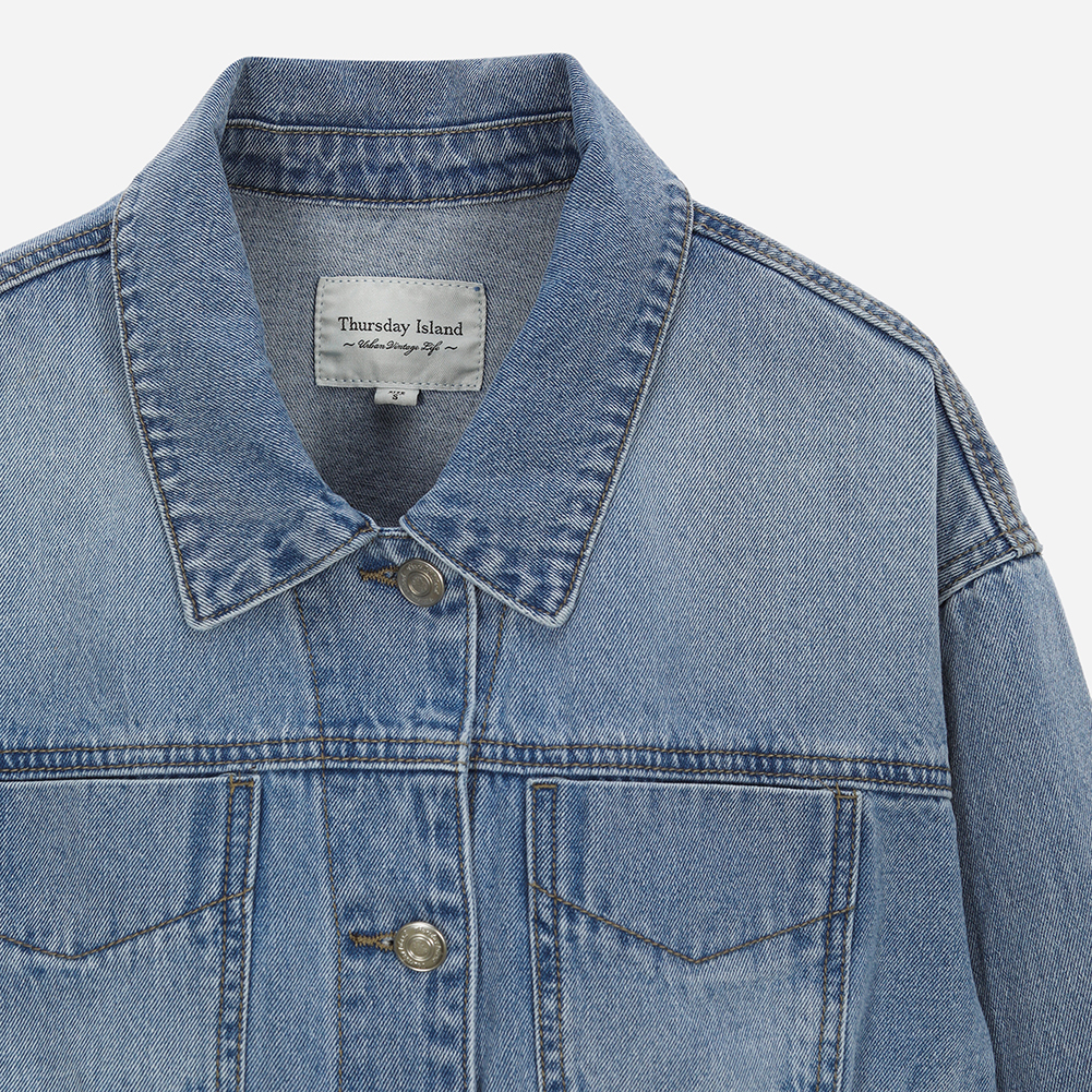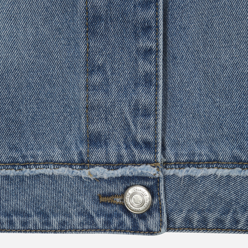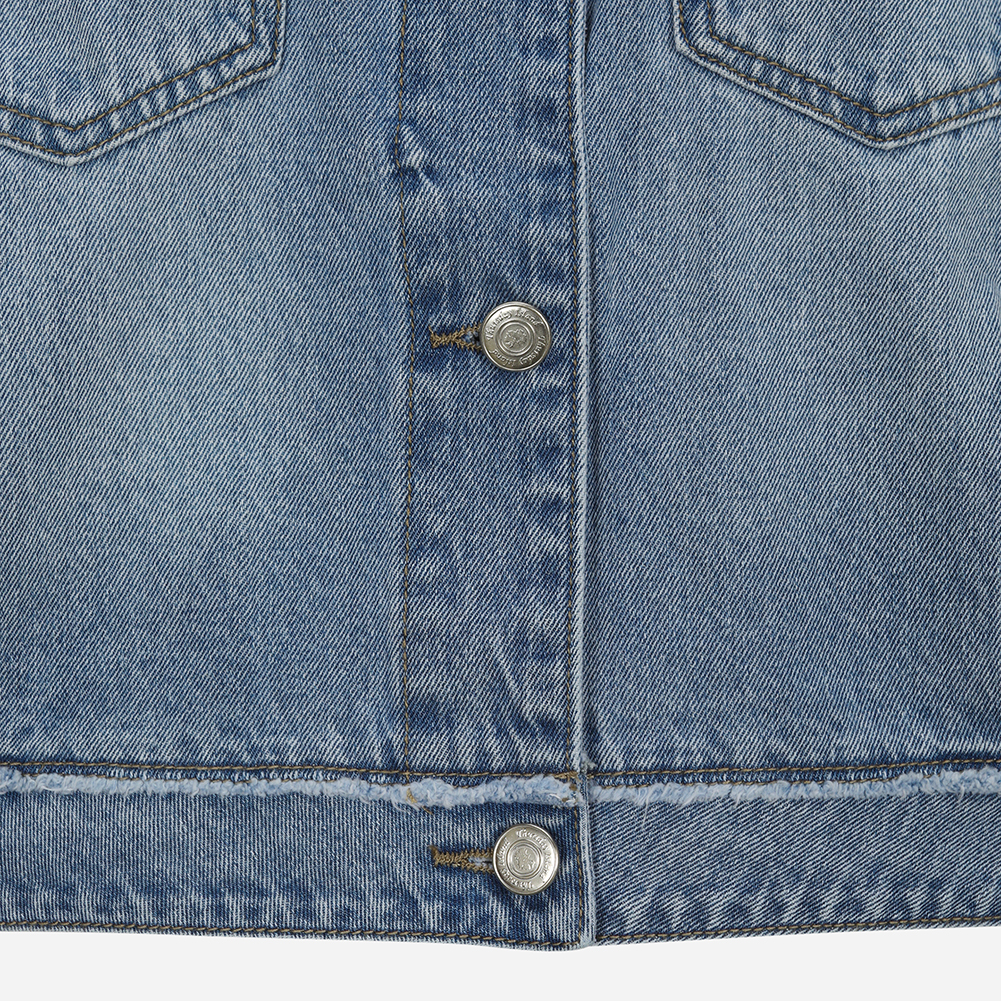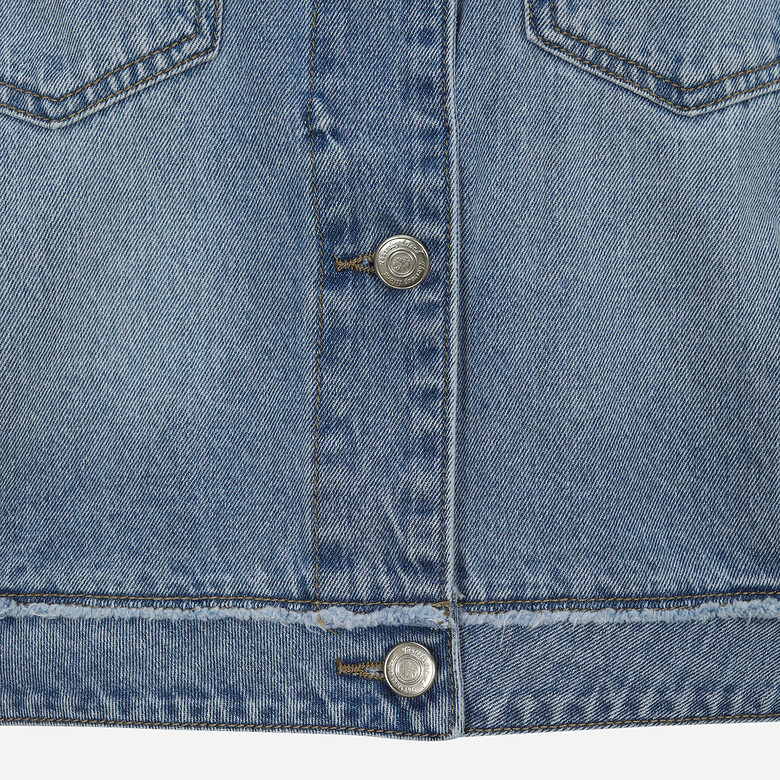 밑단 오프컷 프린지 디테일에 내추럴하게 연출된 워싱이 캐주얼하고 스타일리시한 데님 자켓.