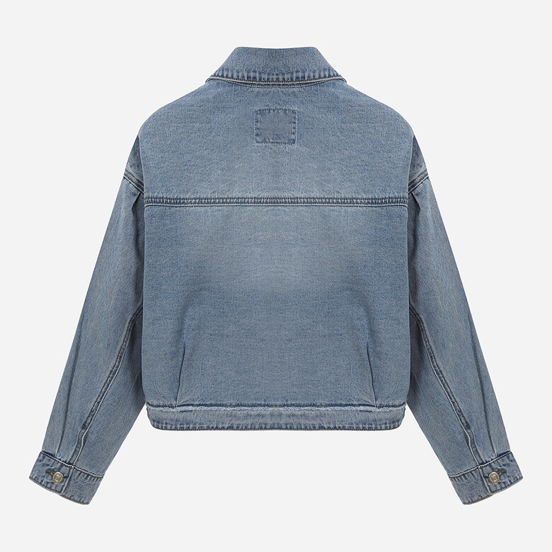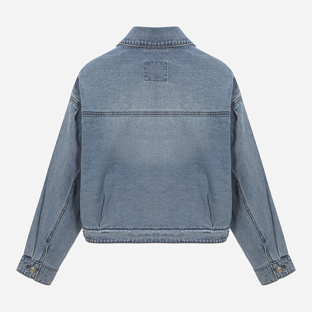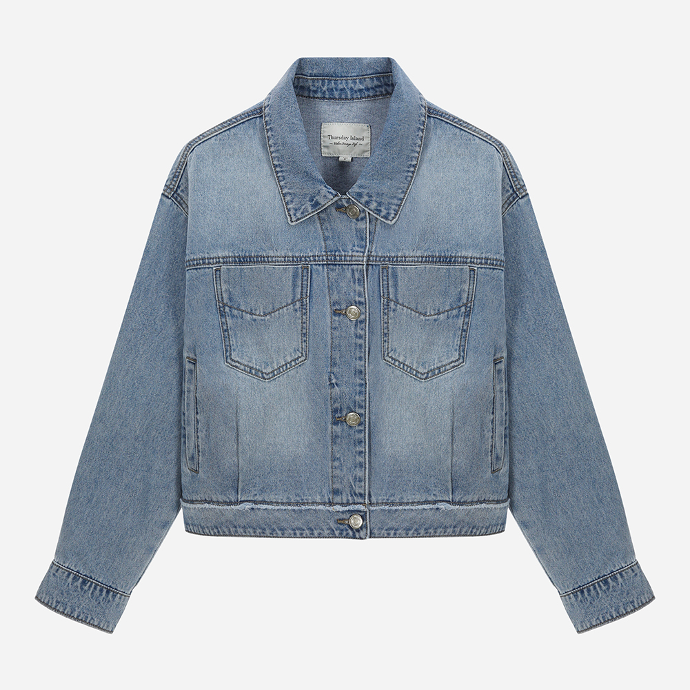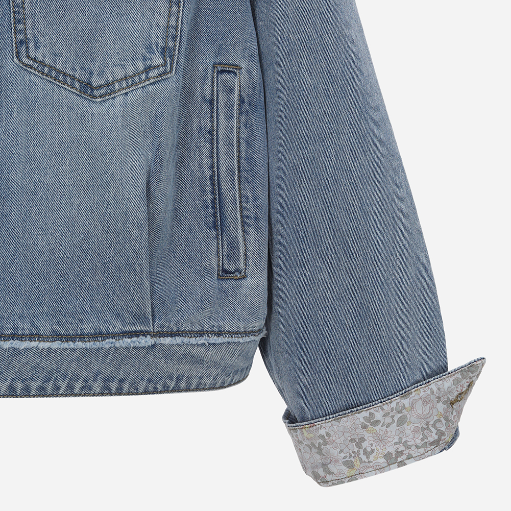 밑단 오프컷 프린지 디테일에 내추럴하게 연출된 워싱이 캐주얼하고 스타일리시한 데님 자켓.