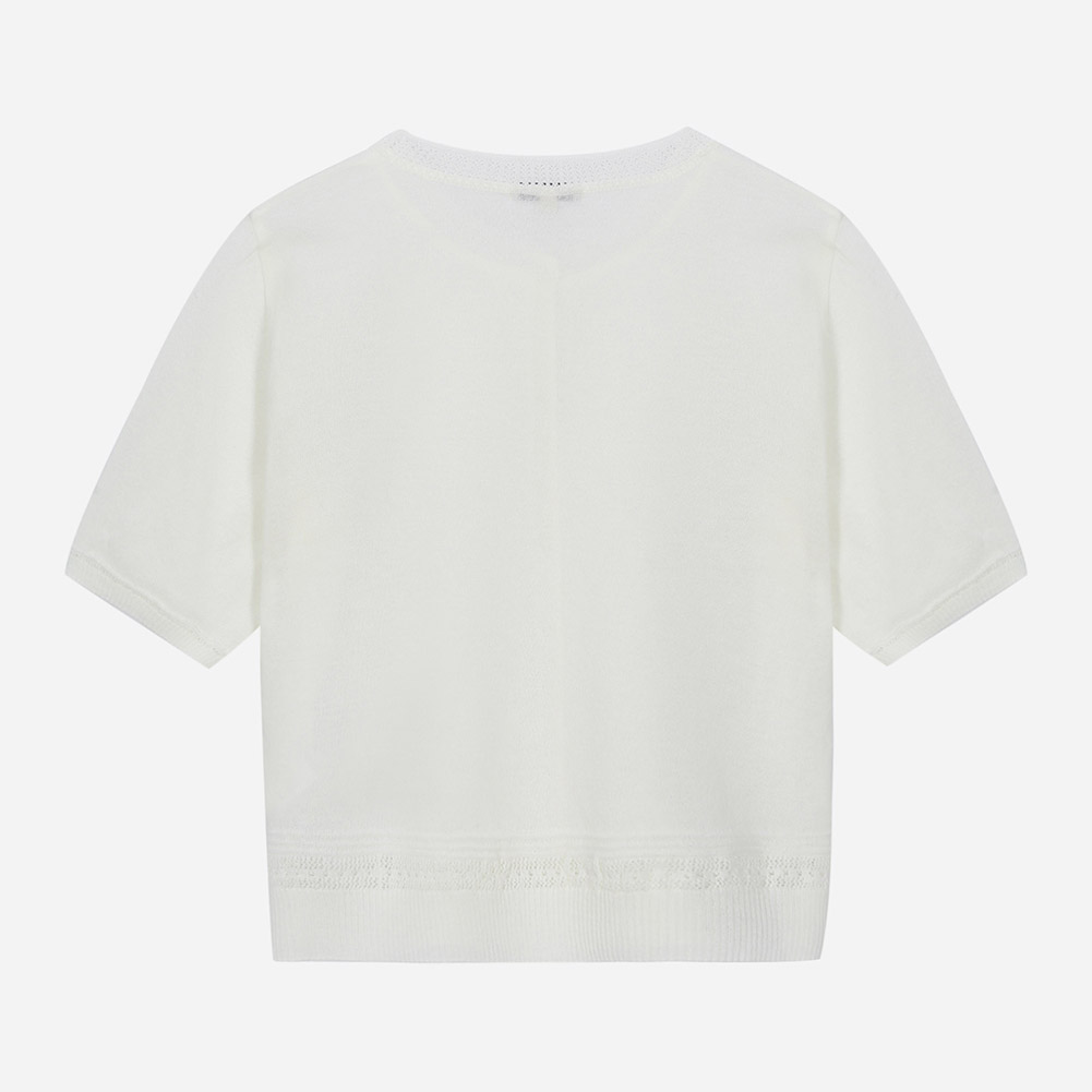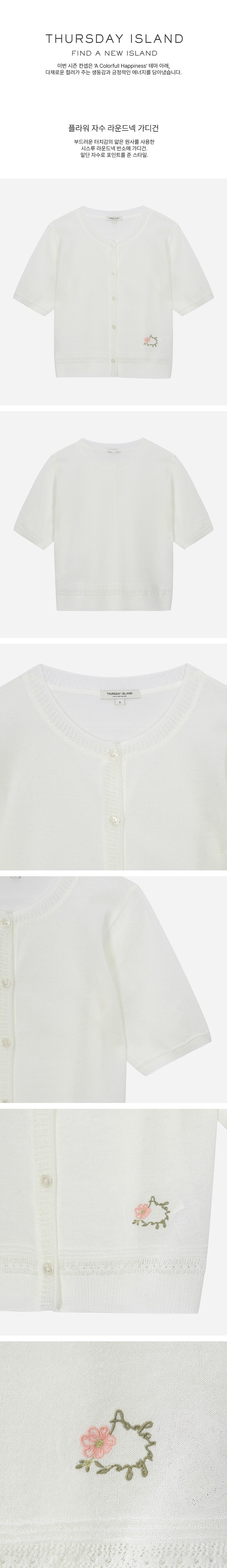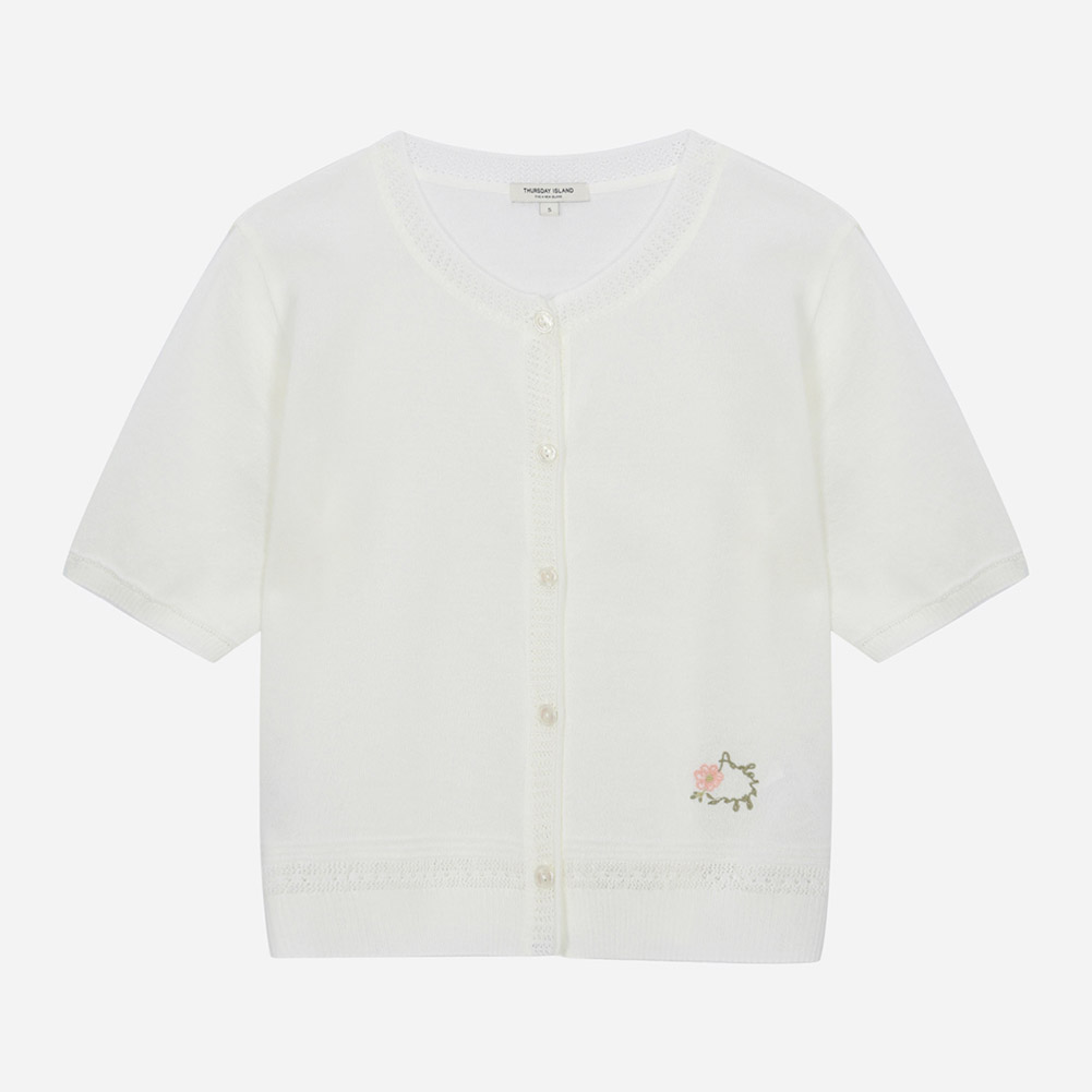 부드러운 터치감의 얇은 원사를 사용한 시스루 라운드넥 반소매 가디건.밑단 자수로 포인트를 준 스타일.