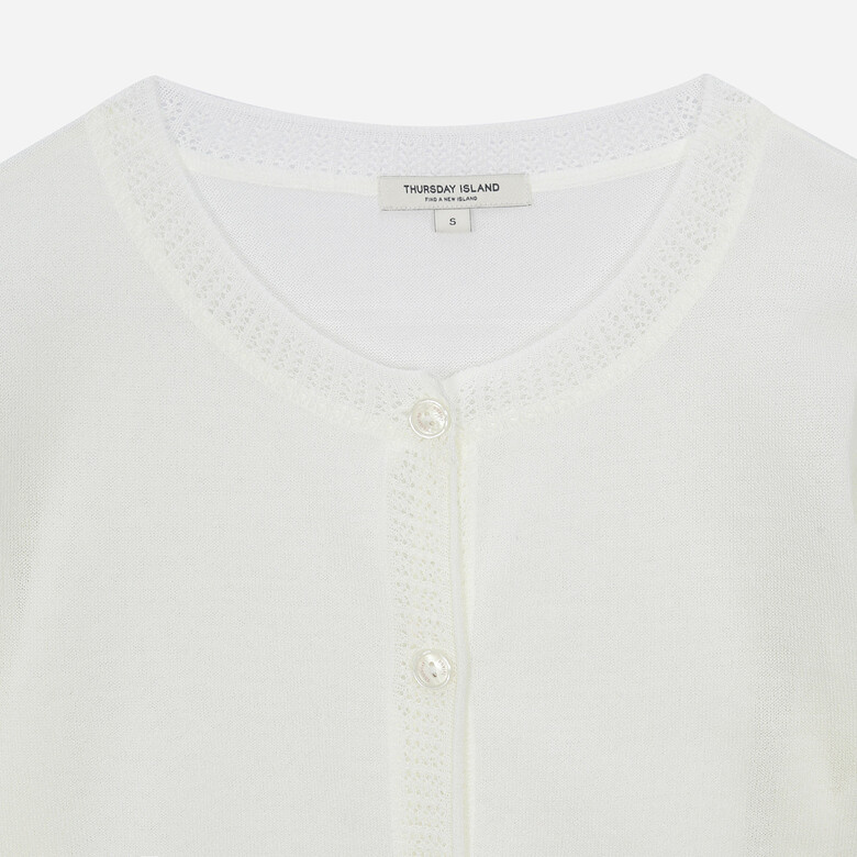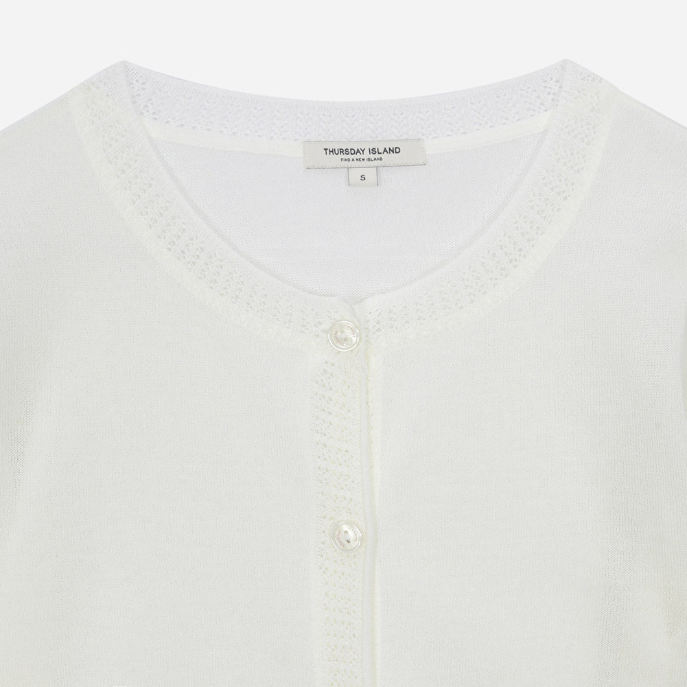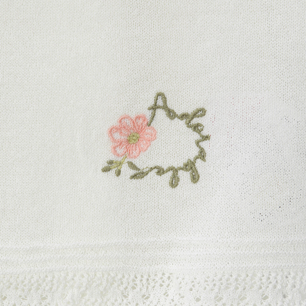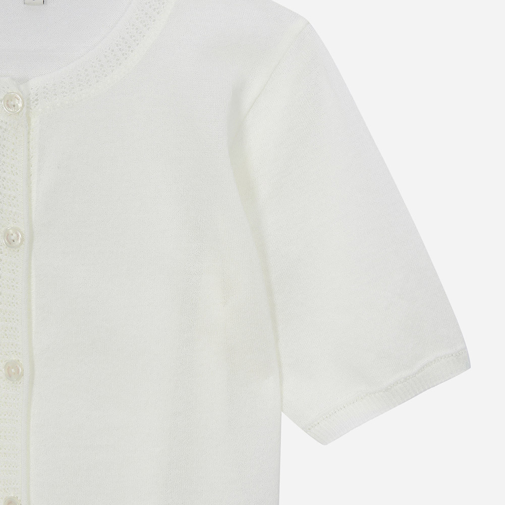 부드러운 터치감의 얇은 원사를 사용한 시스루 라운드넥 반소매 가디건.밑단 자수로 포인트를 준 스타일.