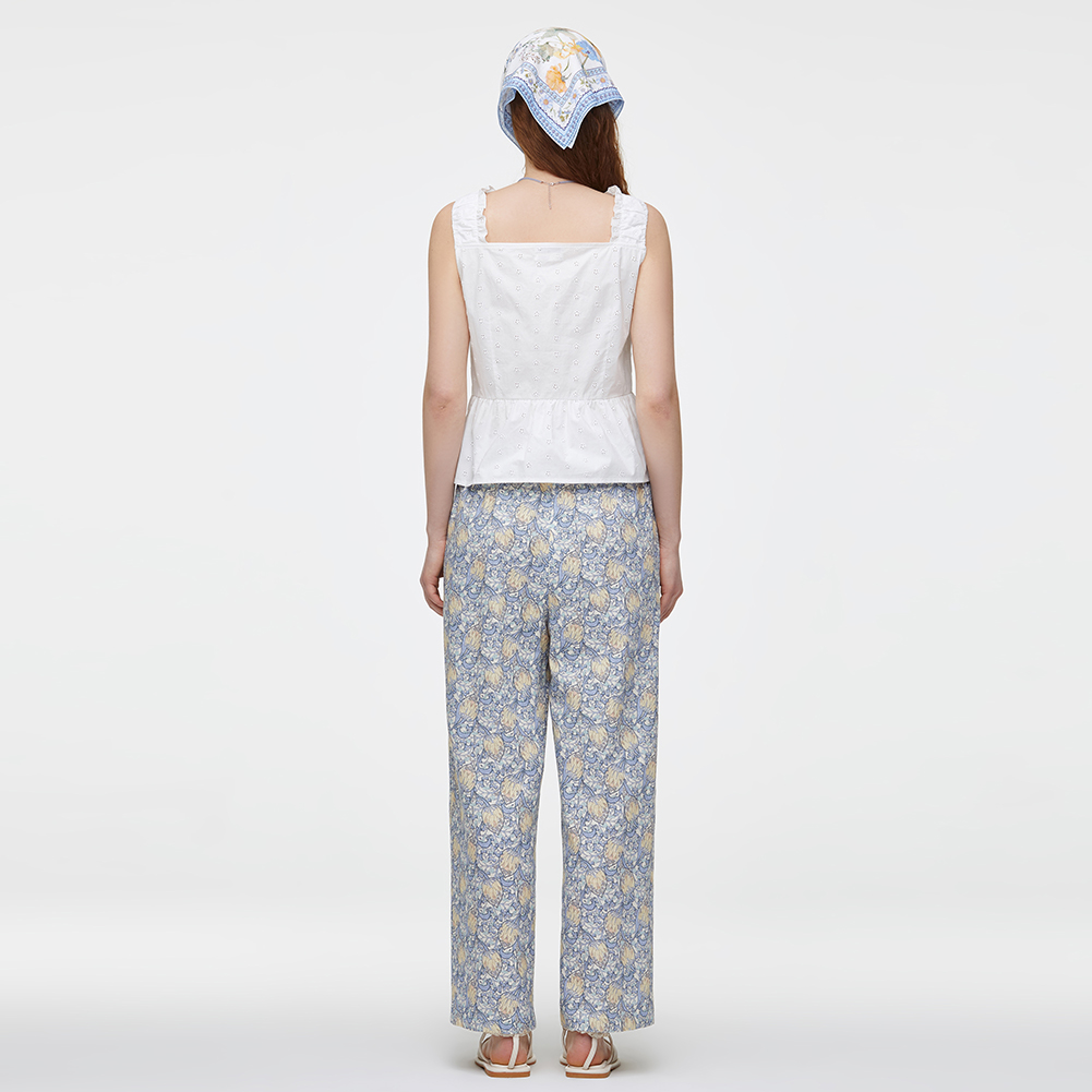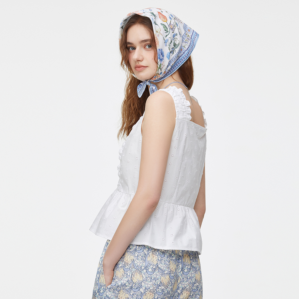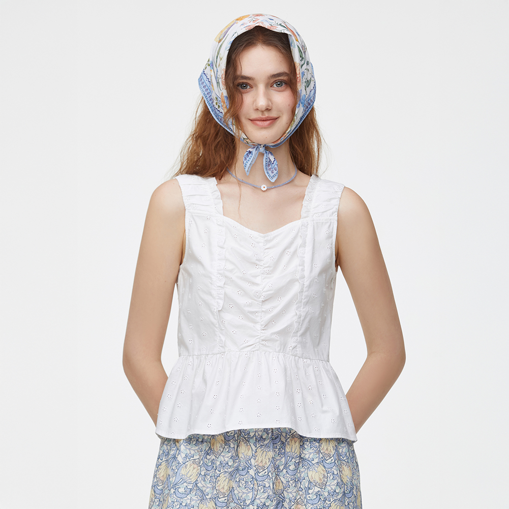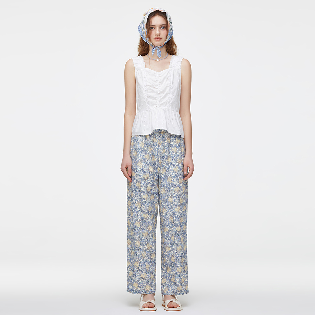 앞중심에 셔링이 있어 여성스러운 느낌을 주고, 캐주얼한 팬츠 아이템과 코디가 용이한 아이템.