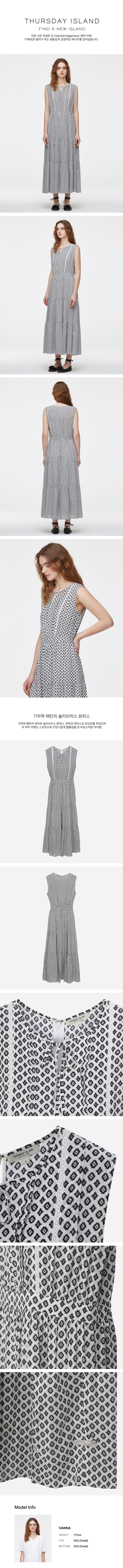 기하학 패턴의 레이온 슬리브리스 원피스.핀턱과 레이스로 포인트를 주었으며 뒤 허리 이밴드 스모킹으로 자연스럽게 볼륨감을 준 여성스러운 아이템.