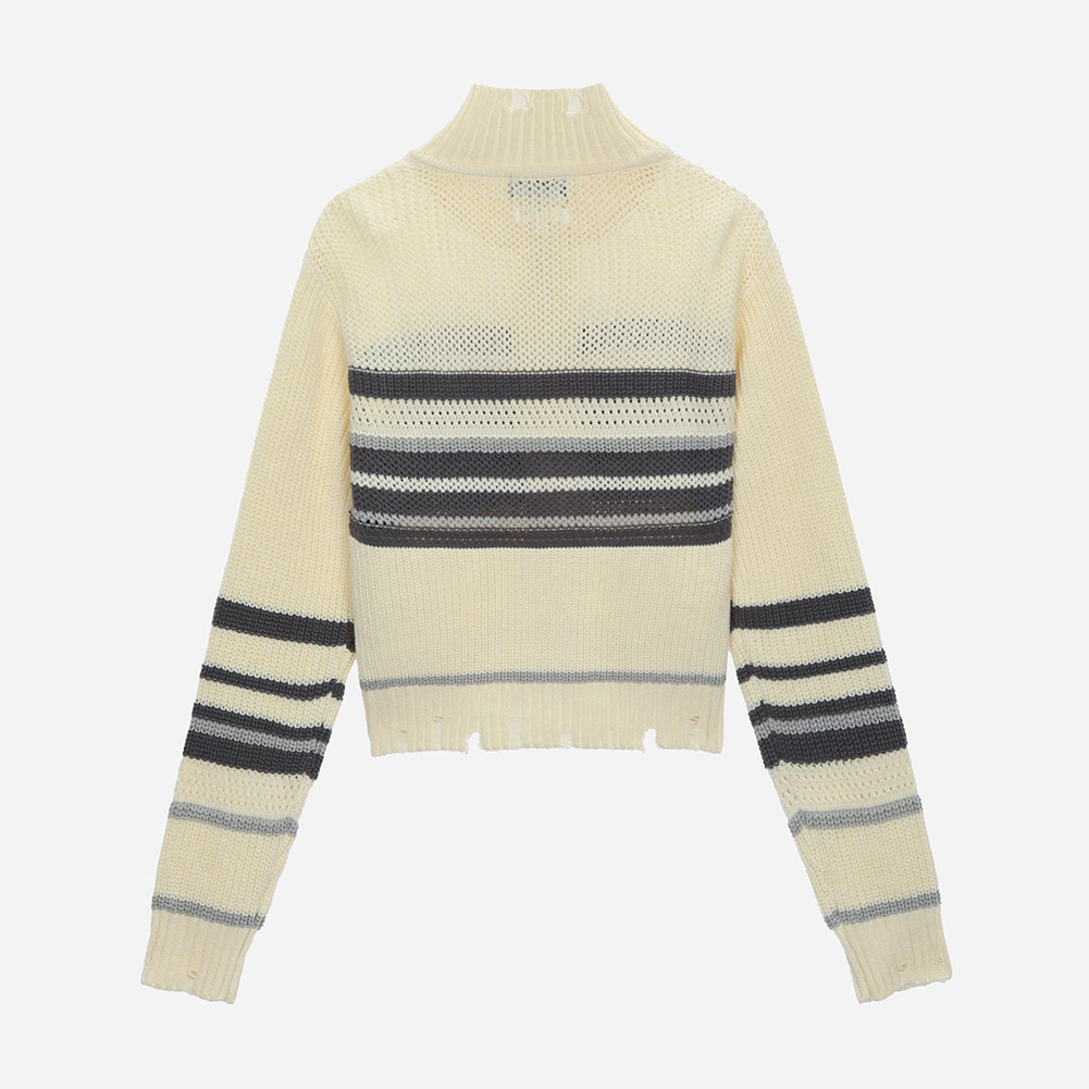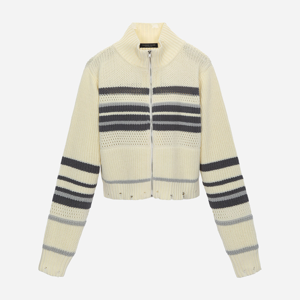 조직변화와 멀티 스트라이프 포인트인 집업 하이넥 가디건.넥과 밑단을 빈티지하게 마무리하여 멋스럽게 연출 가능한 아이템.