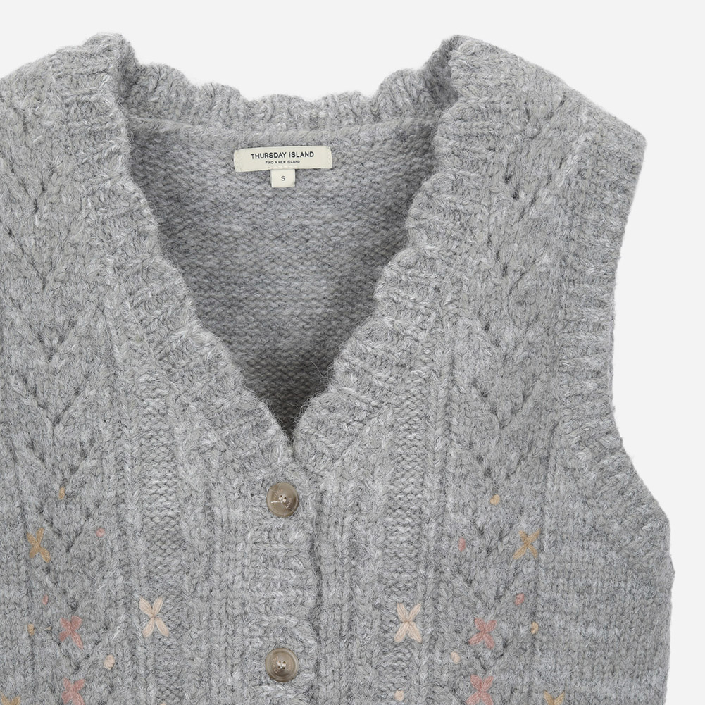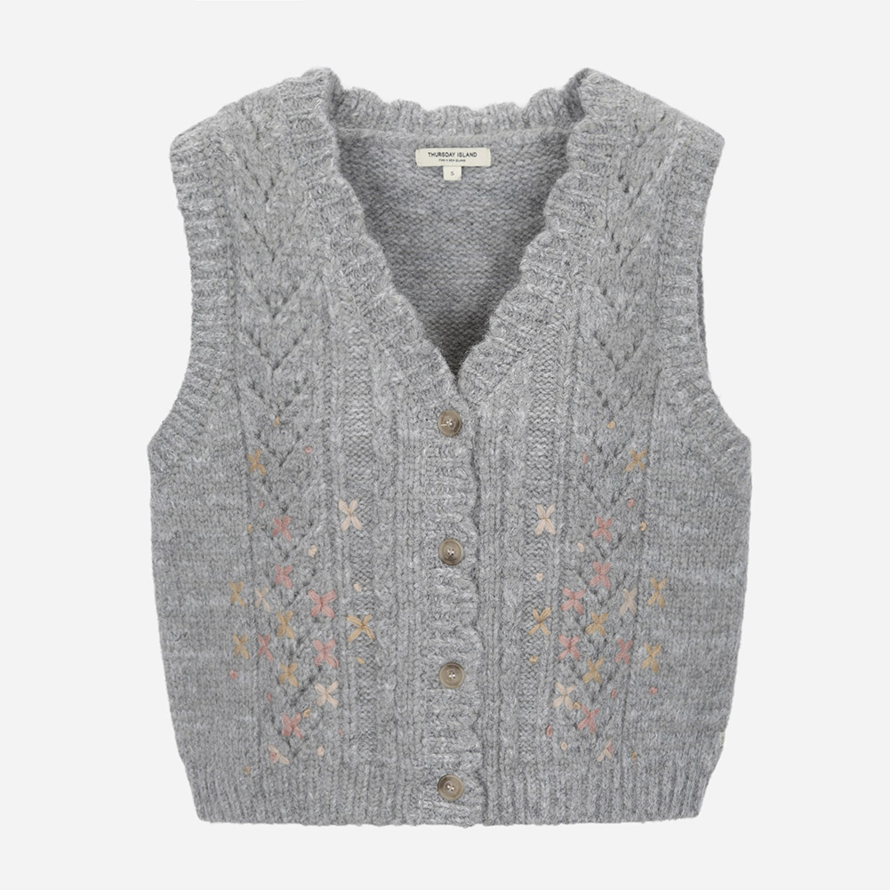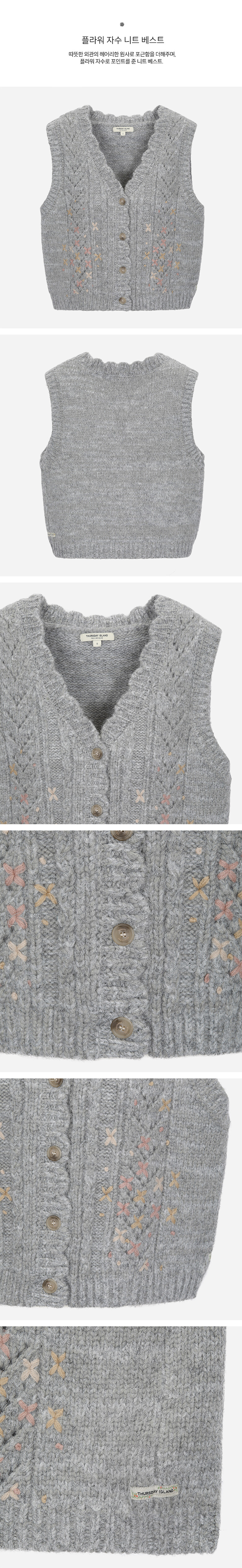 따뜻한 외관의 헤어리한 원사로 포근함을 더해주며,플라워 자수로 포인트를 준 니트 베스트.