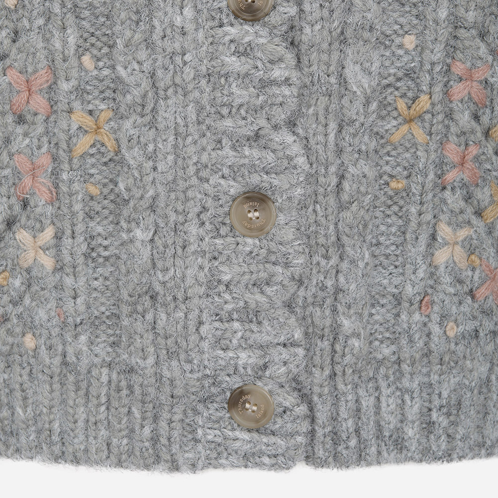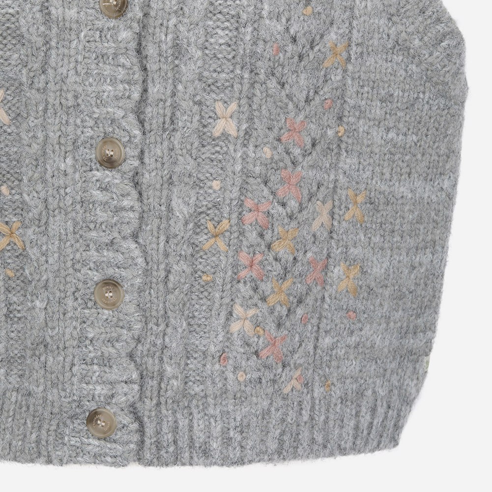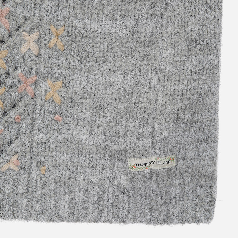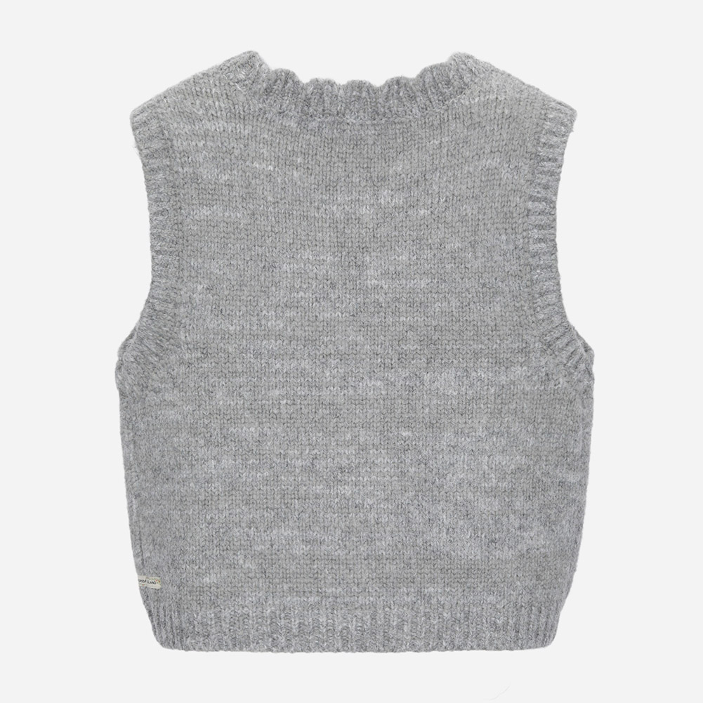 따뜻한 외관의 헤어리한 원사로 포근함을 더해주며,플라워 자수로 포인트를 준 니트 베스트.