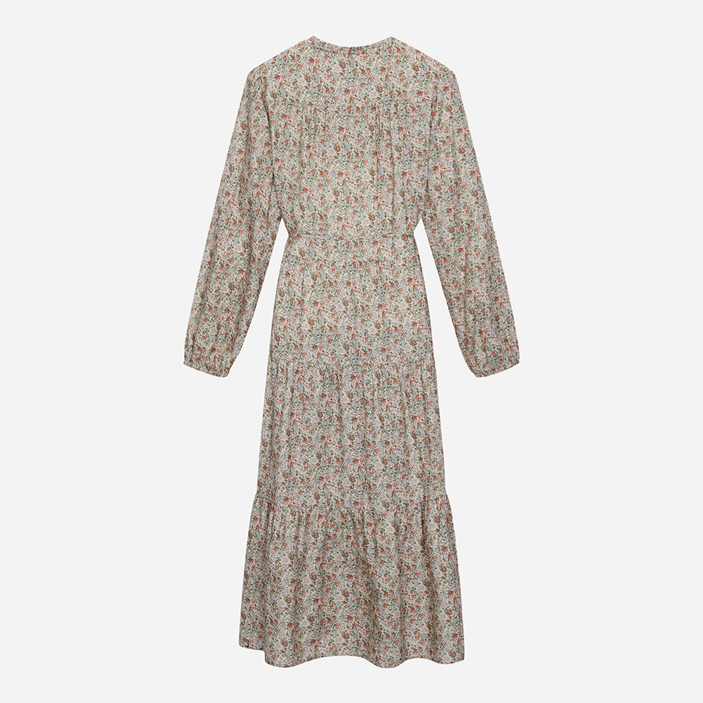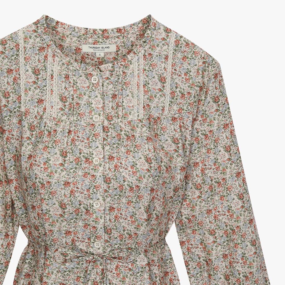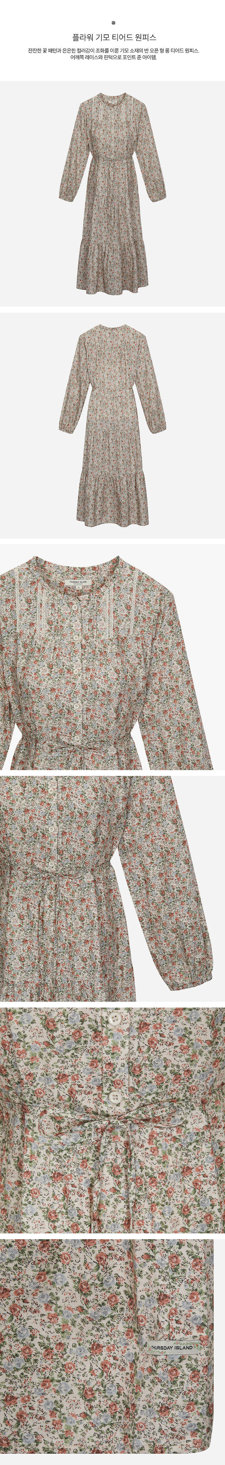 잔잔한 꽃 패턴과 은은한 컬러감이 조화를 이룬 기모 소재의 반 오픈 형 롱 티어드 원피스.어깨쪽 레이스와 핀턱으로 포인트 준 아이템.