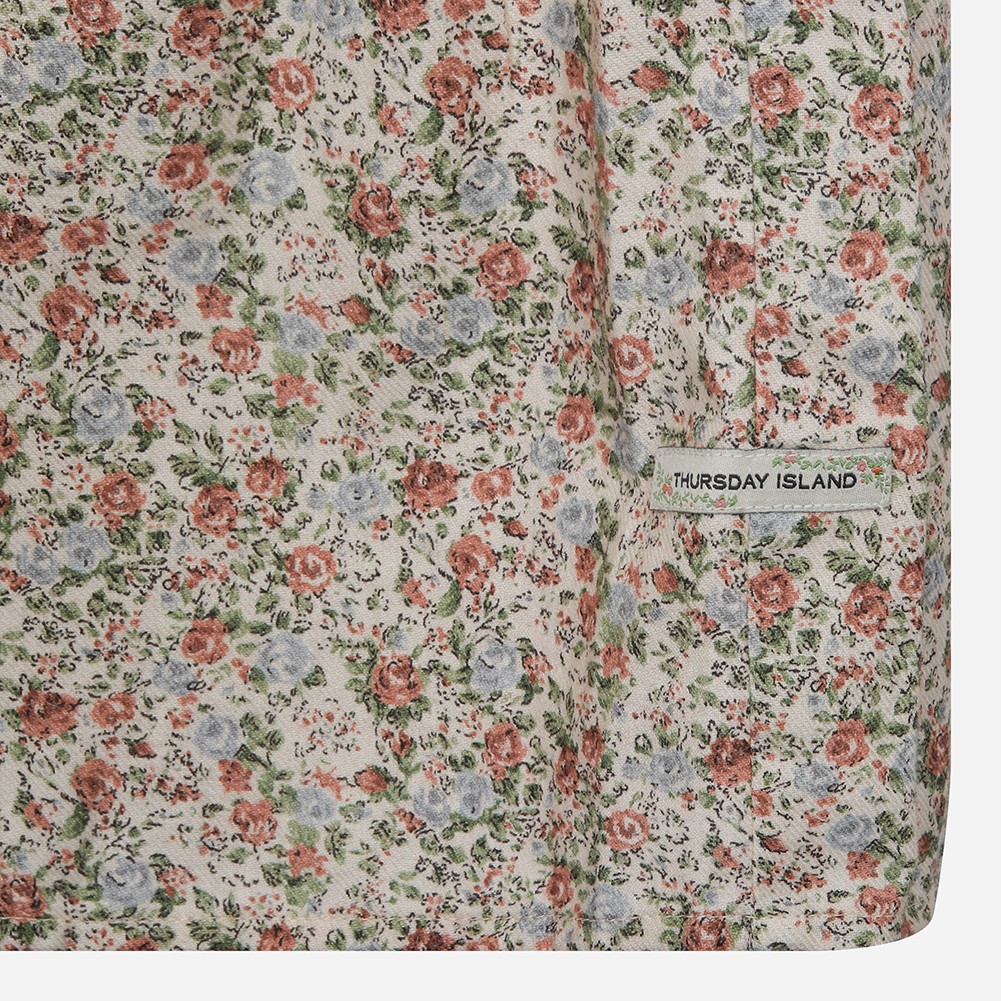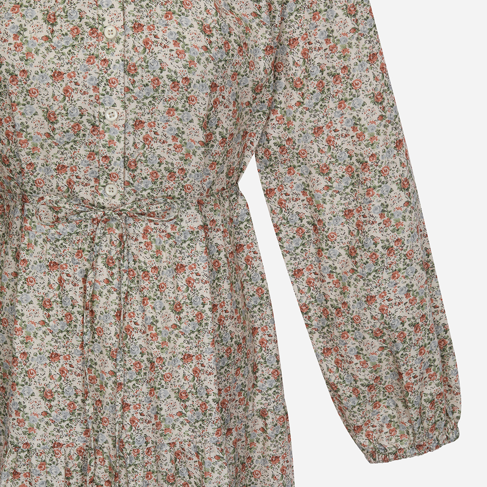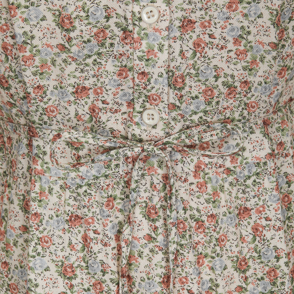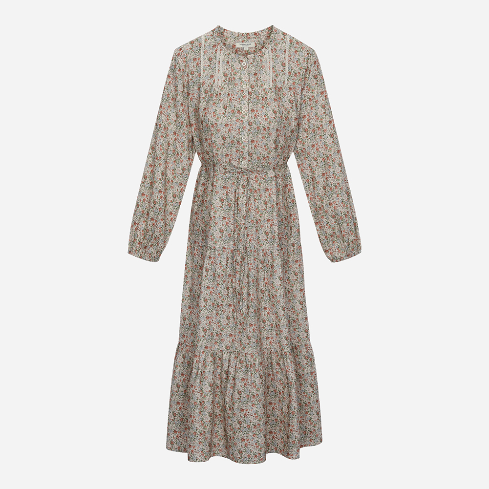 잔잔한 꽃 패턴과 은은한 컬러감이 조화를 이룬 기모 소재의 반 오픈 형 롱 티어드 원피스.어깨쪽 레이스와 핀턱으로 포인트 준 아이템.