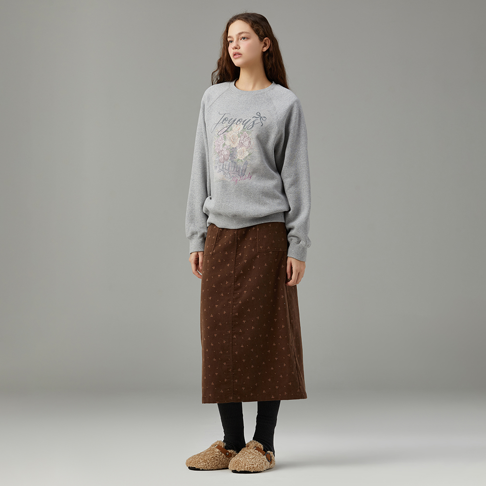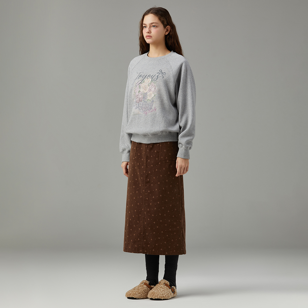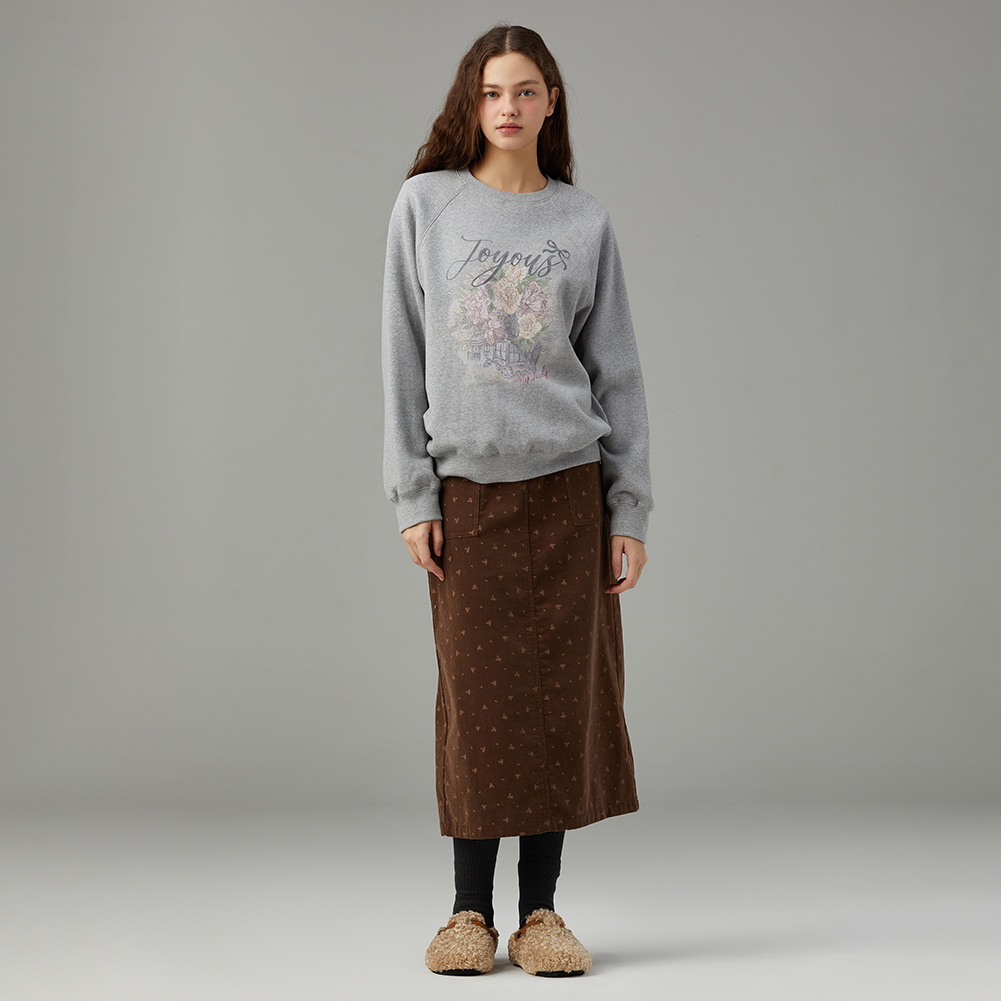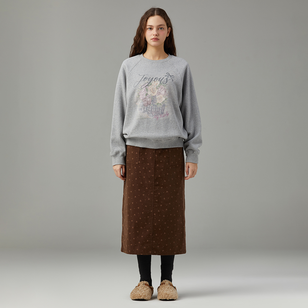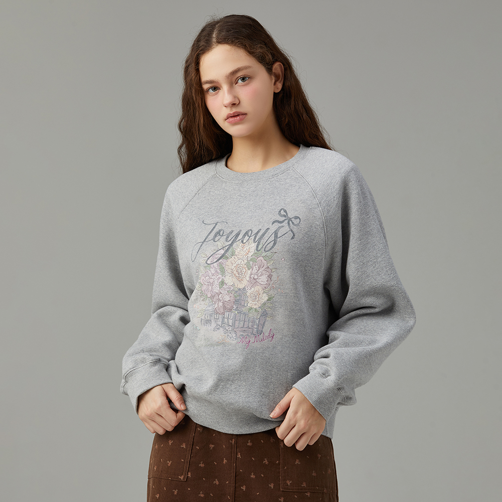 로맨틱한 감성의 플라워 아트웍으로 포인트를 준 스웻셔츠.엉덩이를 덮는 기장감으로 편안하게 착용 가능하며,내면이 기모로 되어있어 보온성이 좋은 아이템.