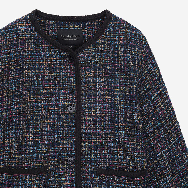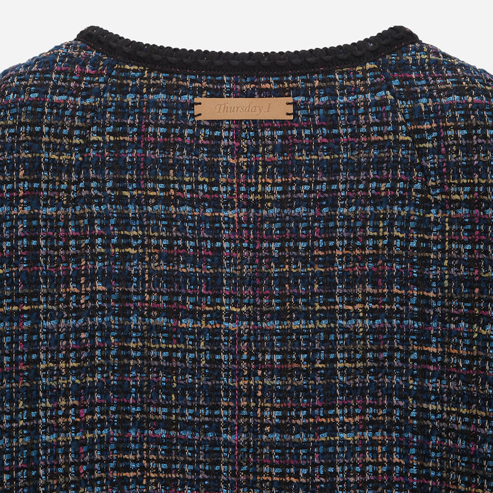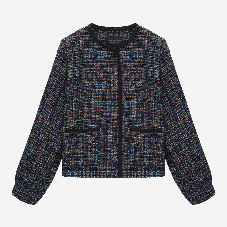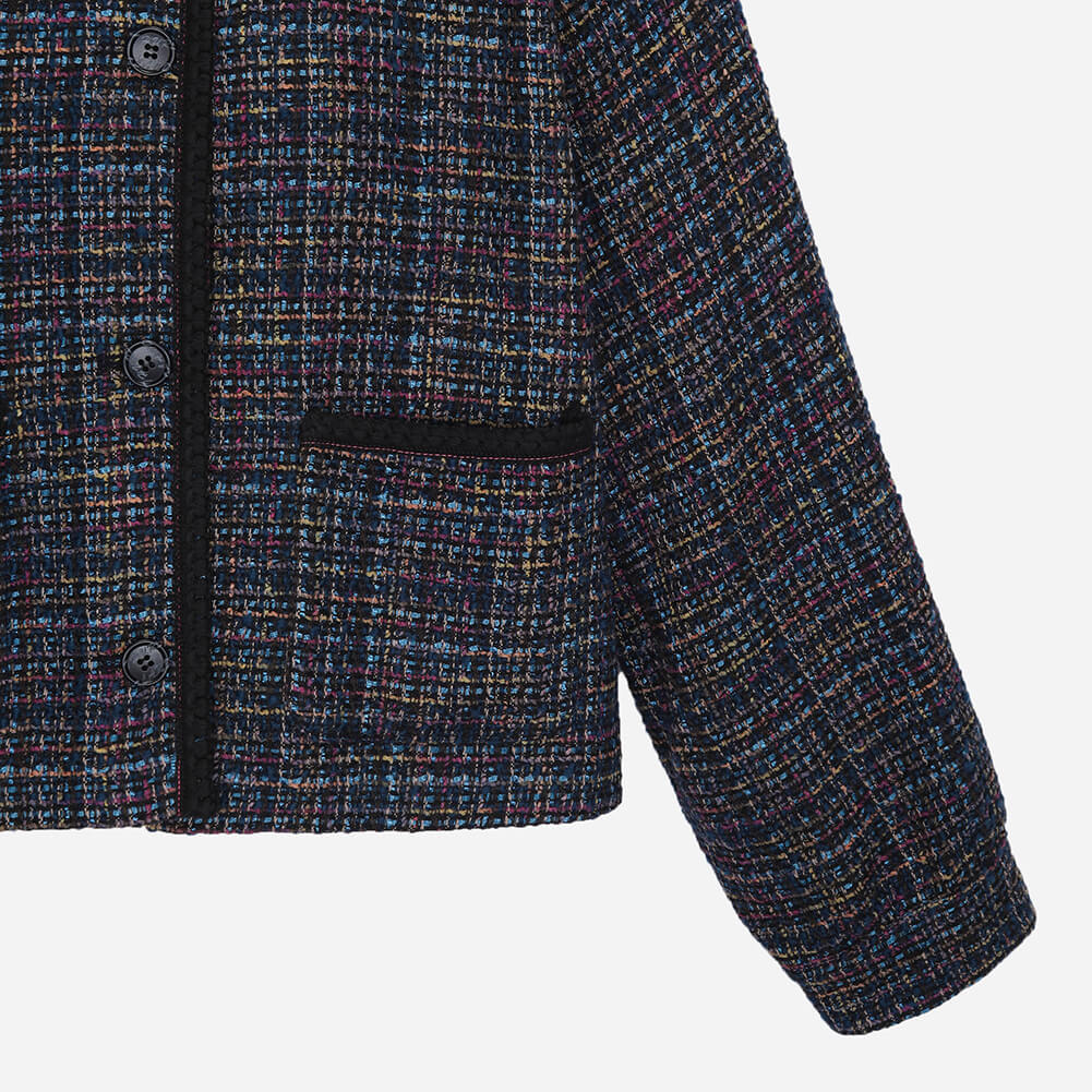배색 파이핑과 멀티 컬러 트위드가 포인트인 자켓.