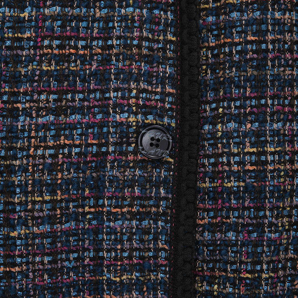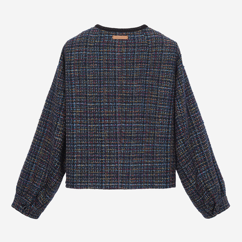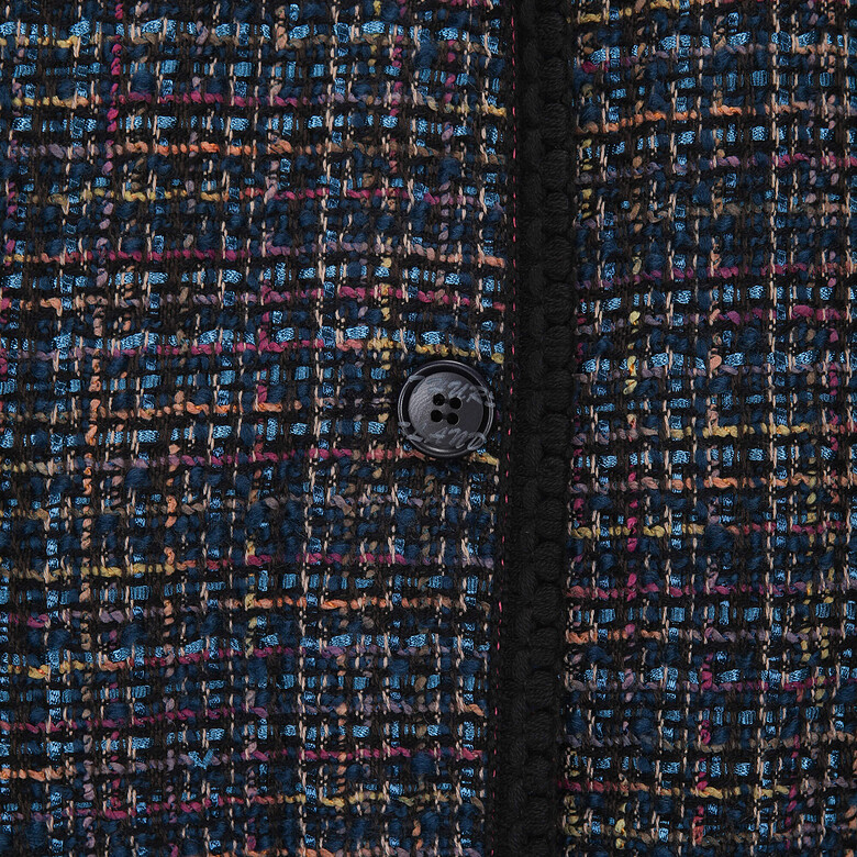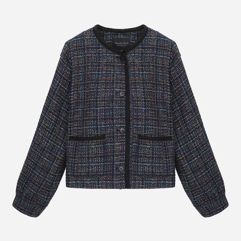 배색 파이핑과 멀티 컬러 트위드가 포인트인 자켓.