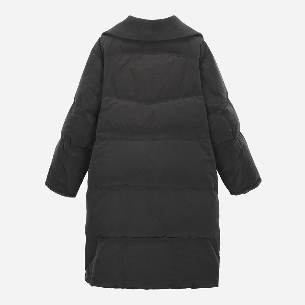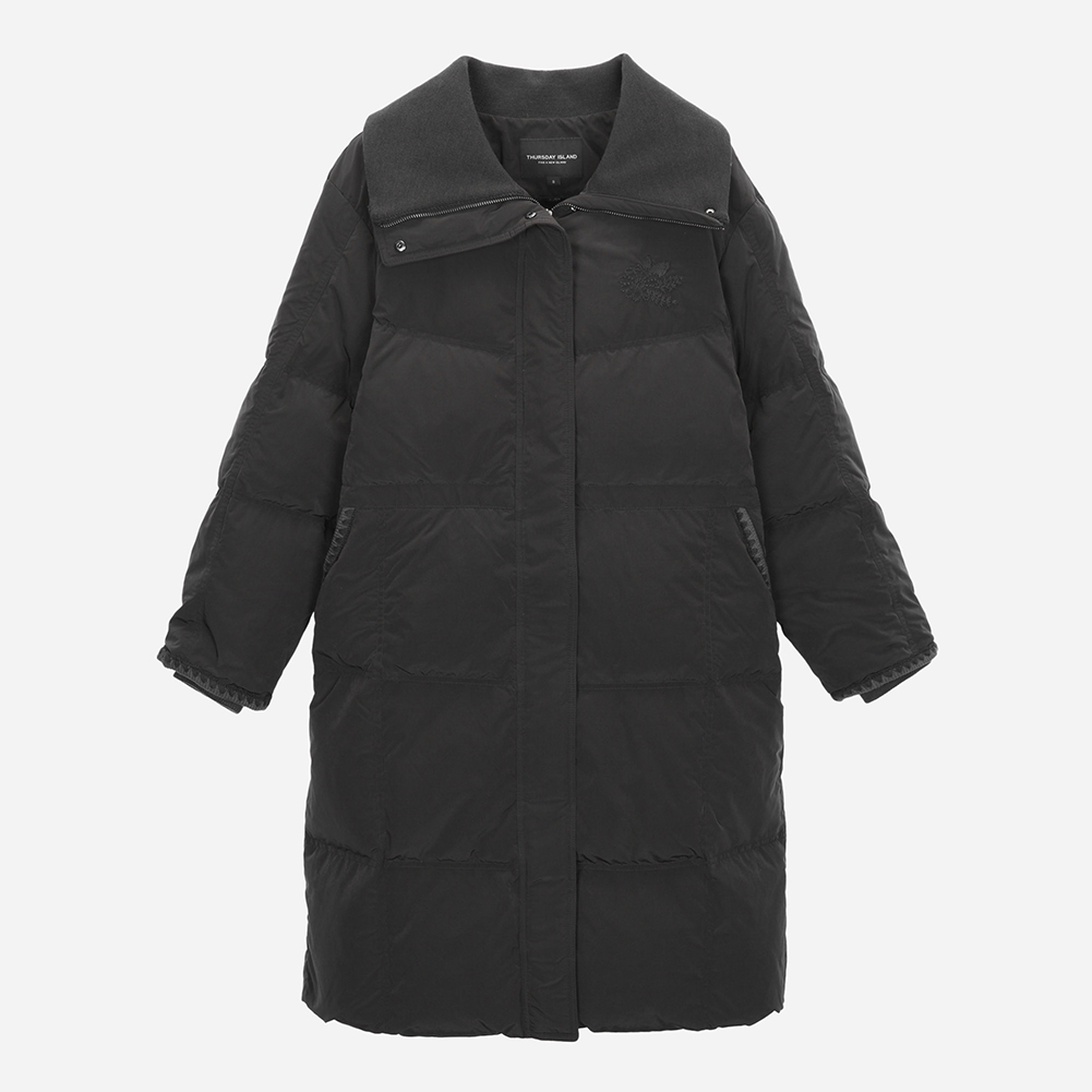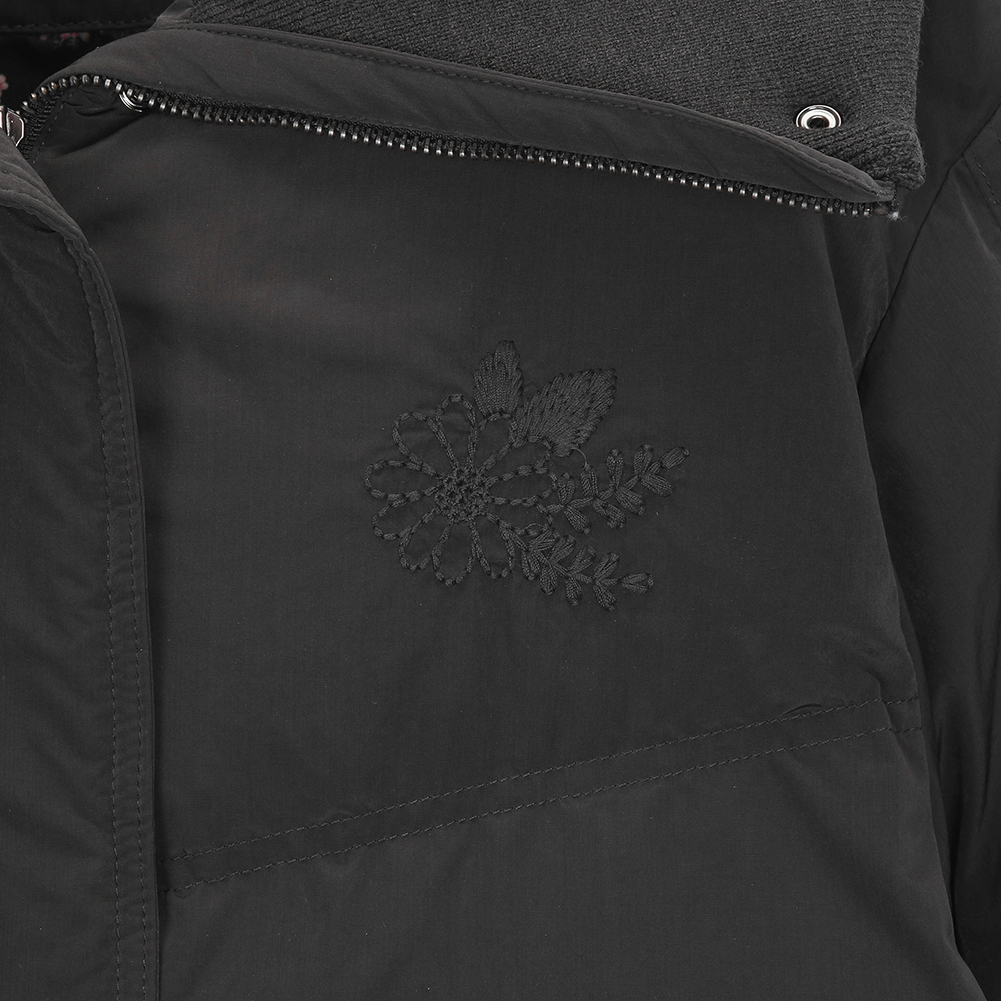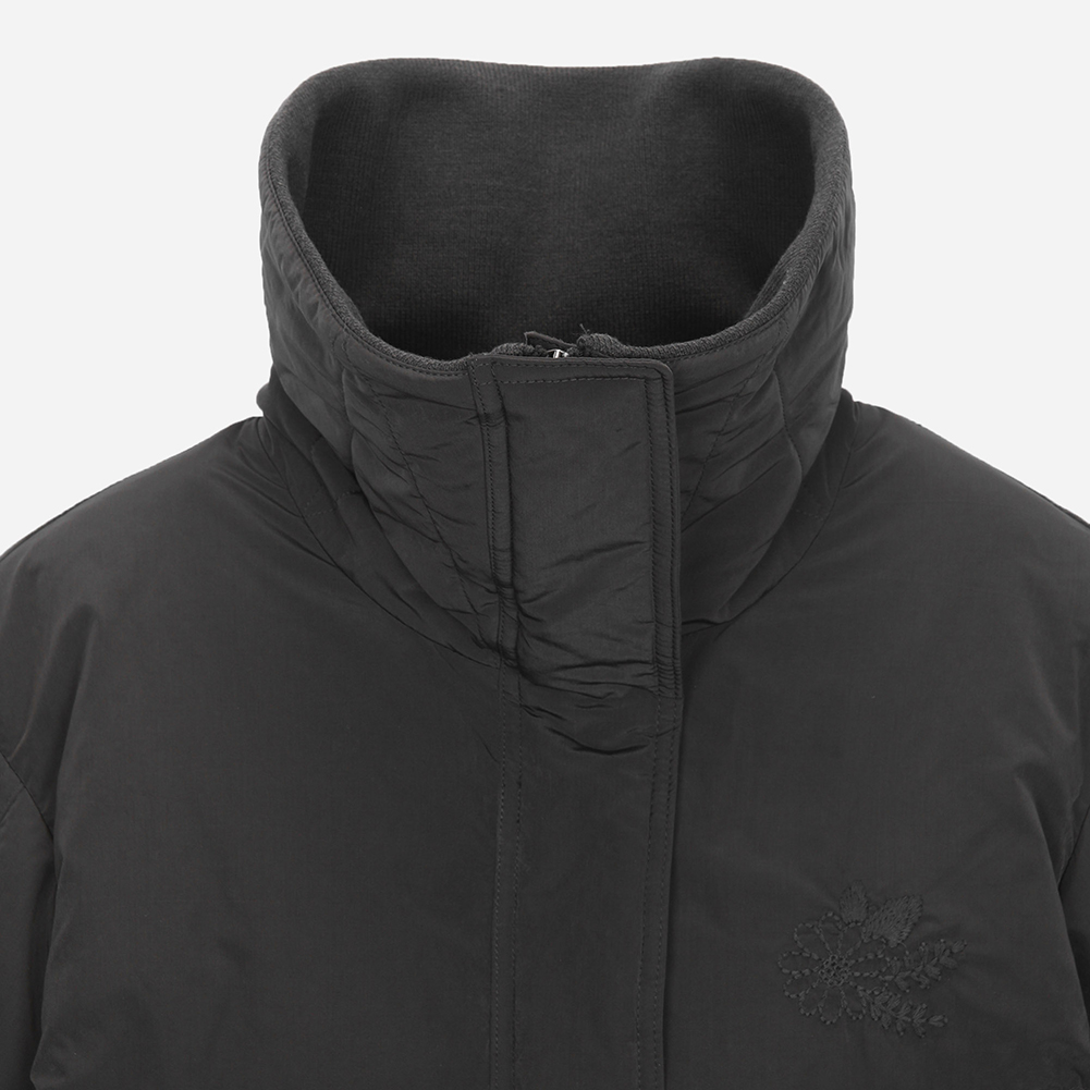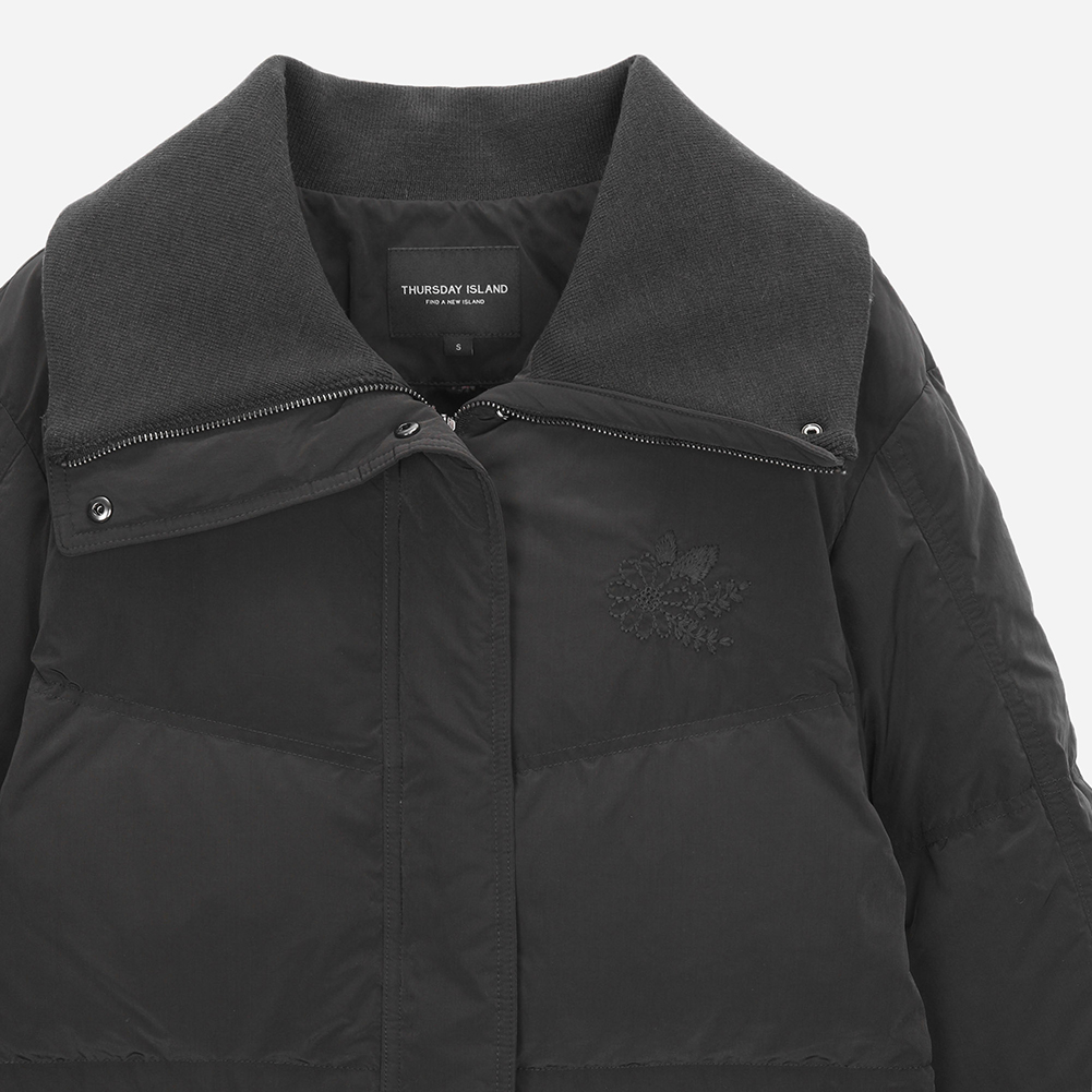 네크에 니트 배색이 들어간 덕 다운 점퍼.상동의 플라워 자수와 포켓,소매에 접밴드 자수로 포인트를 준 아이템.롱 기장의 넉넉한 실루엣으로 허리쪽