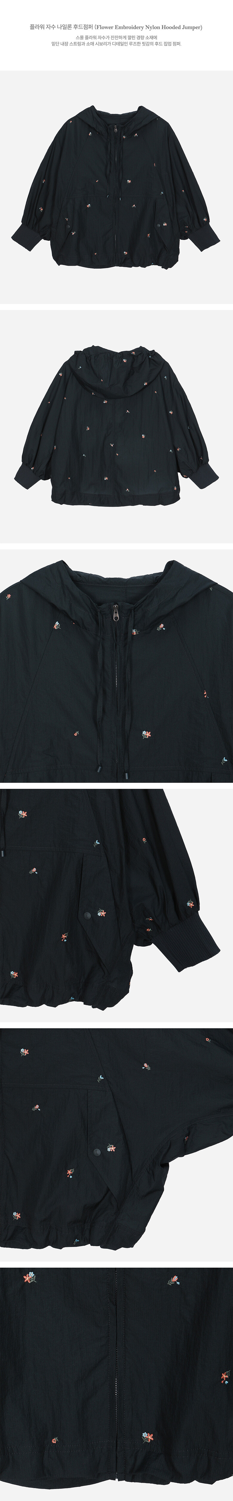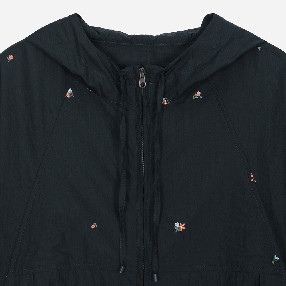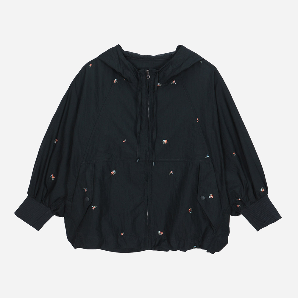 스몰 플라워 자수가 잔잔하게 깔린 경량 소재에 밑단 내장 스트링과 소매 시보리가 디테일인 루즈한 핏감의 후드 집업 점퍼.