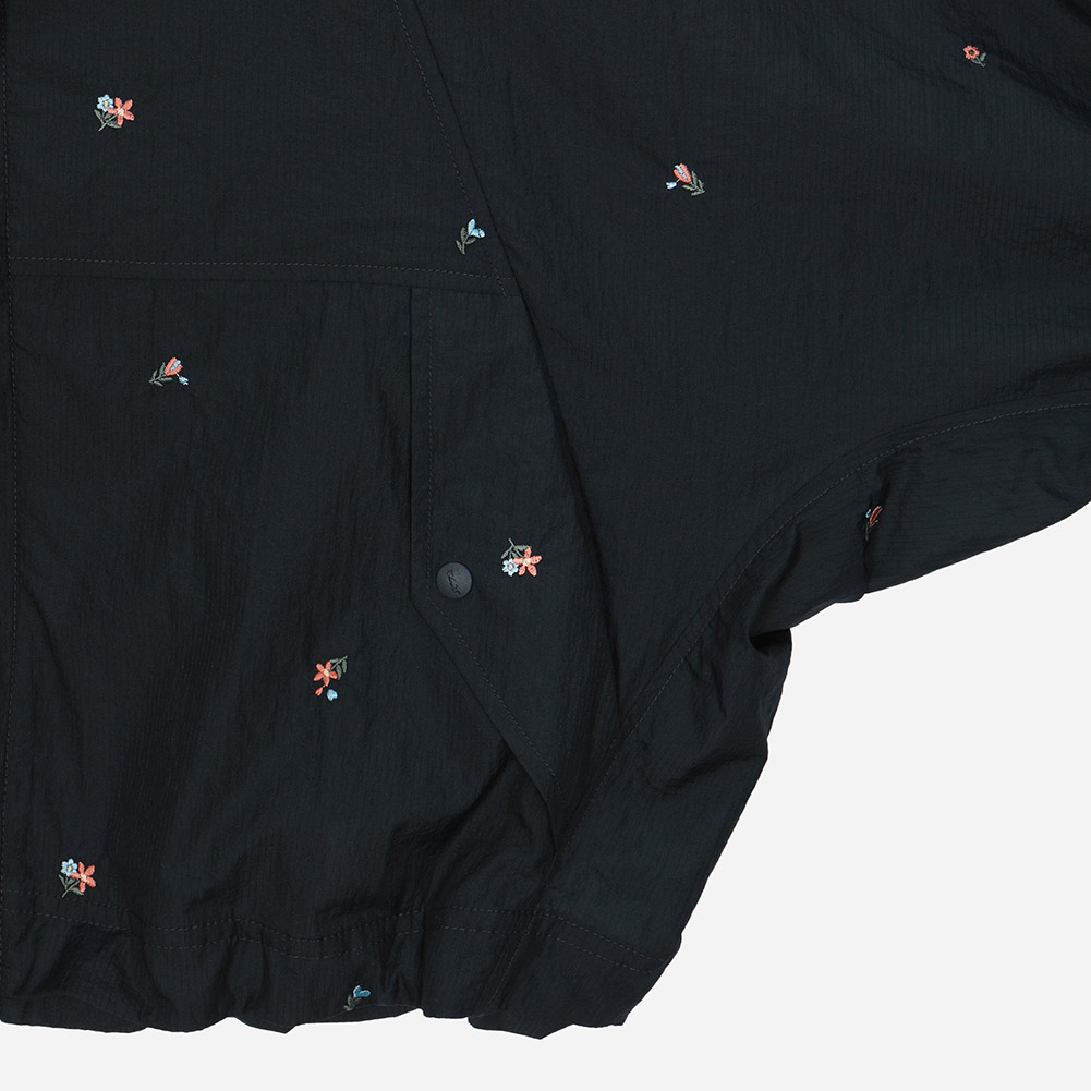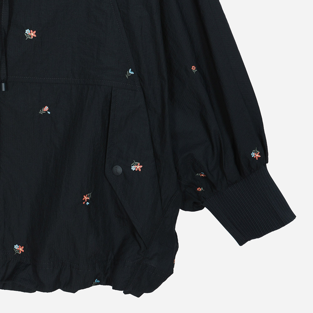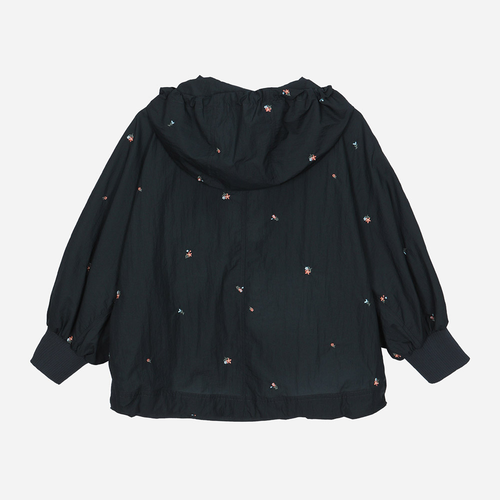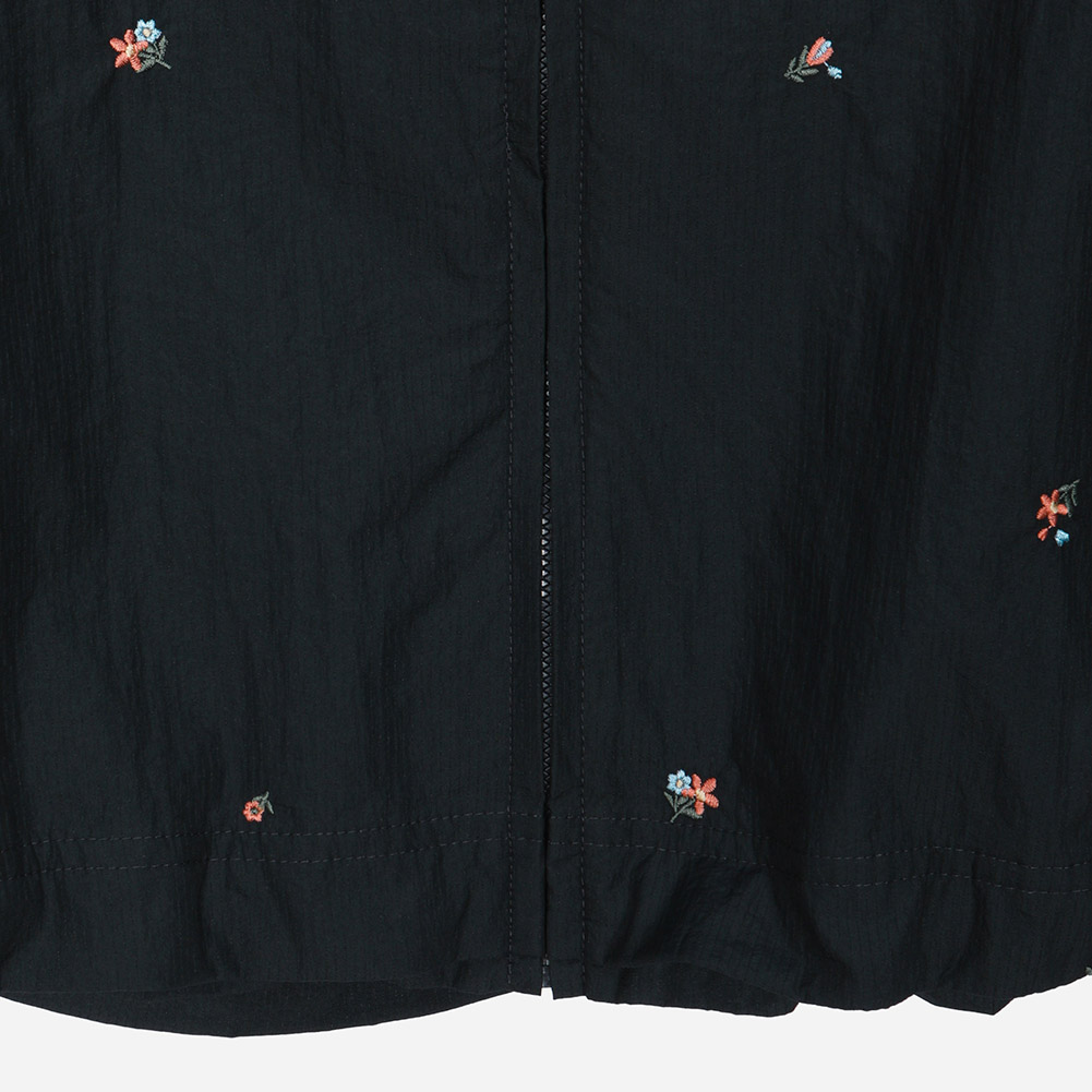 스몰 플라워 자수가 잔잔하게 깔린 경량 소재에 밑단 내장 스트링과 소매 시보리가 디테일인 루즈한 핏감의 후드 집업 점퍼.