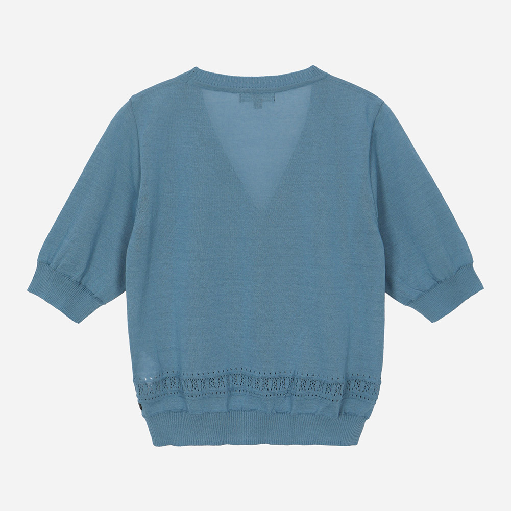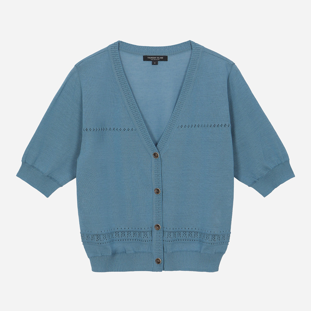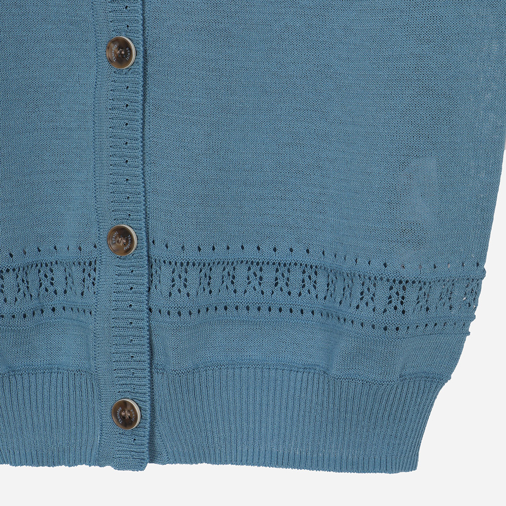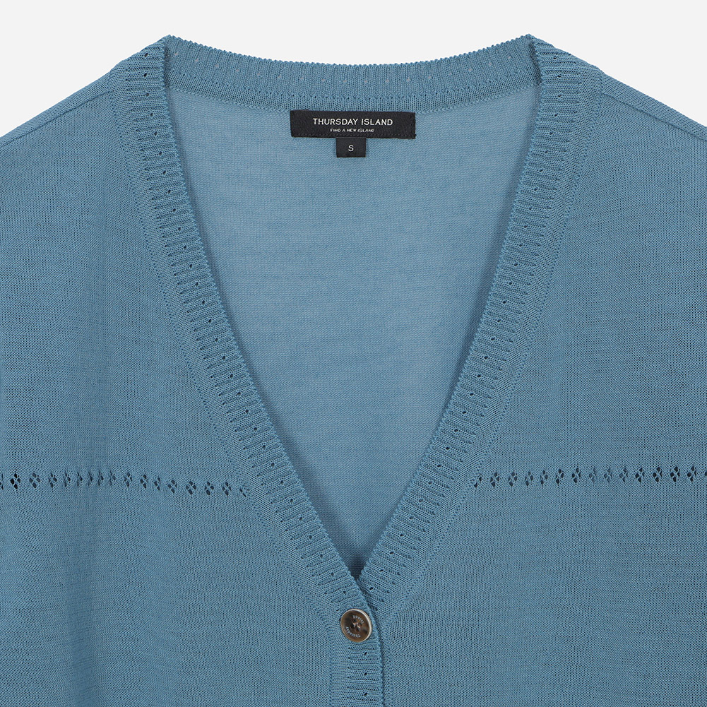 밑단 리브 마감 위 잔잔한 스카시 조직으로 포인트를 준 니트 가디건.얇고 부드러운 터치감으로 편안한 착용감을 전해주는 아이템.