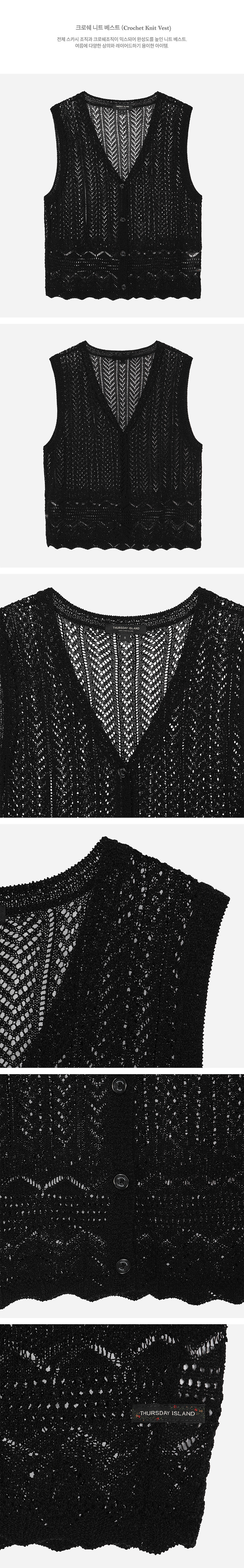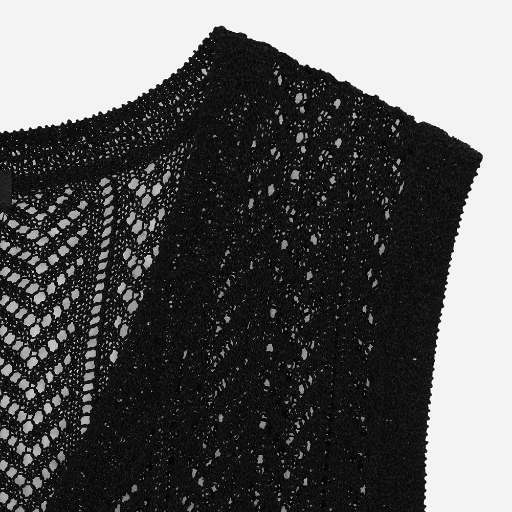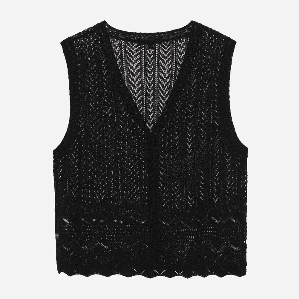 전체 스카시 조직과 크로쉐조직이 믹스되어 완성도를 높인 니트 베스트.여름에 다양한 상의와 레이어드하기 용이한 아이템.