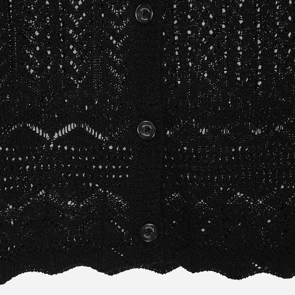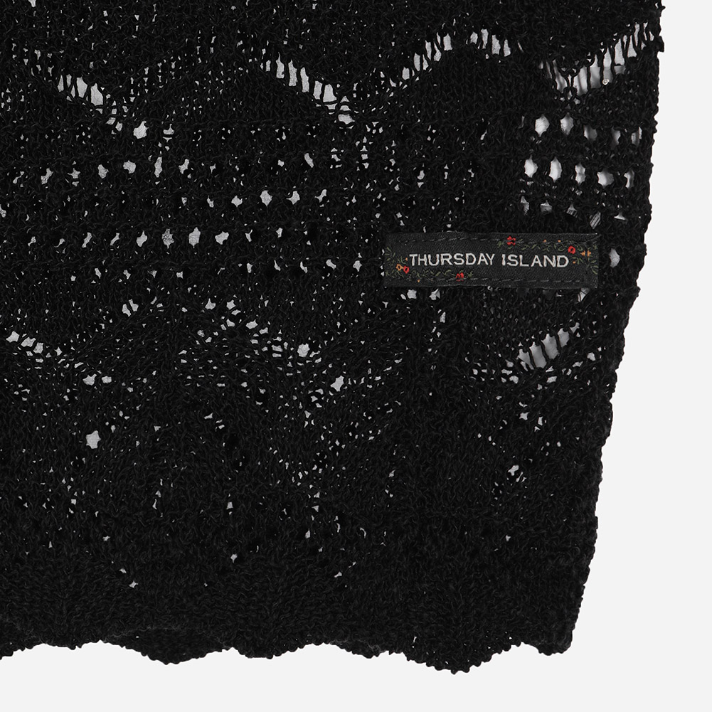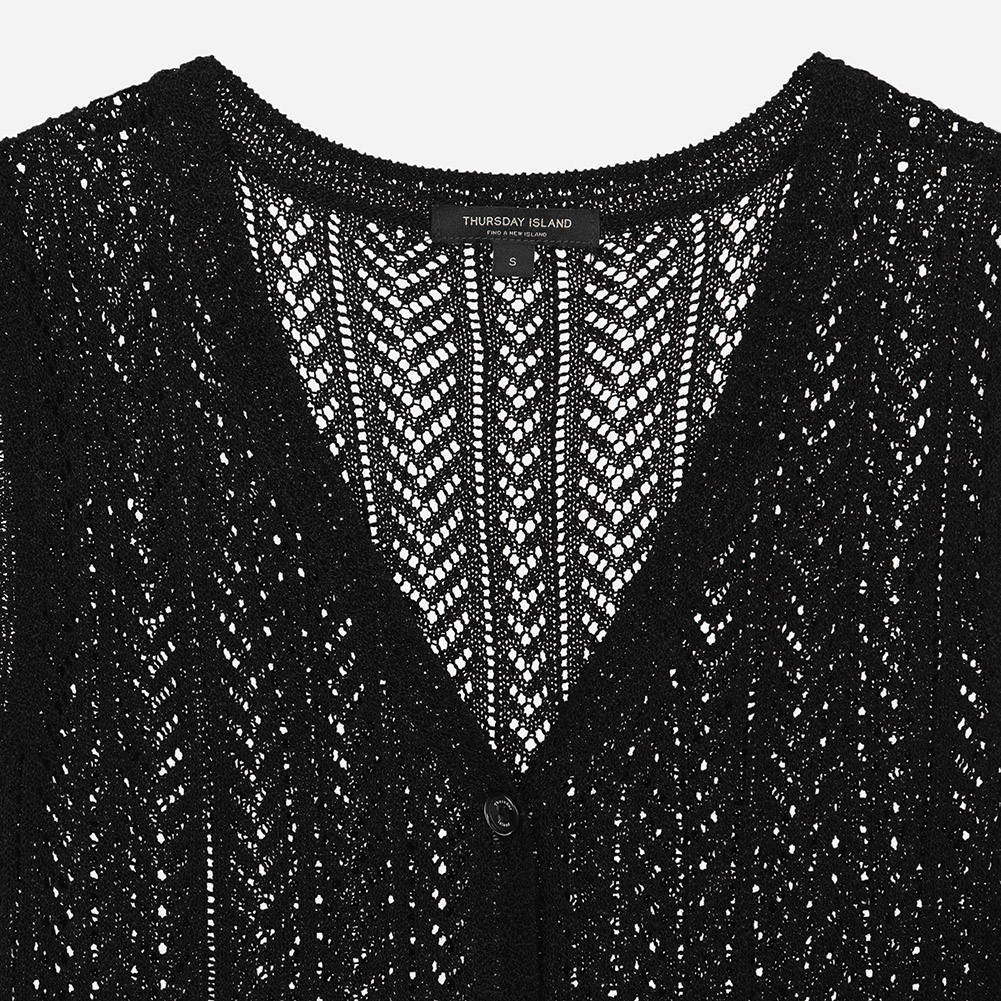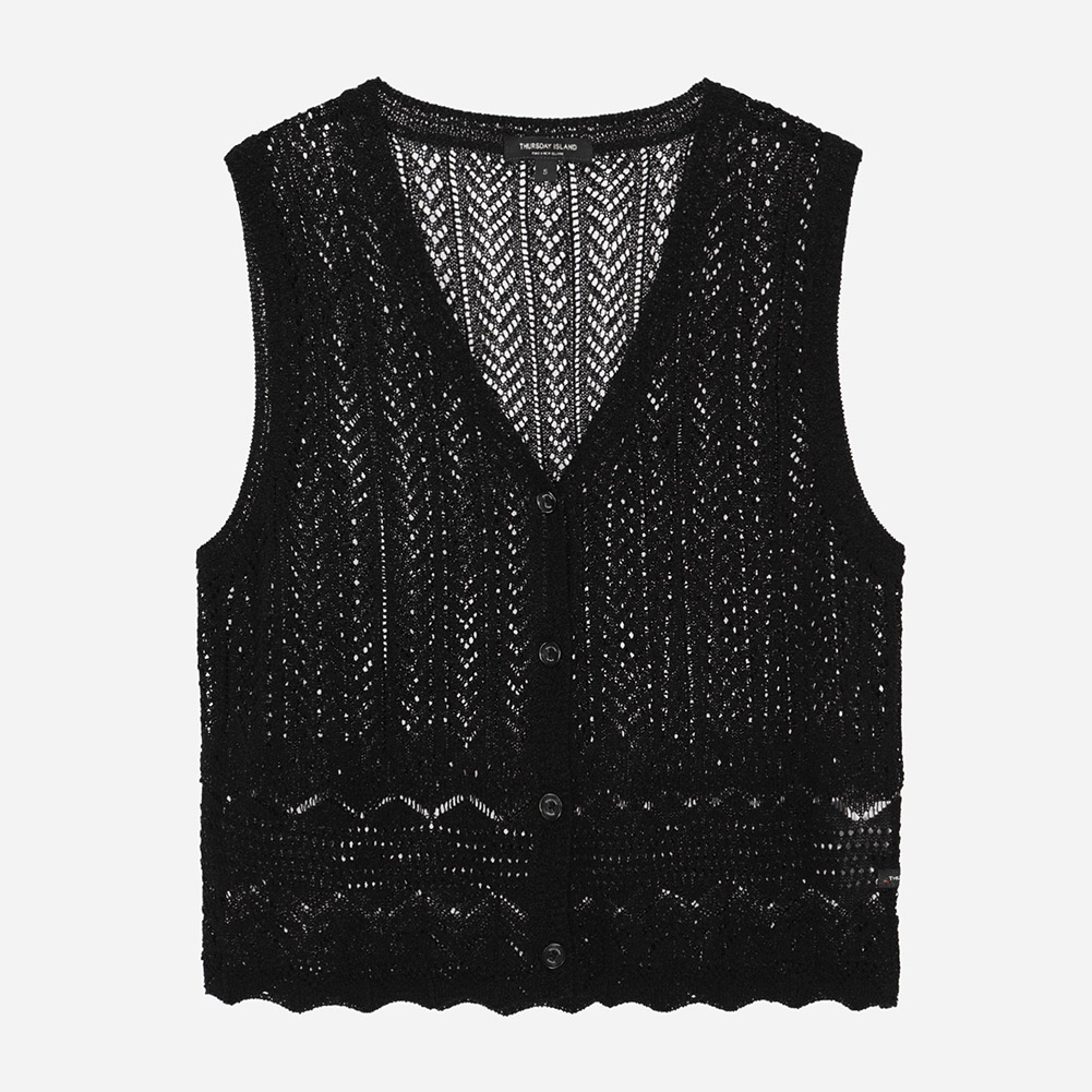 전체 스카시 조직과 크로쉐조직이 믹스되어 완성도를 높인 니트 베스트.여름에 다양한 상의와 레이어드하기 용이한 아이템.
