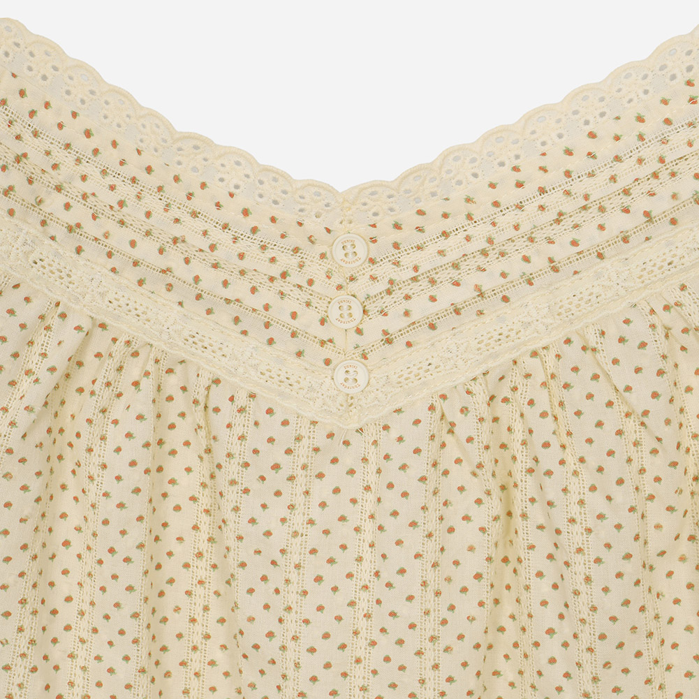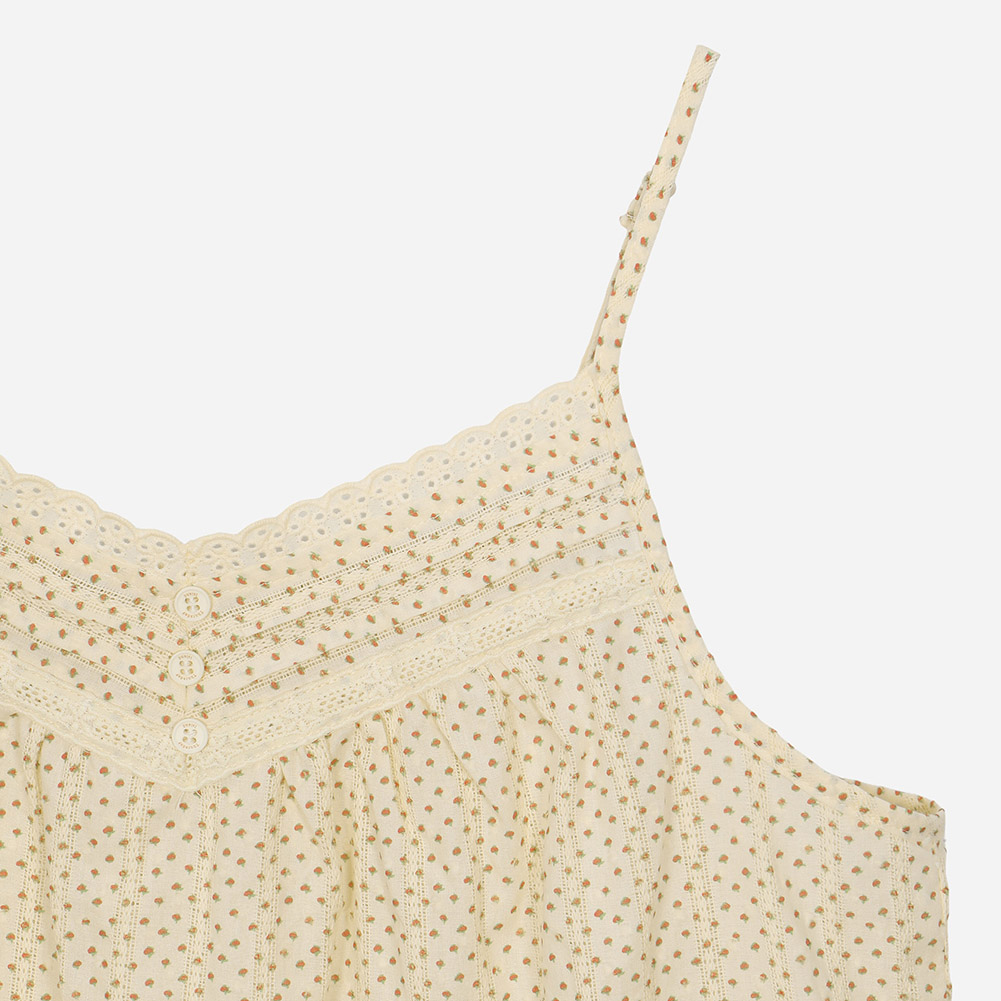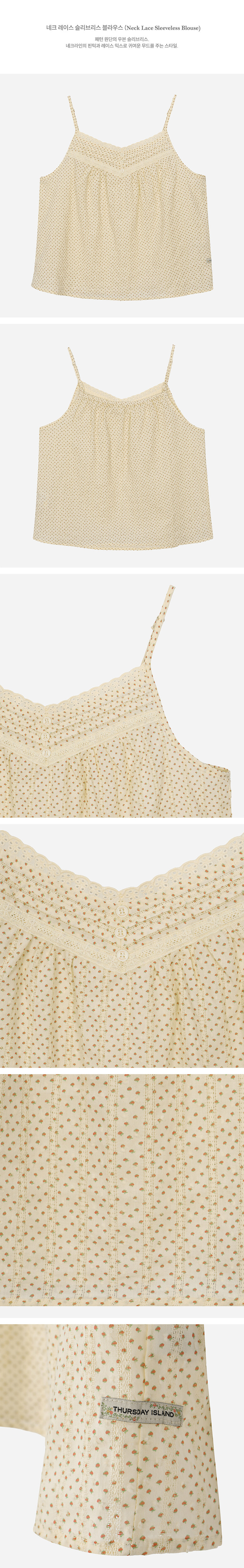 패턴 원단의 우븐 슬리브리스.네크라인의 핀턱과 레이스 믹스로 귀여운 무드를 주는 스타일.