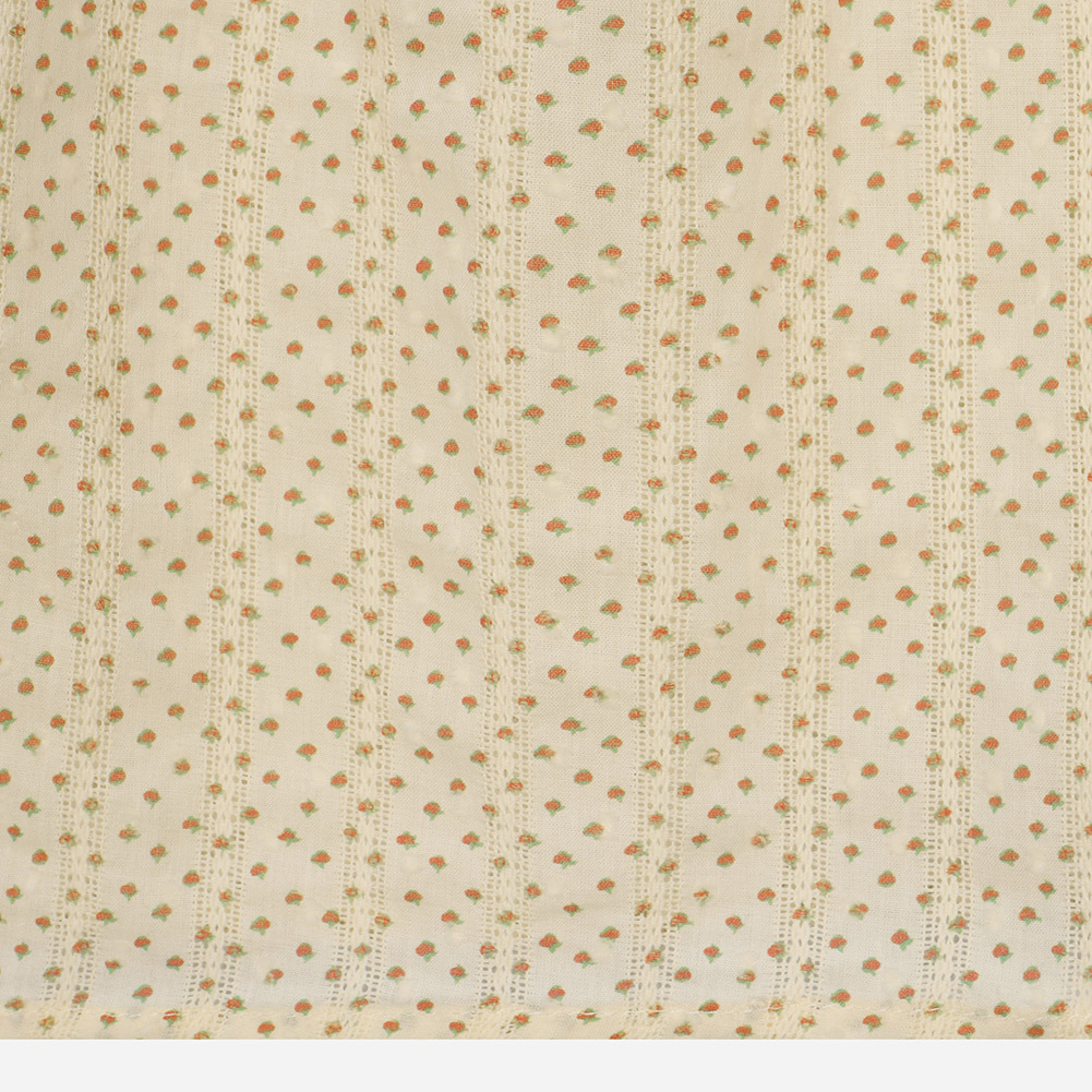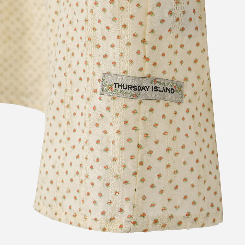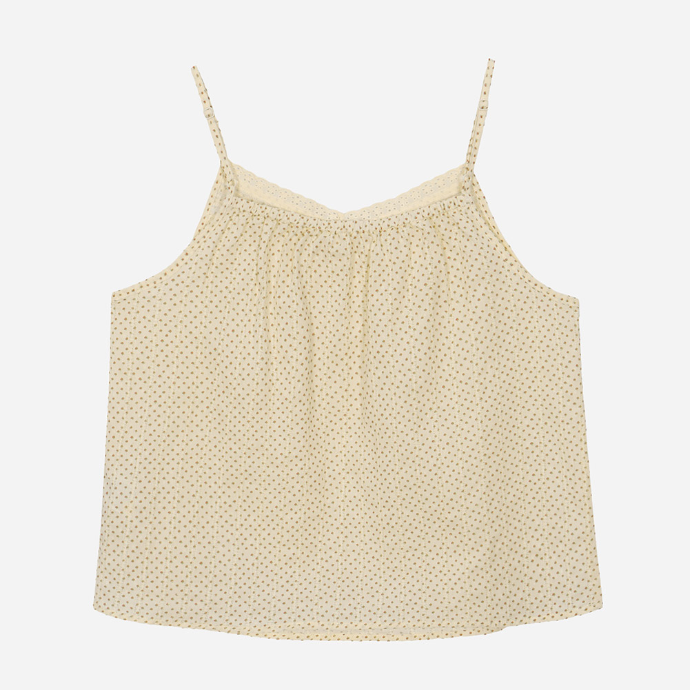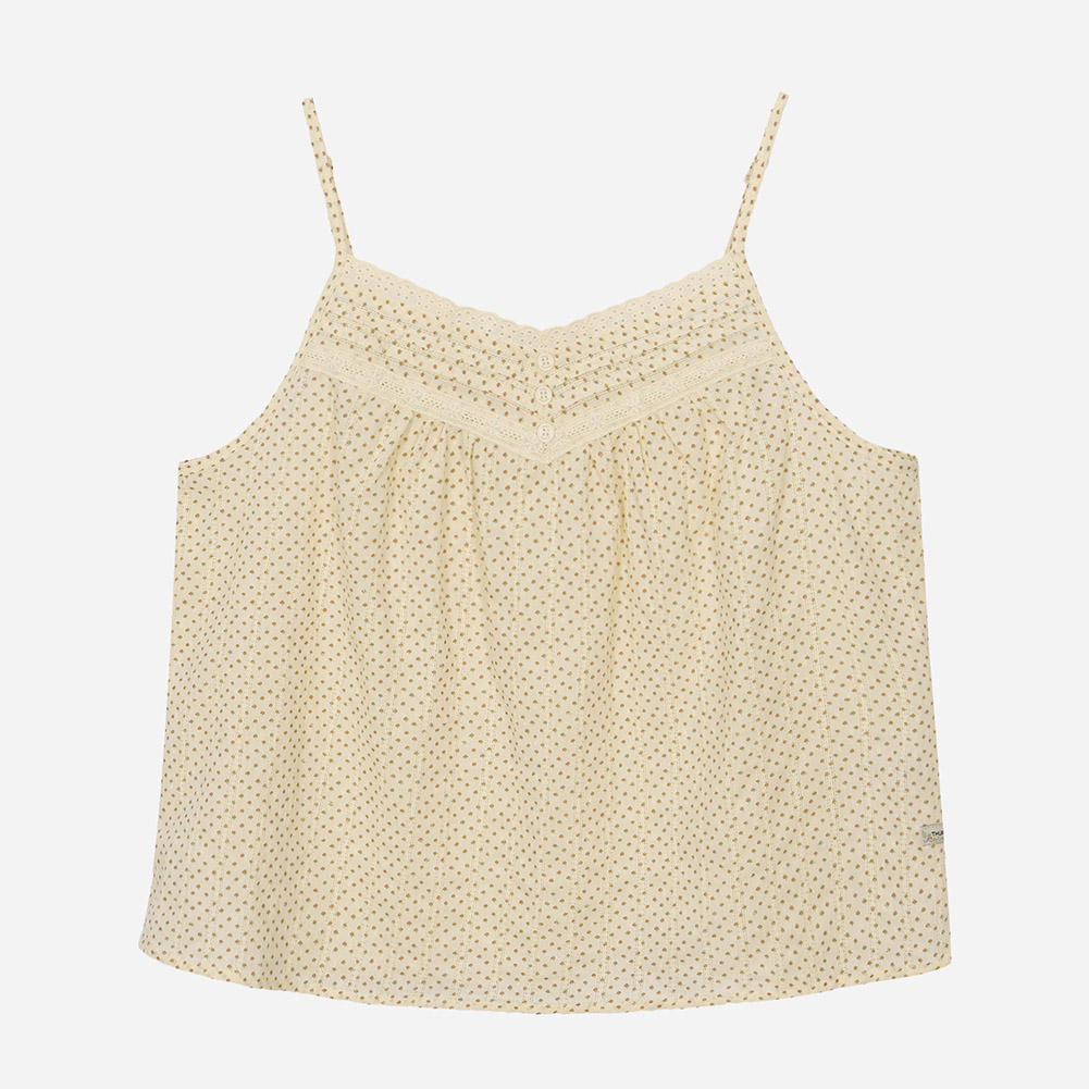 패턴 원단의 우븐 슬리브리스.네크라인의 핀턱과 레이스 믹스로 귀여운 무드를 주는 스타일.