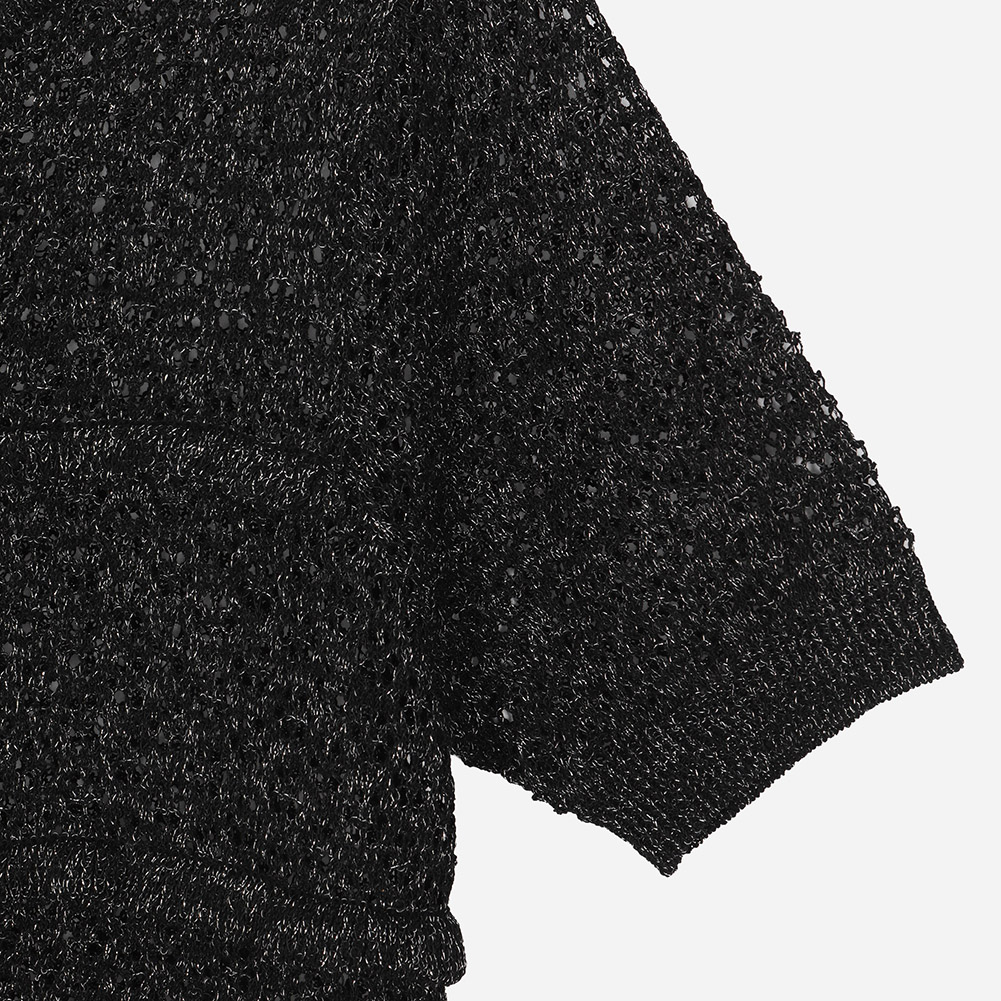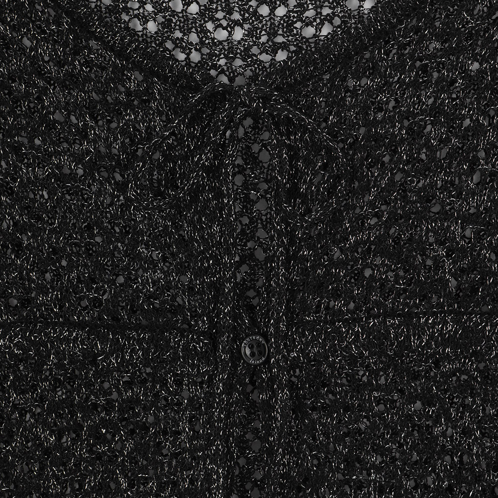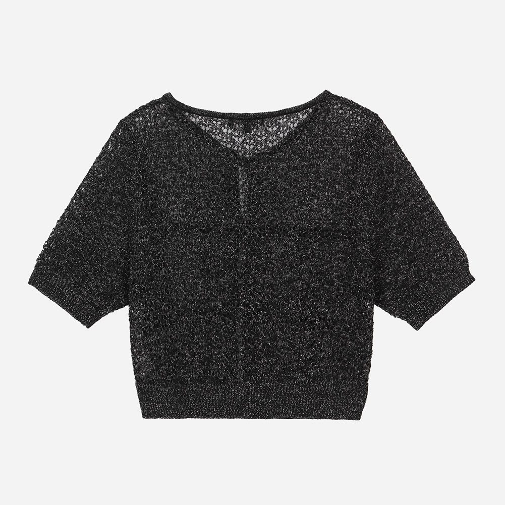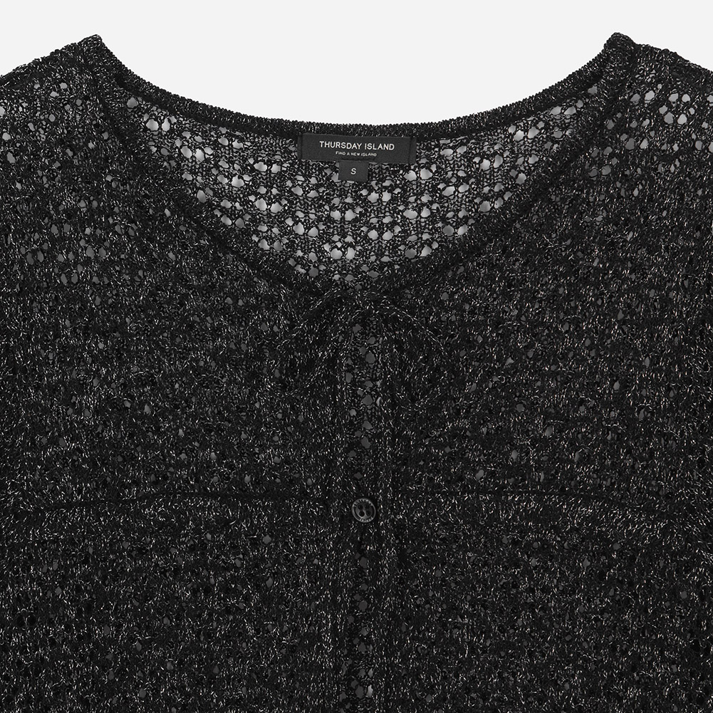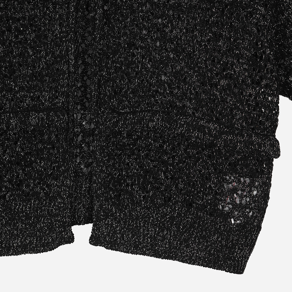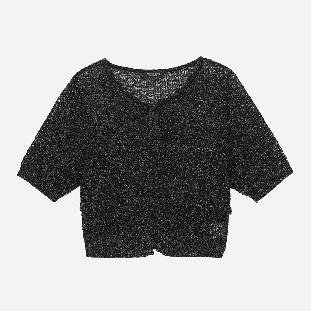 은은한 메탈사가 믹스된 크로쉐조직의 텍스쳐가 돋보이는 니트 가디건.러플 디테일의 포인트가 여성스러운 무드를 주는 아이템.