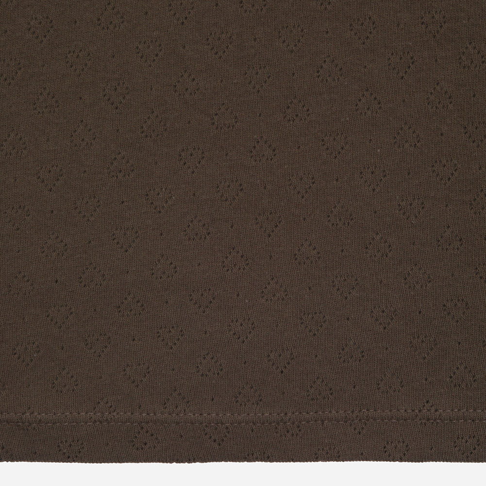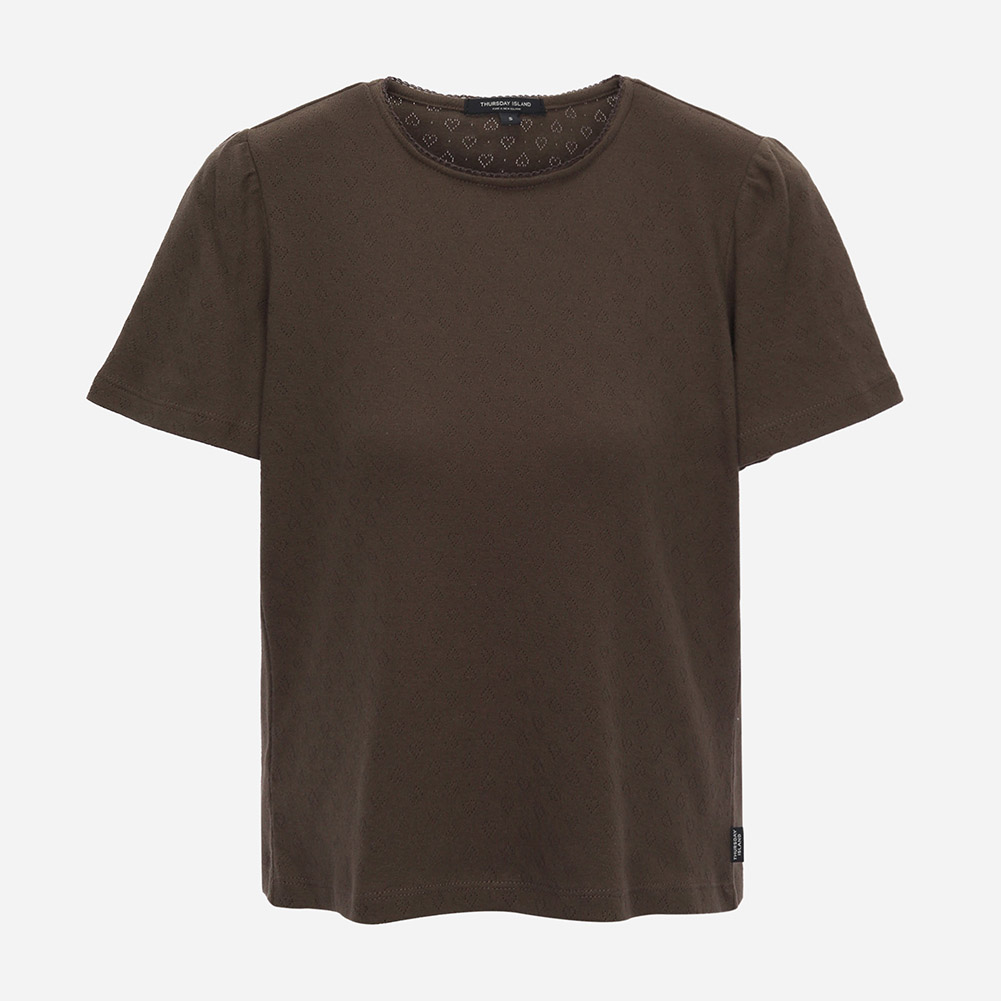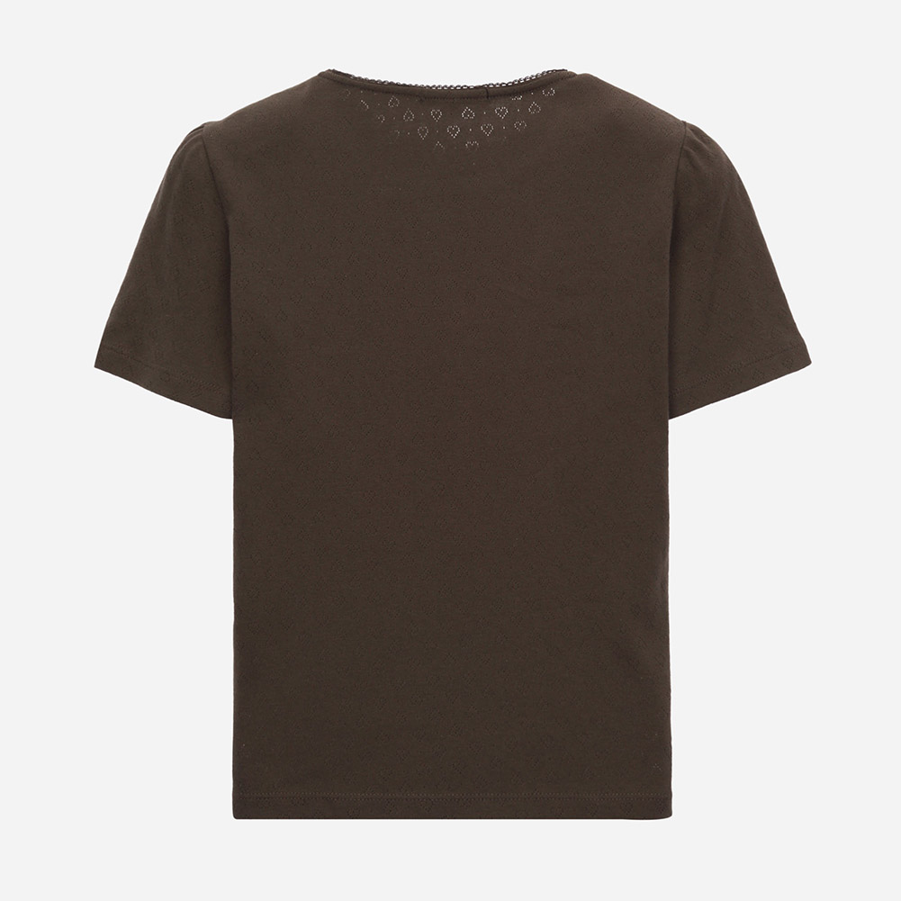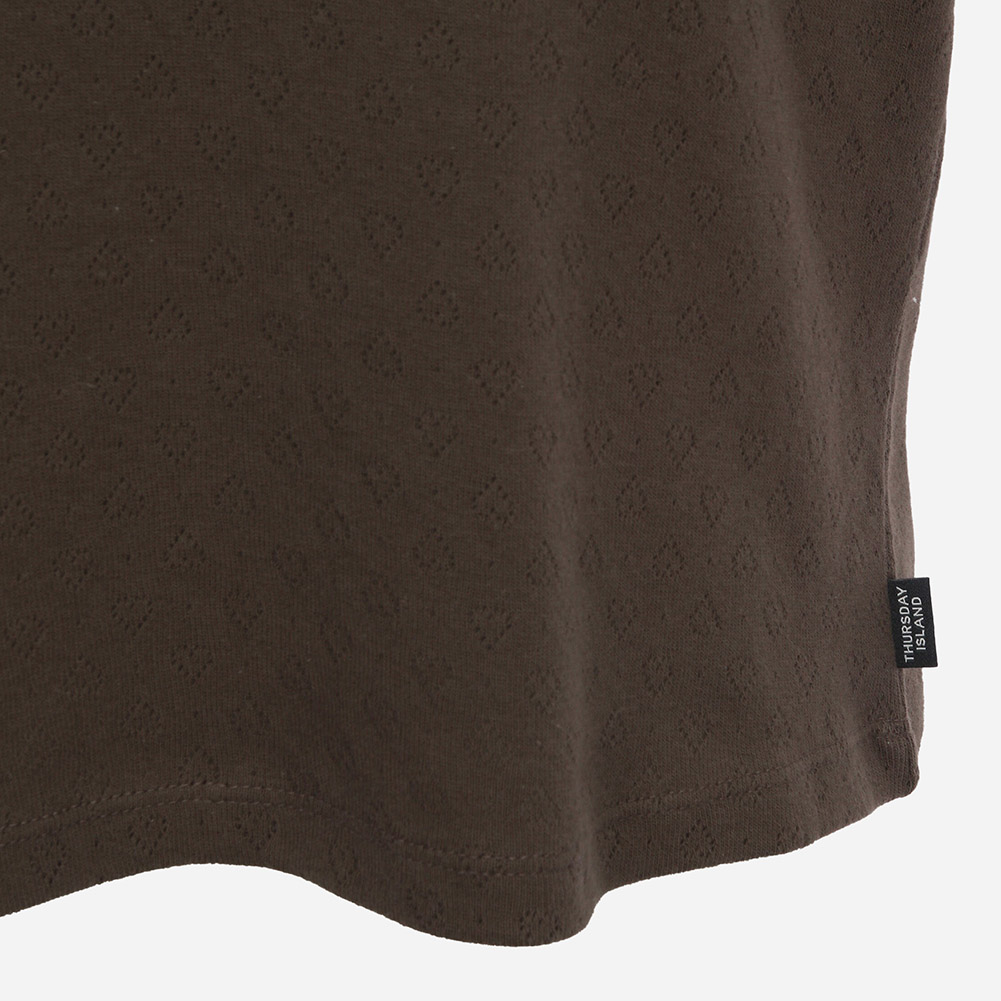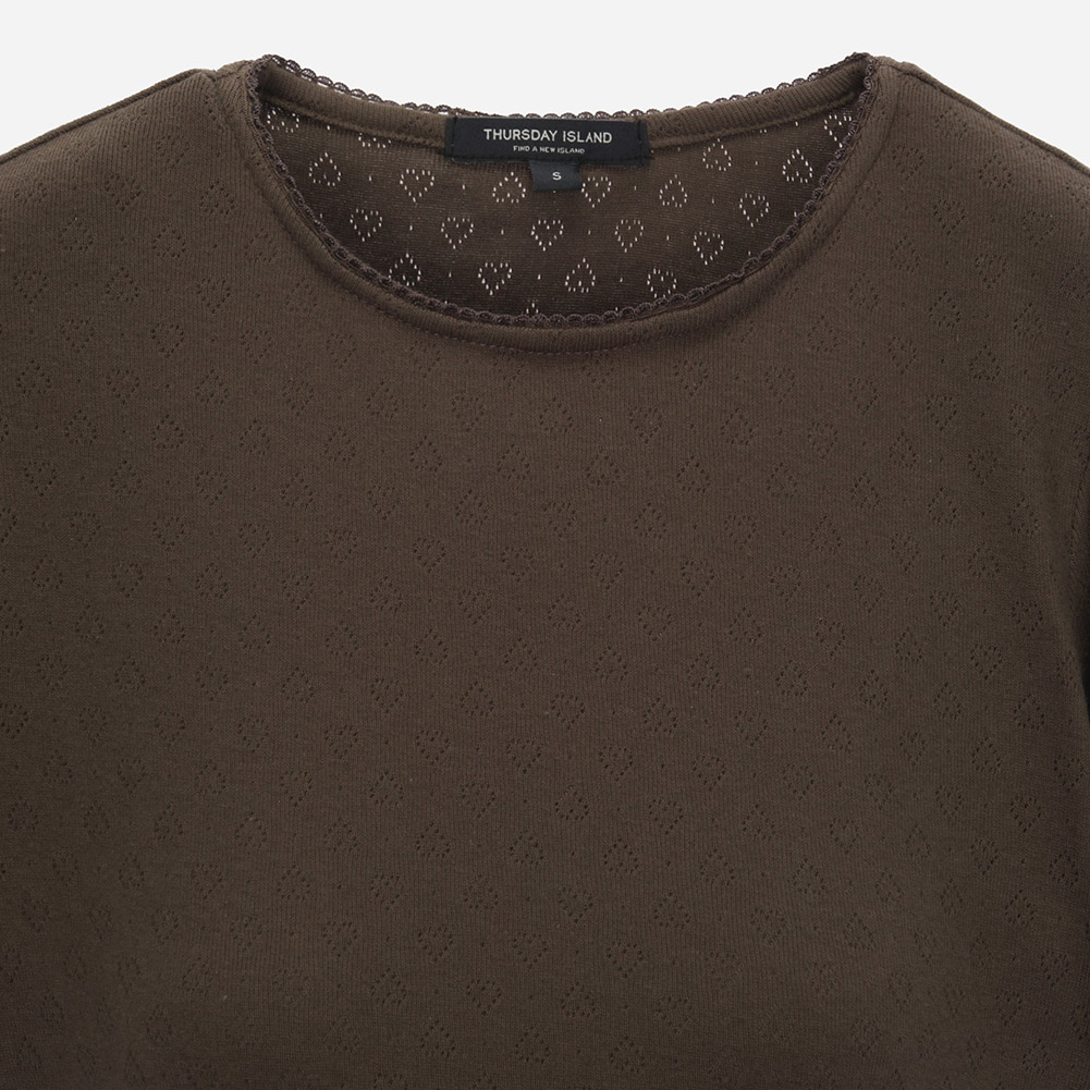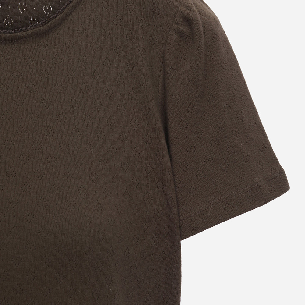 스카시 소재의 라운드 네크 반팔 티셔츠.네크에 레이스가 포인트를 주며,스탠다드핏으로 다양한 상하의와 스타일링이 용이한 아이템.