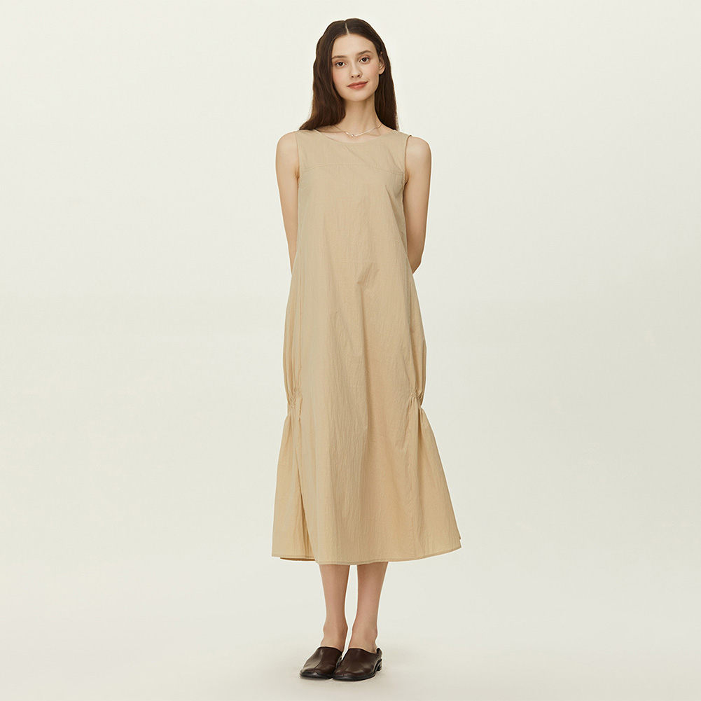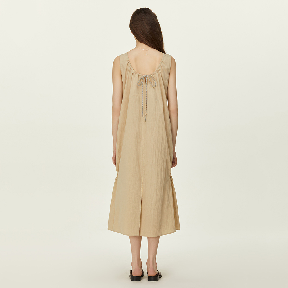 뒷넥라인에 배색스트링을 넣어 다양한 실루엣으로 볼륨감있는 스타일링이 가능한 루즈핏 원피스.