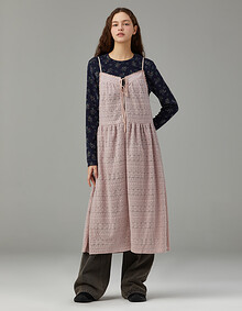 시스루한 레이스와 믹스된 레이어드용 슬리브리스 원피스.여유있는 실루엣으로 다양한 하의와 연출시 롱 블라우스처럼 레이어드가 가능한 스타일.