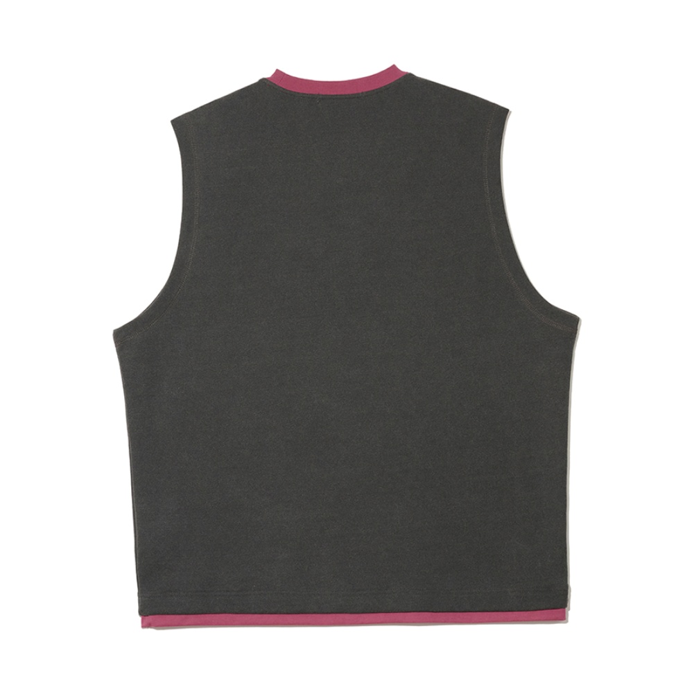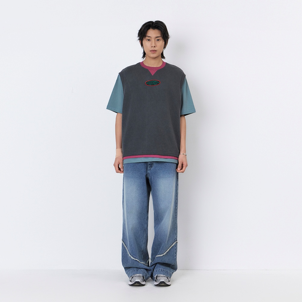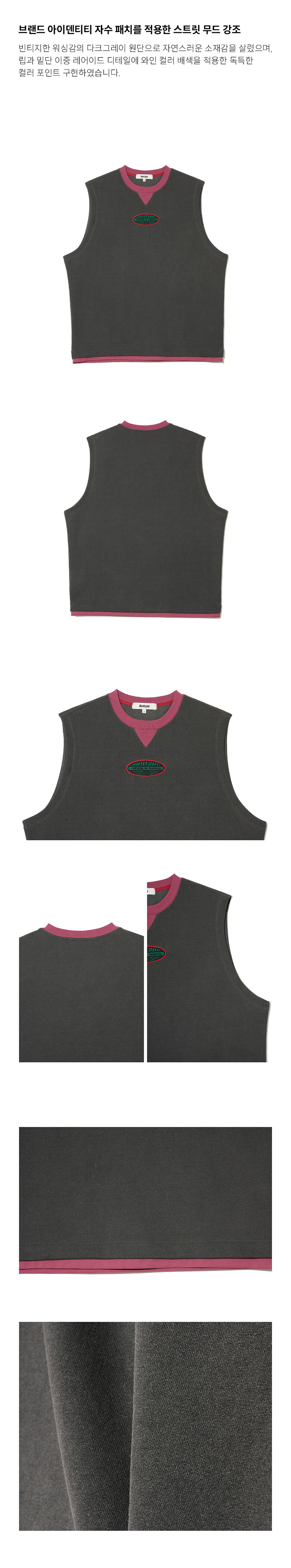 - 빈티지한 워싱감의 다크그레이 원단으로 자연스러운 소재감을 살렸으며, 립과 밑단 이중 레어이드 디테일에 와인 컬러 배색을 적용한 독특한 컬러 포인트 구현