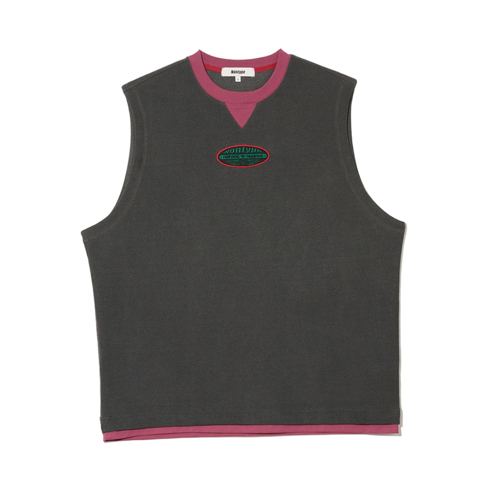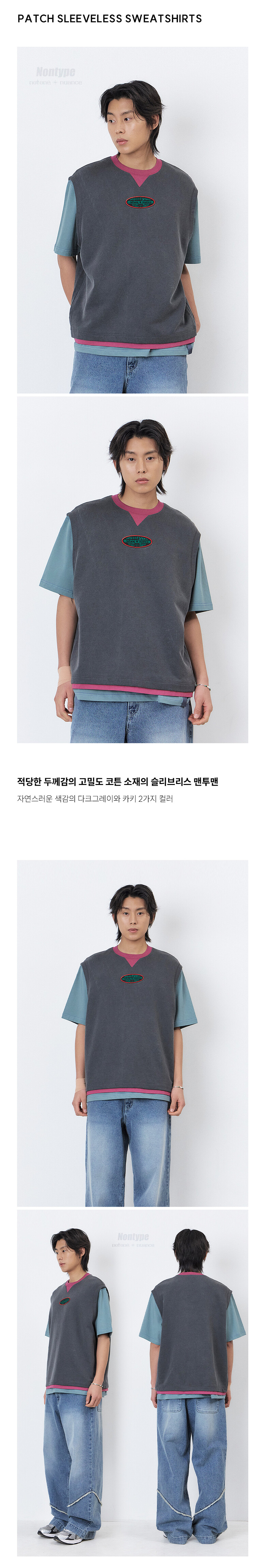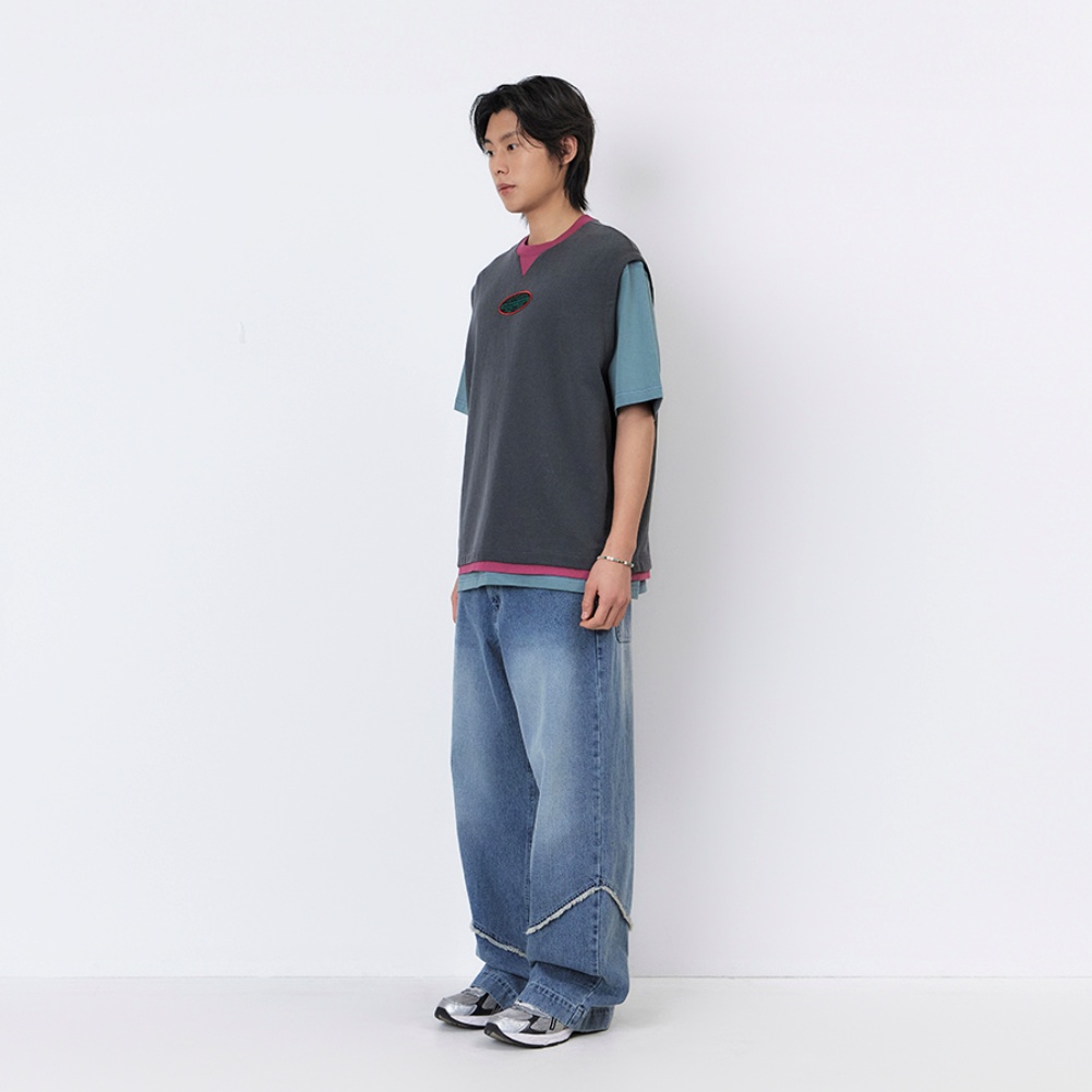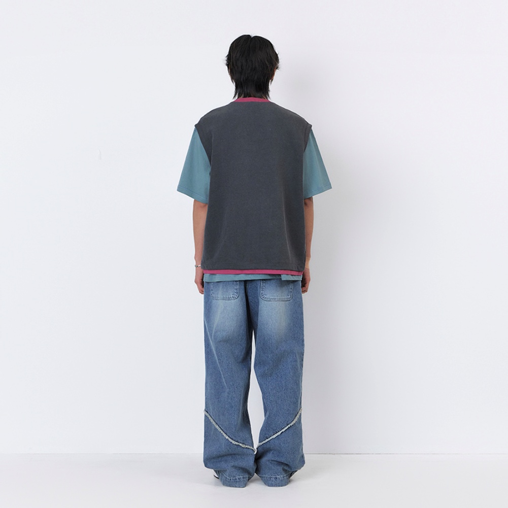 - 빈티지한 워싱감의 다크그레이 원단으로 자연스러운 소재감을 살렸으며, 립과 밑단 이중 레어이드 디테일에 와인 컬러 배색을 적용한 독특한 컬러 포인트 구현