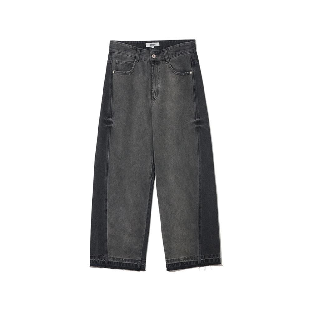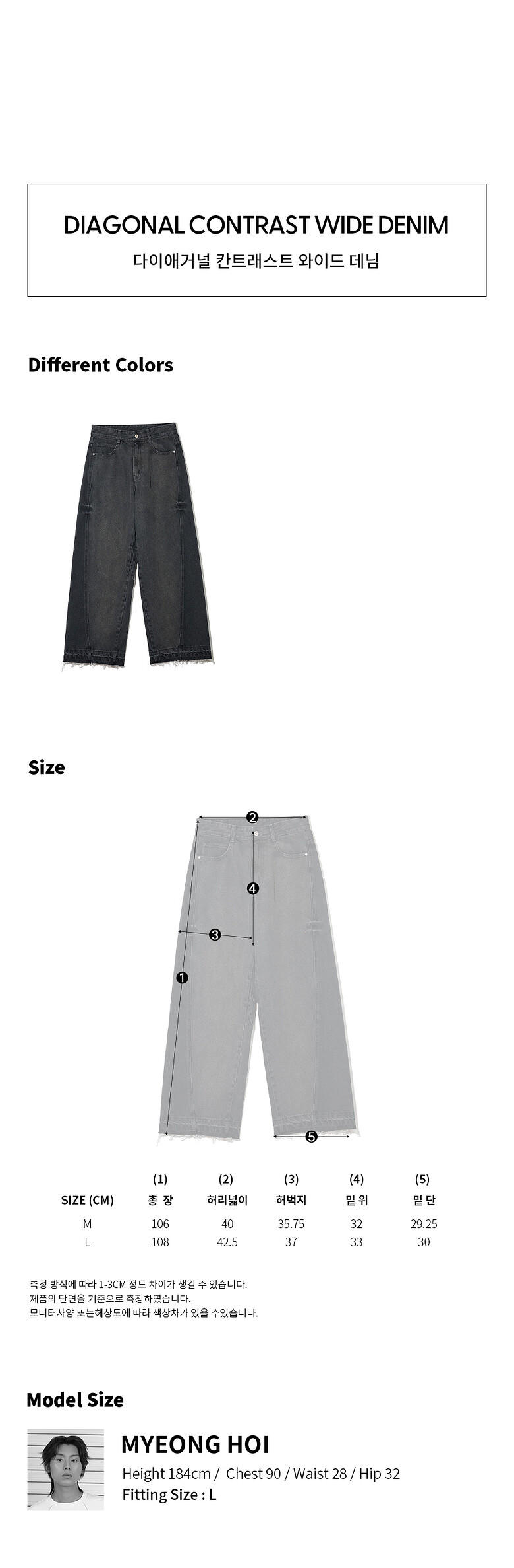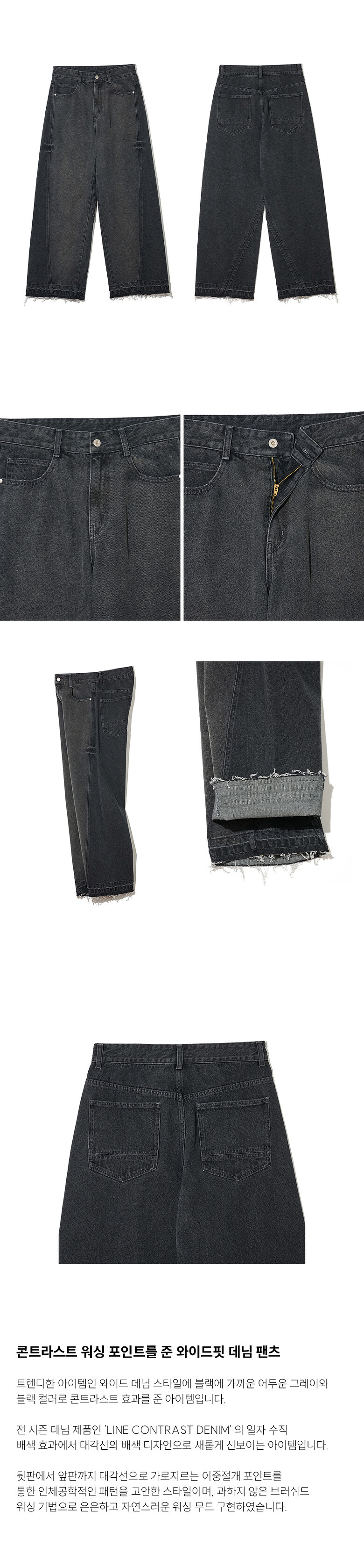 - 트렌디한 아이템인 와이드 데님 스타일에 블랙에 가까운 어두운 그레이와 블랙 컬러로 콘트라스트 효과를 준 아이템