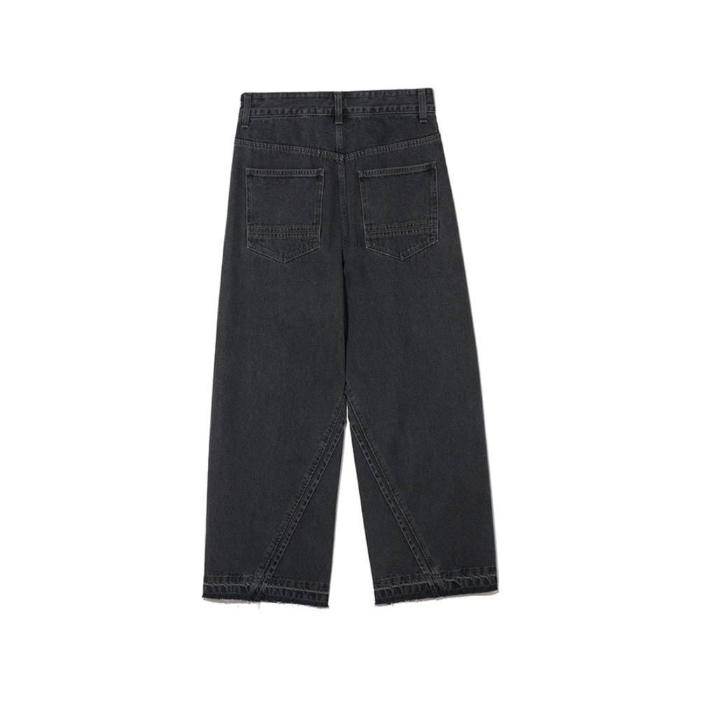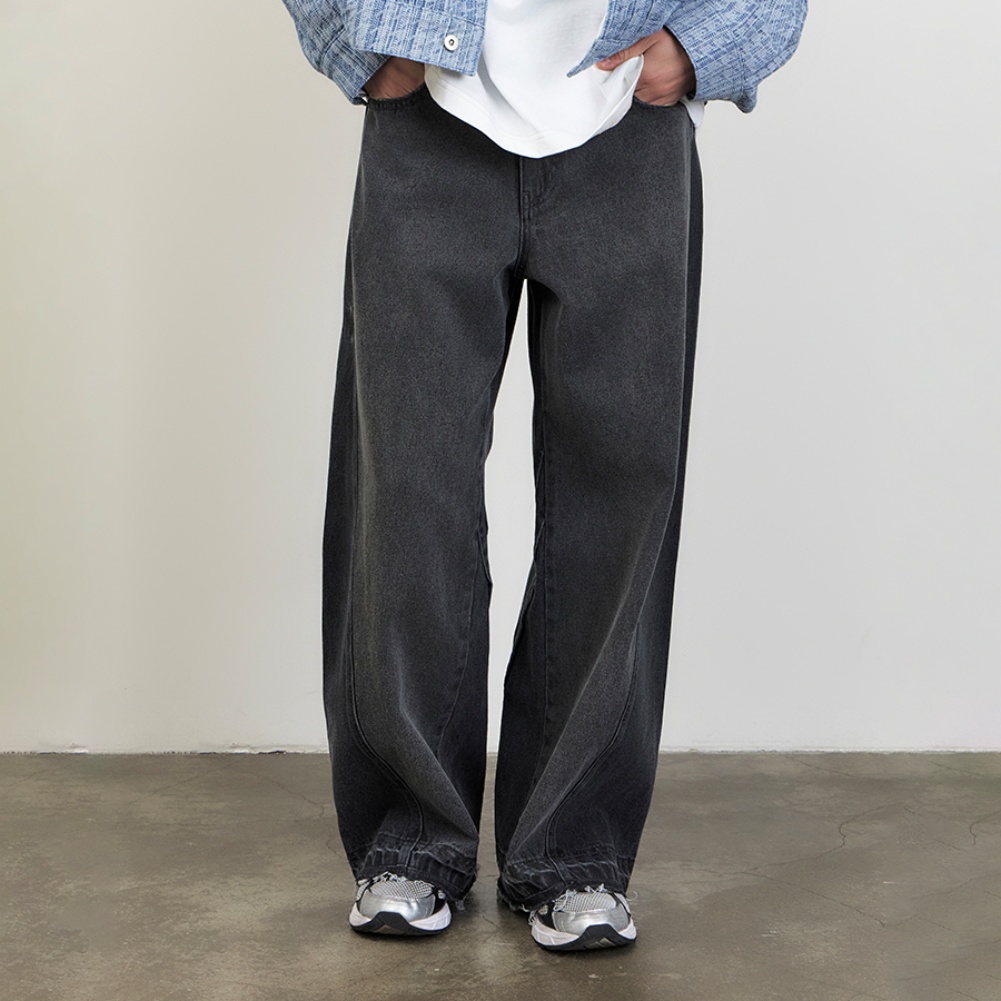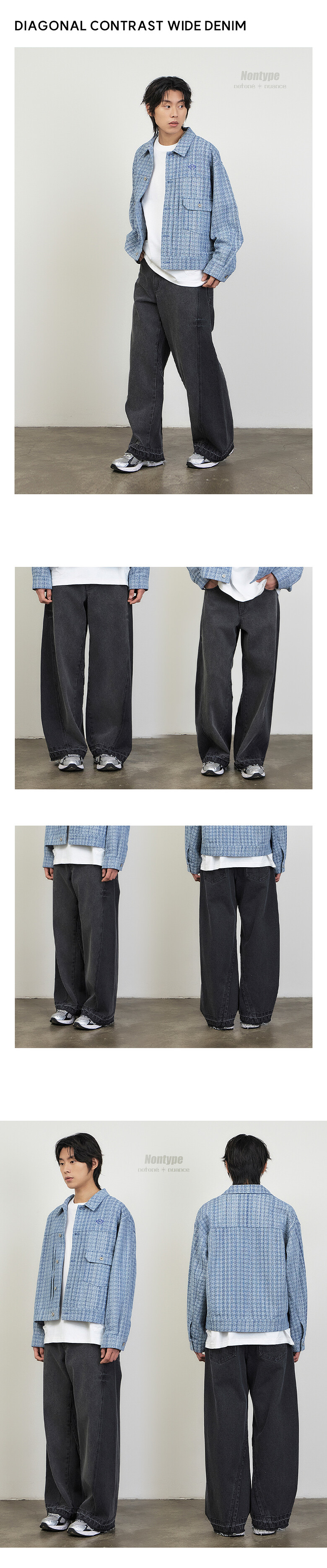 - 트렌디한 아이템인 와이드 데님 스타일에 블랙에 가까운 어두운 그레이와 블랙 컬러로 콘트라스트 효과를 준 아이템