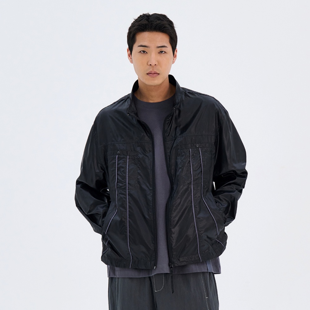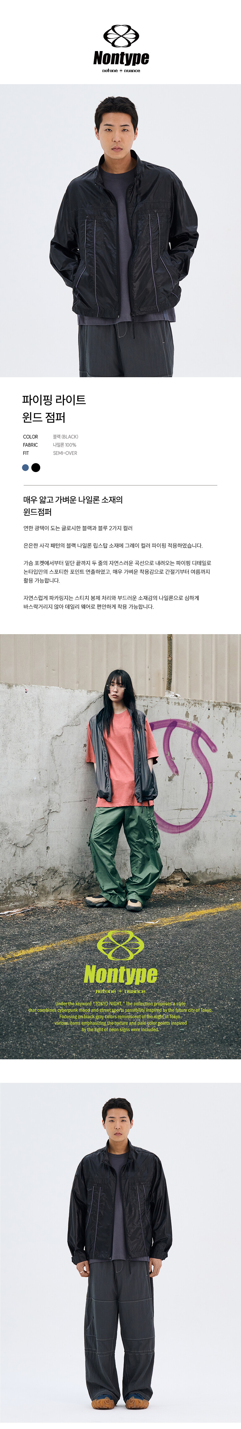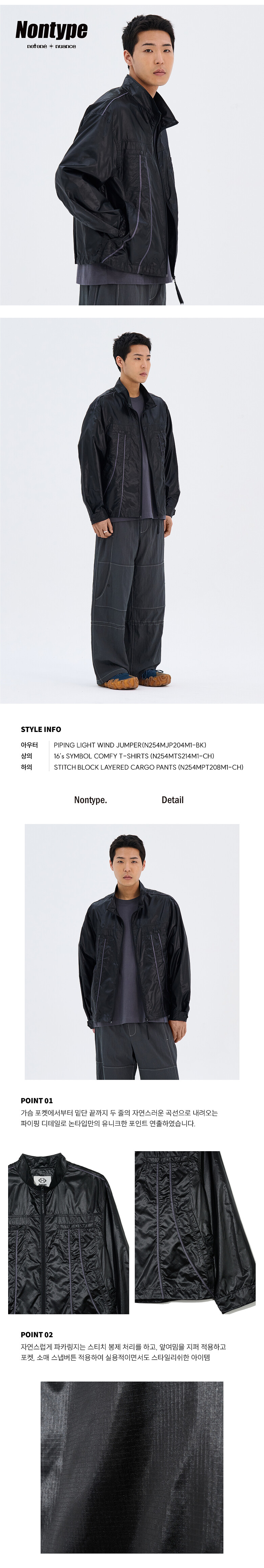 - 가슴 포켓에서부터 밑단 끝까지 두 줄의 자연스러운 곡선으로 내려오는 파이핑 디테일로 논타입만의 스포티한 포인트 연출