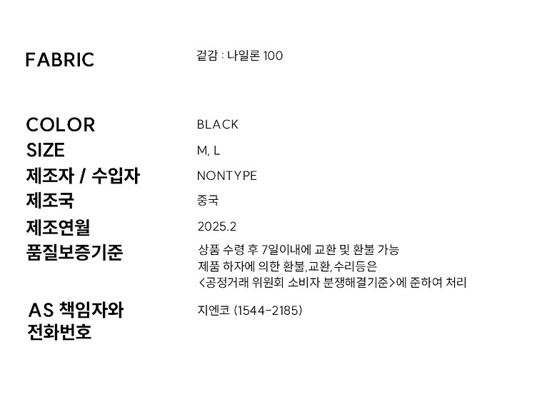 (주)지엔코에서는 당사 제품을 구입하신 뒤 품질에 이상이 있을 경우에는 피해자 보상규정에 따라 다음과 같이 보상하여 드립니다. 원단불량, 부자재불량, 봉제불량, 부당표시 (미표시 및 부실표시)및 소재구성 부적절한 세탁사고/구입일로부터 1년이내분은 무상, 유상수선, 교환 또는 환불함