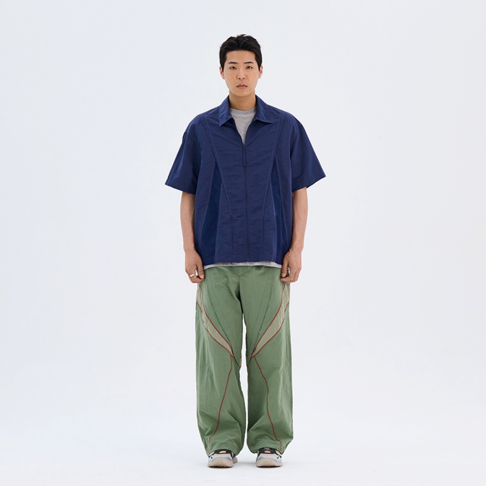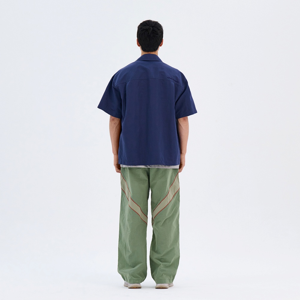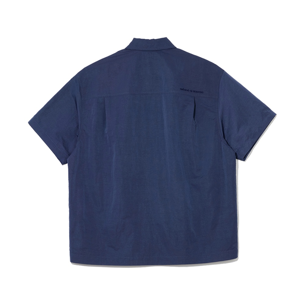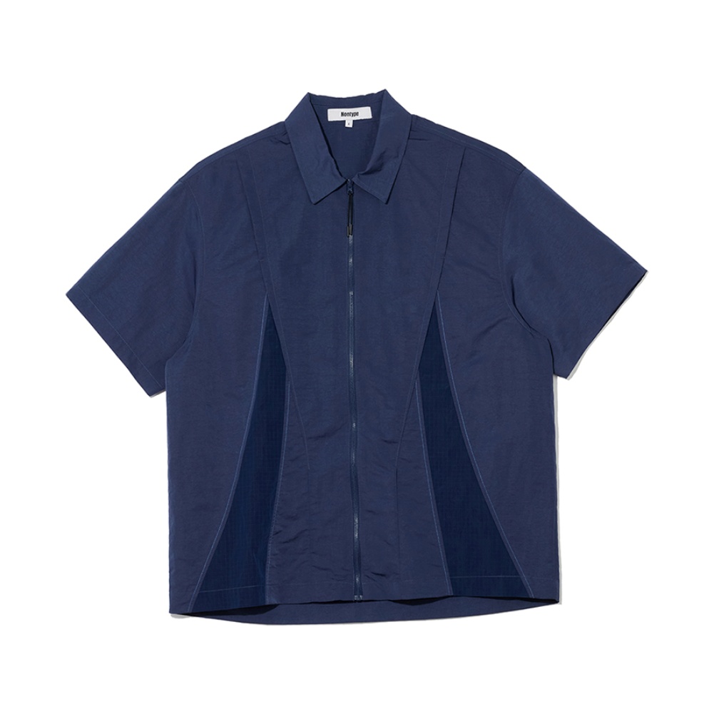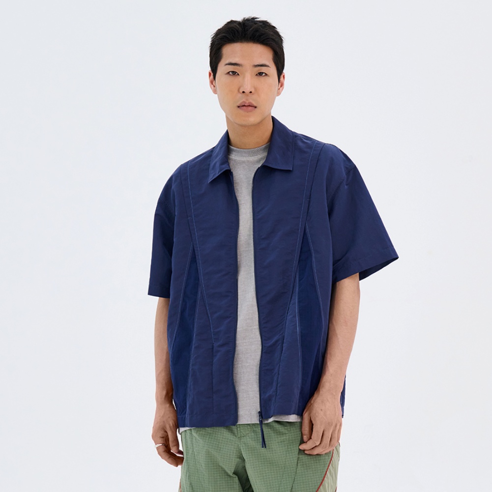 - 농도가 진한 네이비 몸판에 은은한 사각 패턴의 다크블루 나일론 립스탑 소재의 곡선 패널 배색을 톤온톤 컬러 포인트로 적용한 셔츠