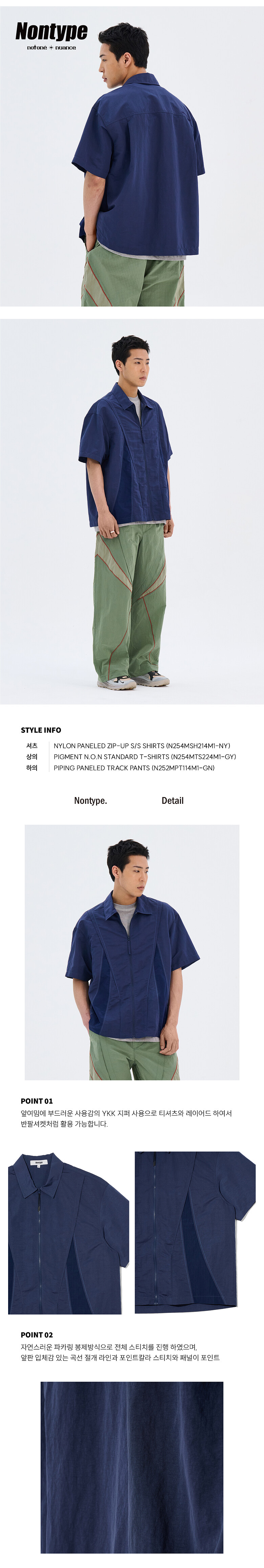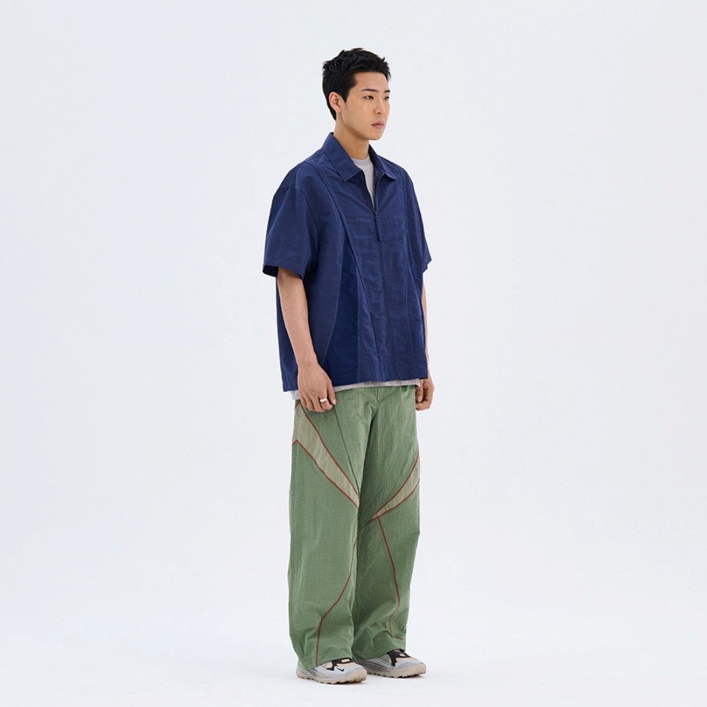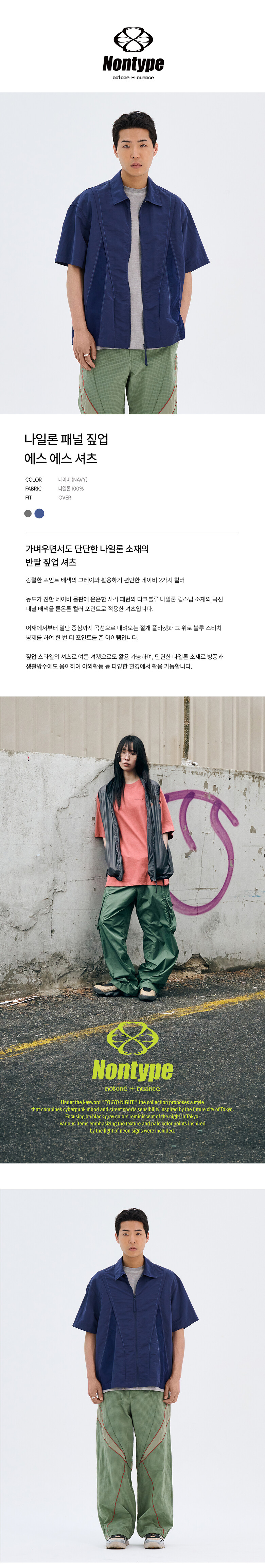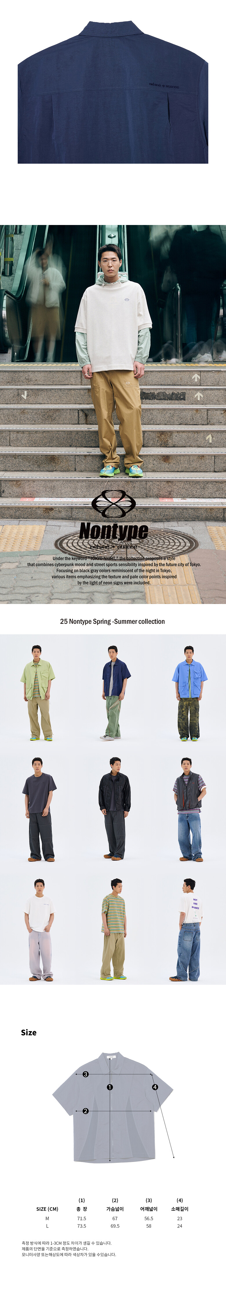 - 농도가 진한 네이비 몸판에 은은한 사각 패턴의 다크블루 나일론 립스탑 소재의 곡선 패널 배색을 톤온톤 컬러 포인트로 적용한 셔츠