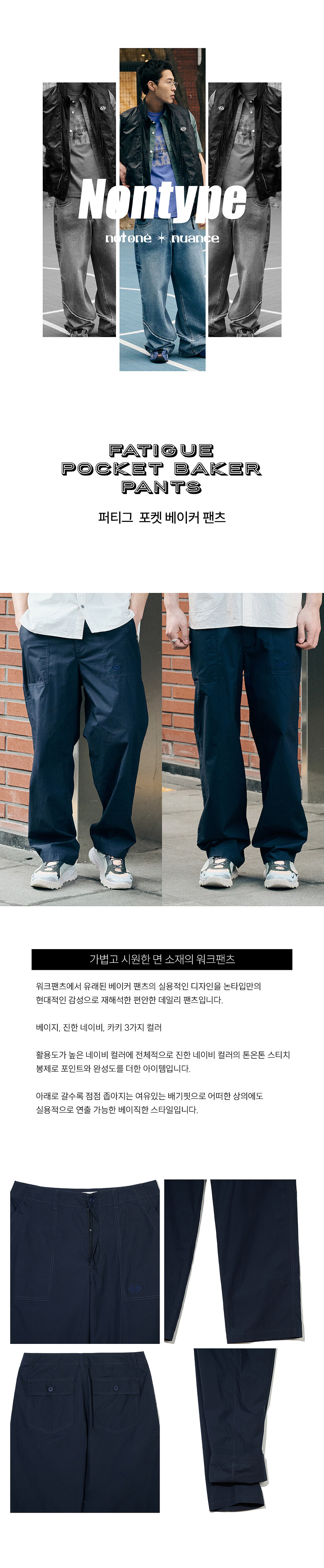 - 워크팬츠에서 유래된 베이커 팬츠의 실용적인 디자인을 논타입만의 현대적인 감성으로 재해석한 편안한 데일리 팬츠