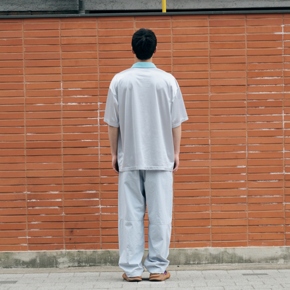 - 광택있는 실버 저지 소재에 부드럽게 짠 스카이 오픈카라 배색으로 포인트를 준 아이템