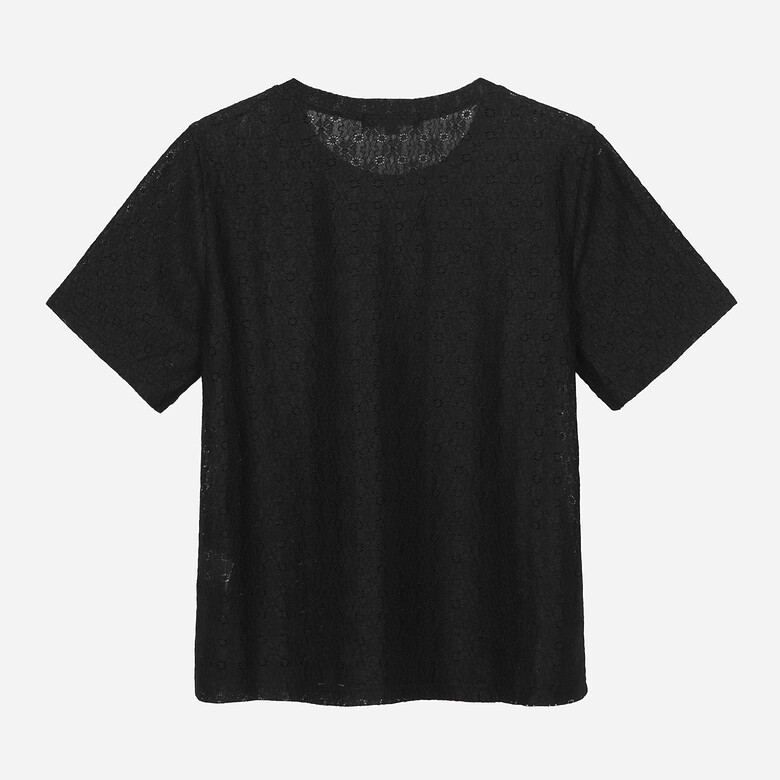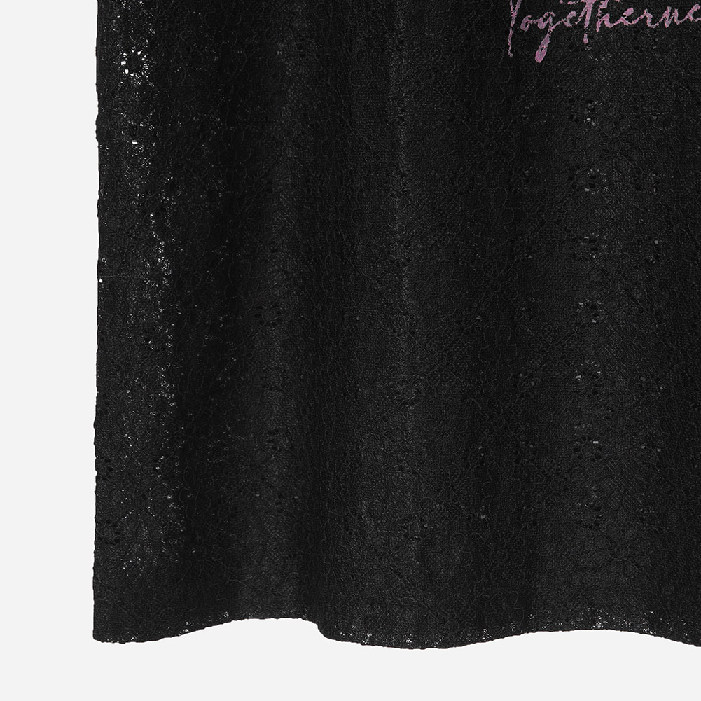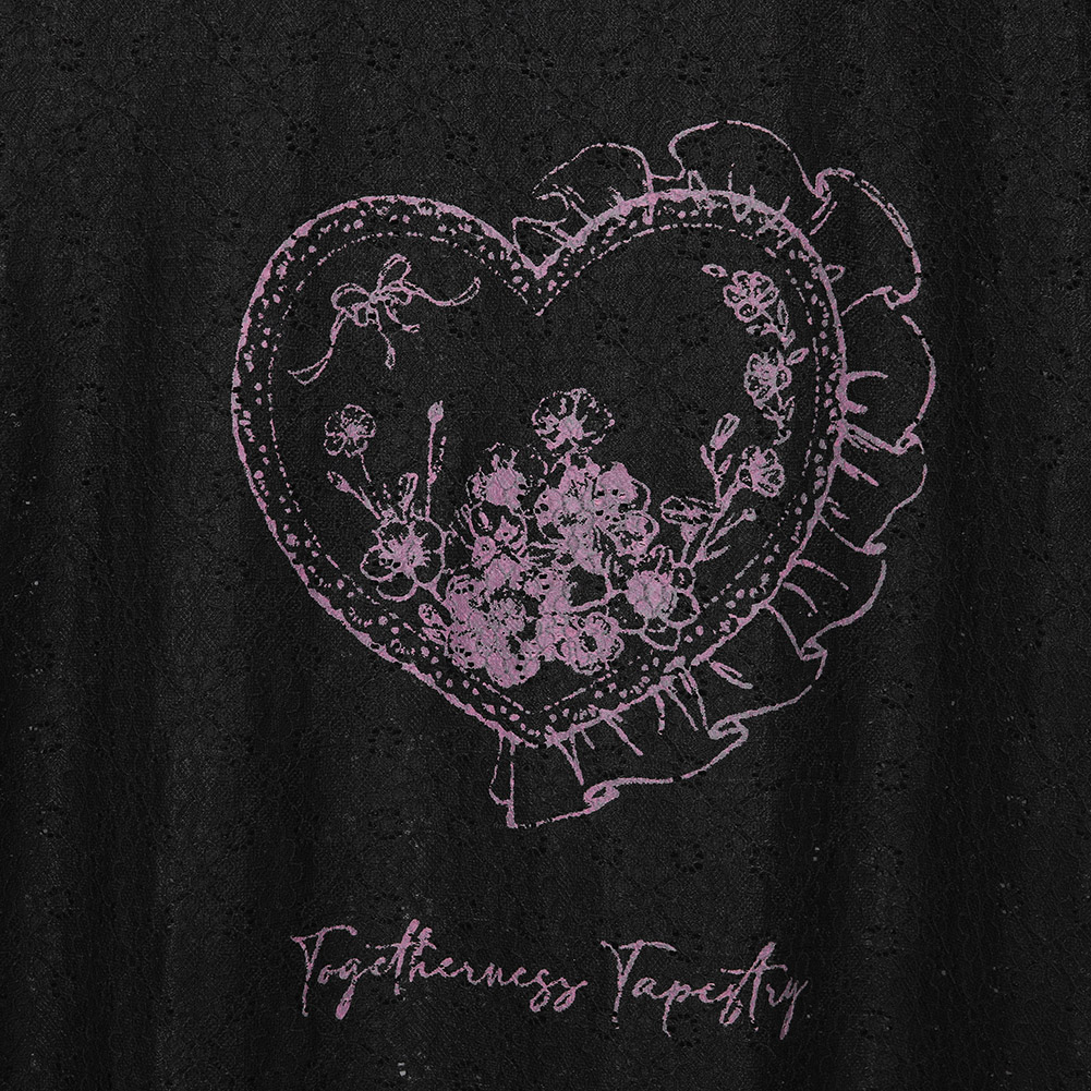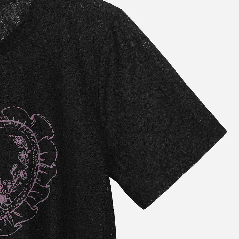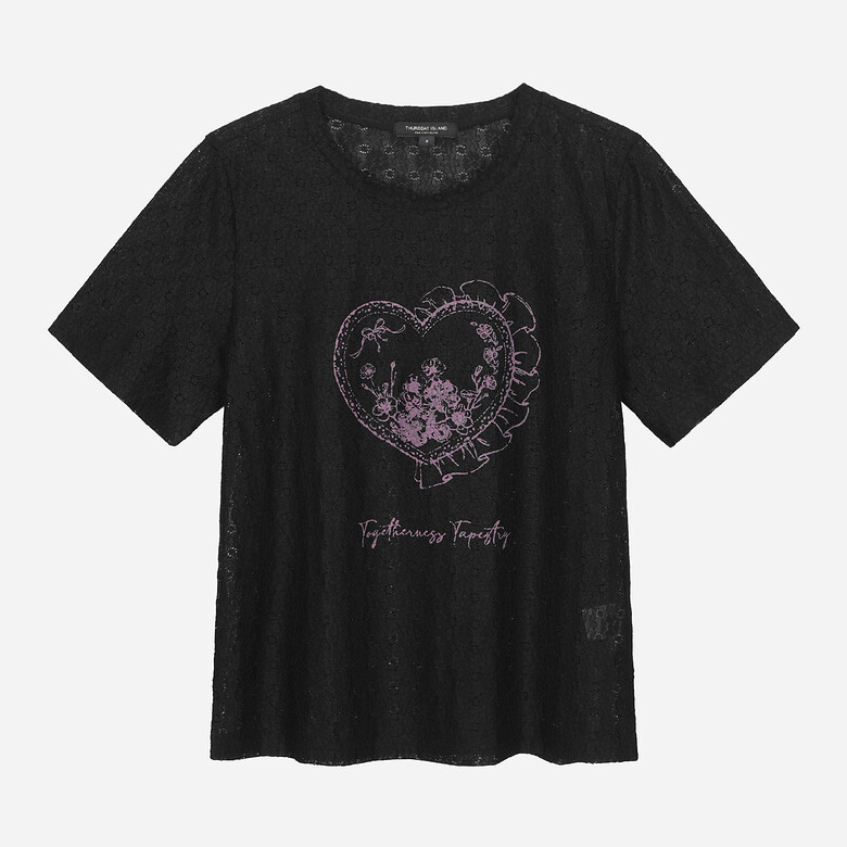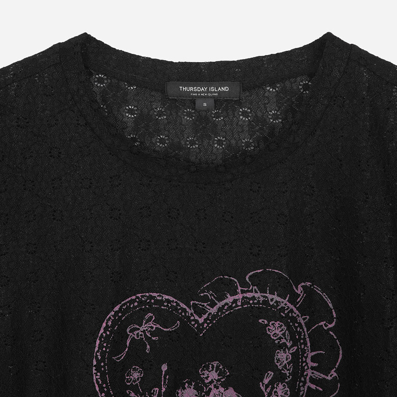 하트 쿠션 아트워크로 포인트를 준 시스루한 져지 레이스의 레귤러 핏 티셔츠.