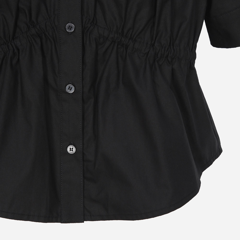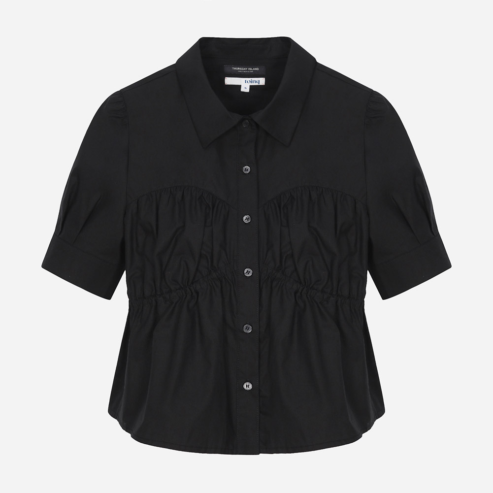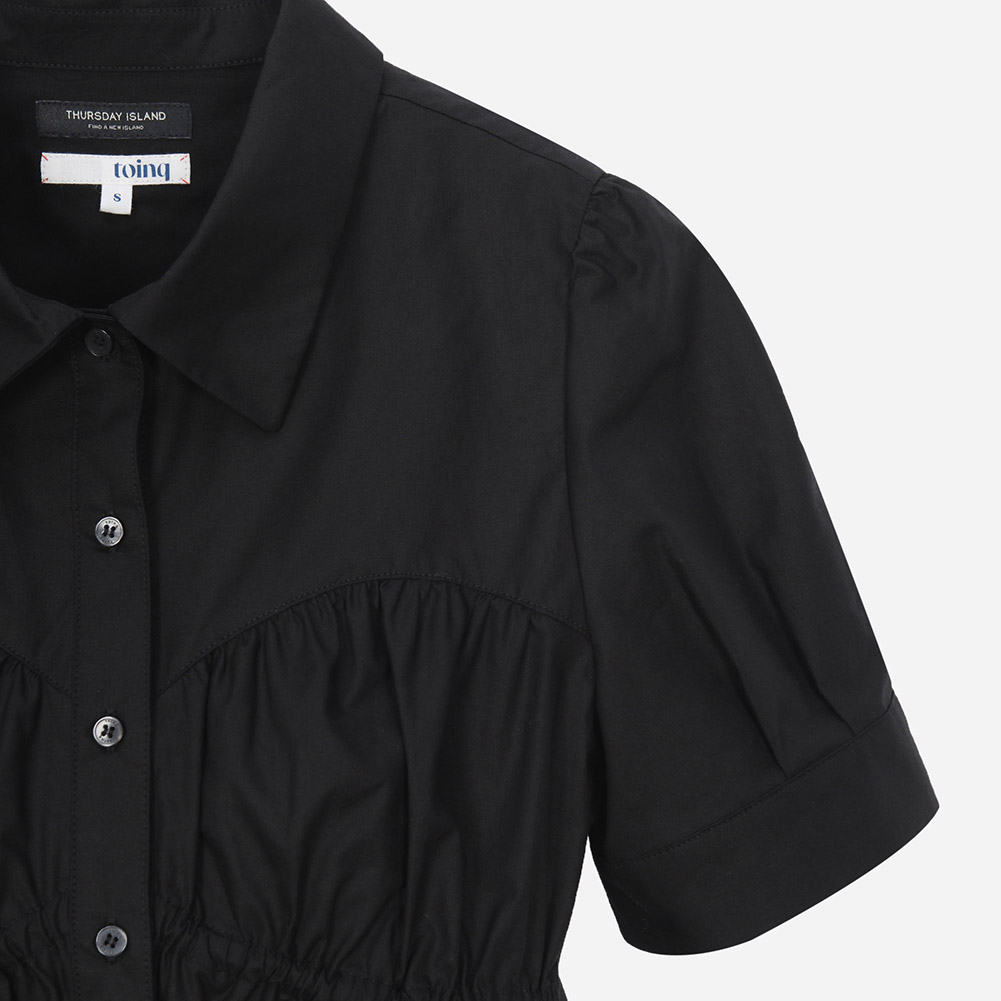 가슴 부분의 자연스러운 셔링이 볼륨감을 더해주고, 허리라인이 들어가 여성스러운 무드를 더해주는 아이템