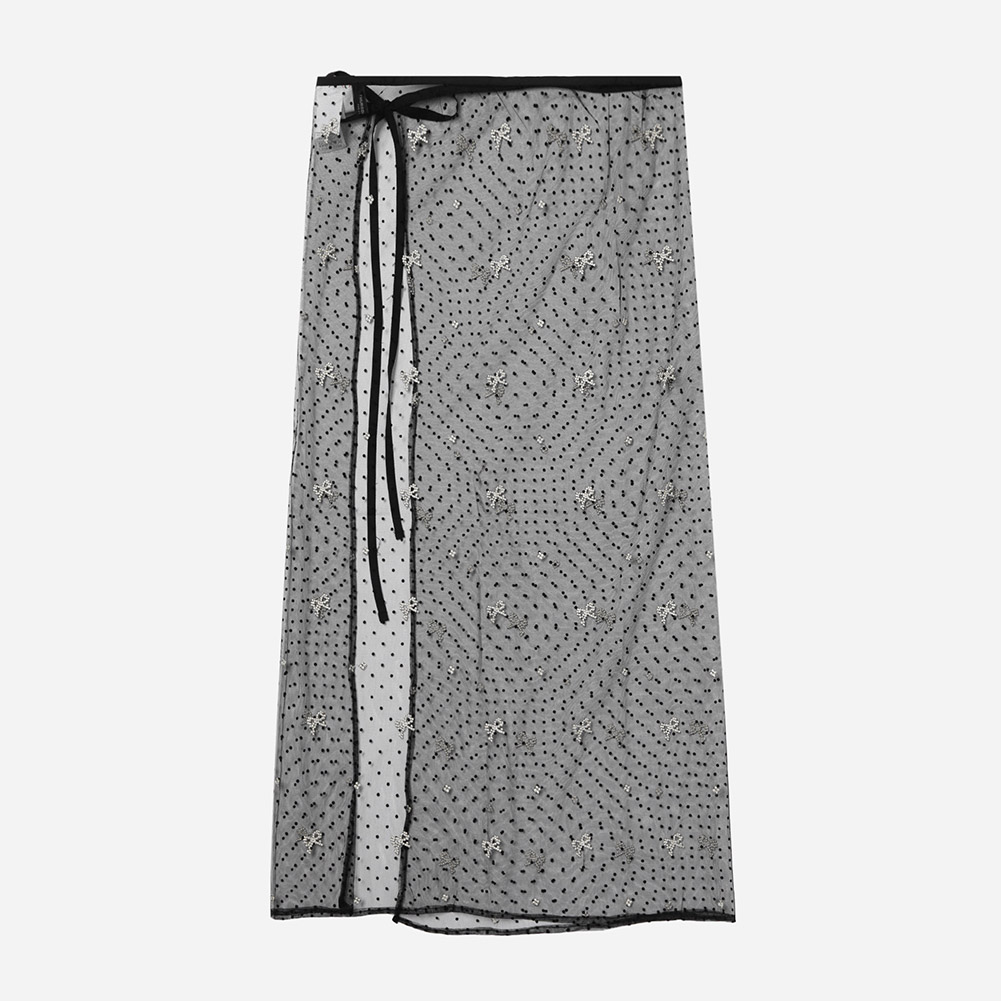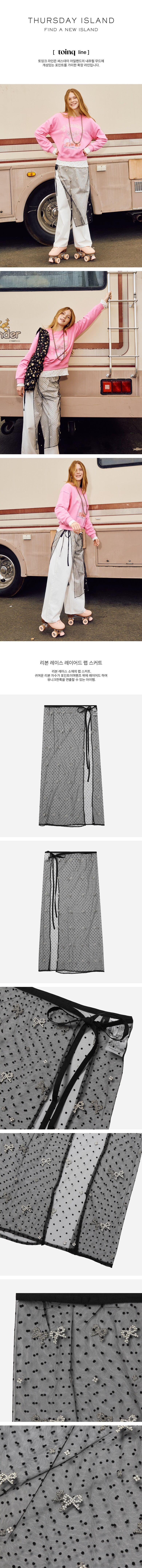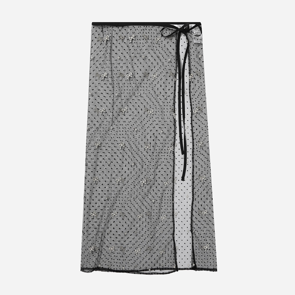 귀여운 리본 자수가 포인트이며 팬츠 위에 레이어드 하여 유니크한 룩을 연출할 수 있는 아이템.