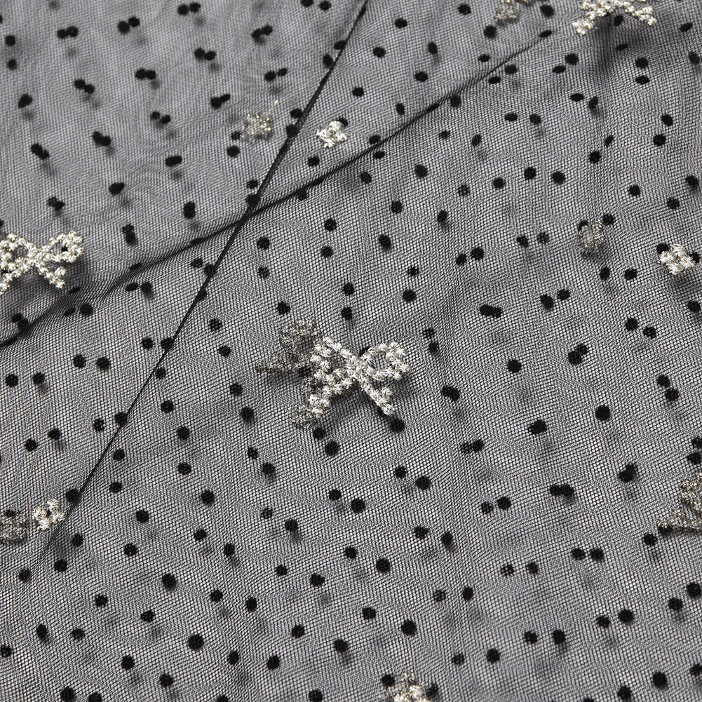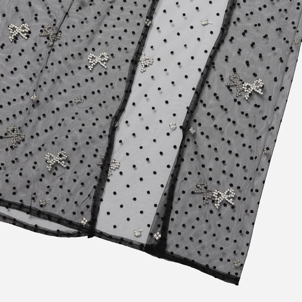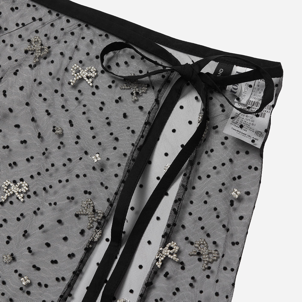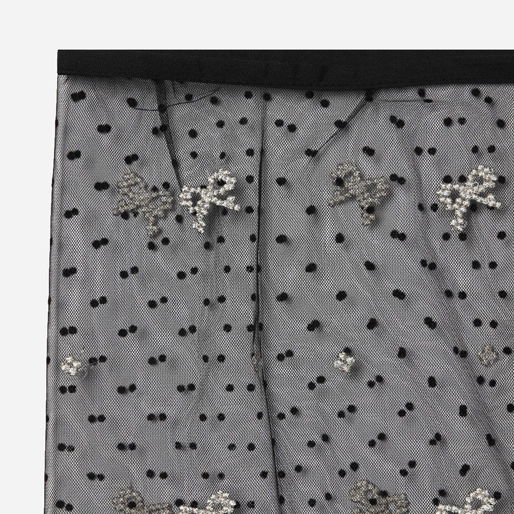 귀여운 리본 자수가 포인트이며 팬츠 위에 레이어드 하여 유니크한 룩을 연출할 수 있는 아이템.