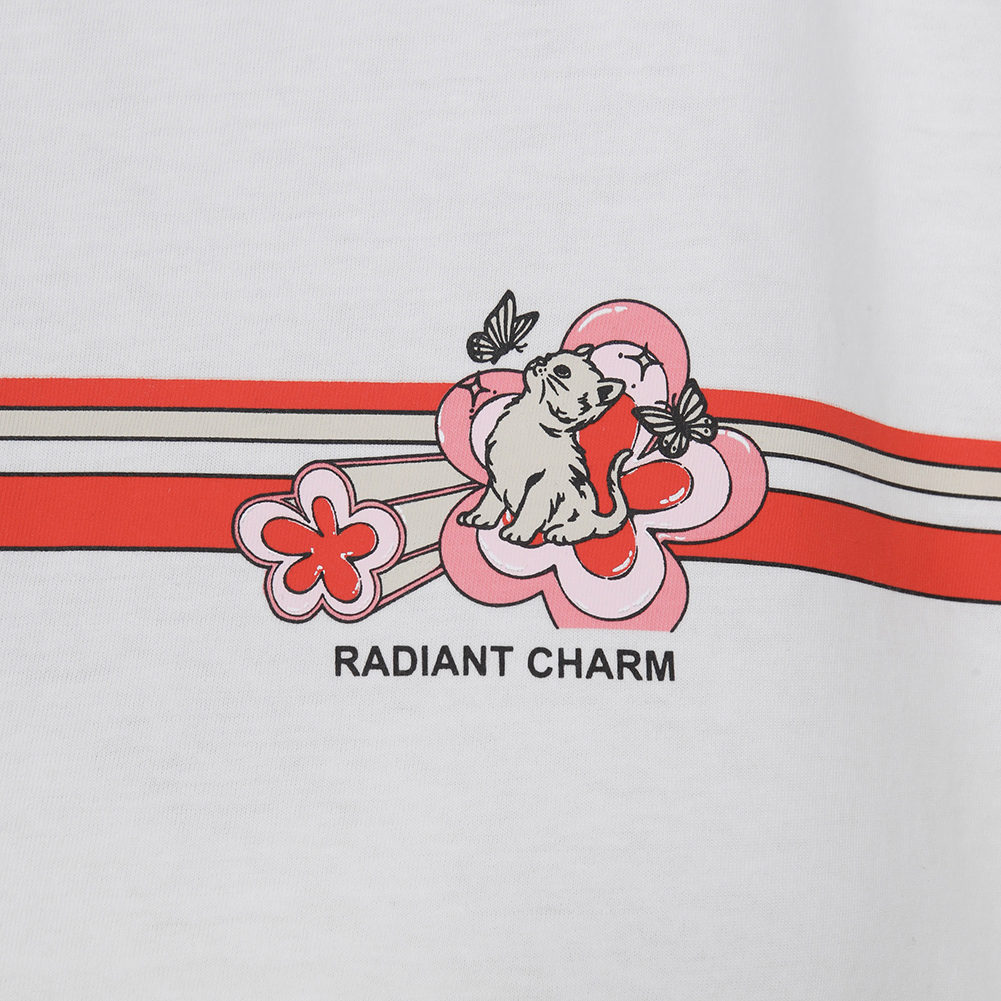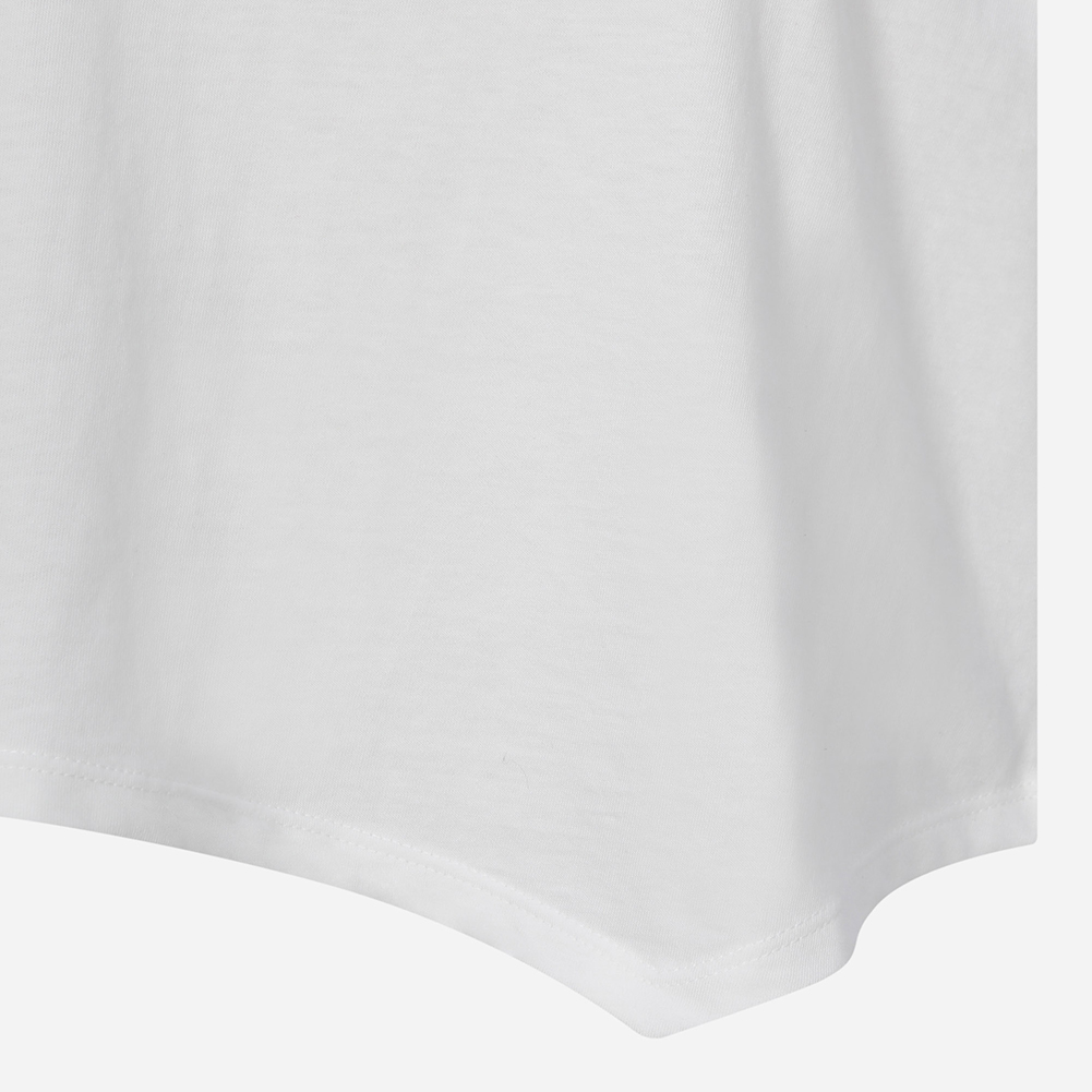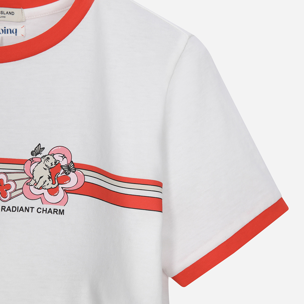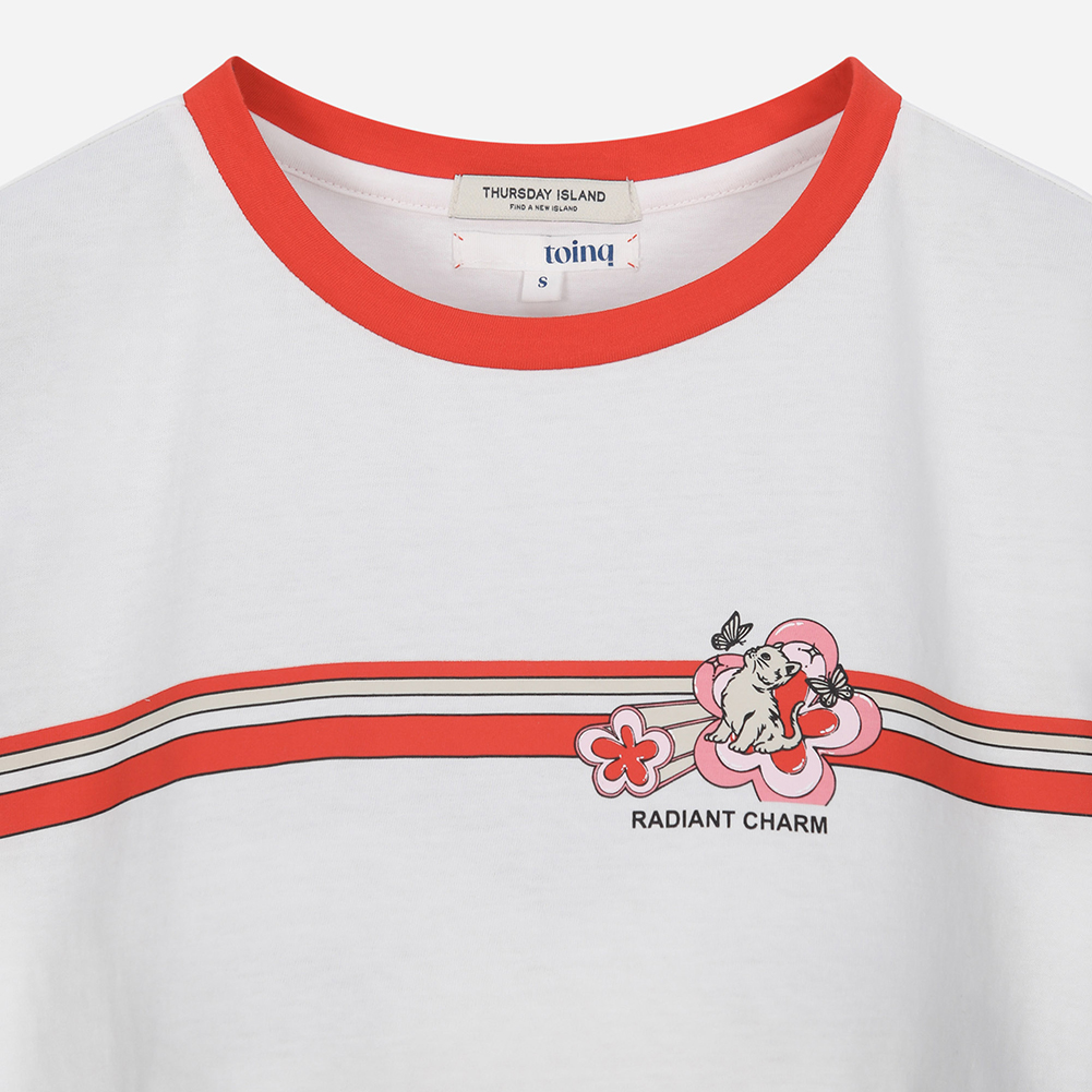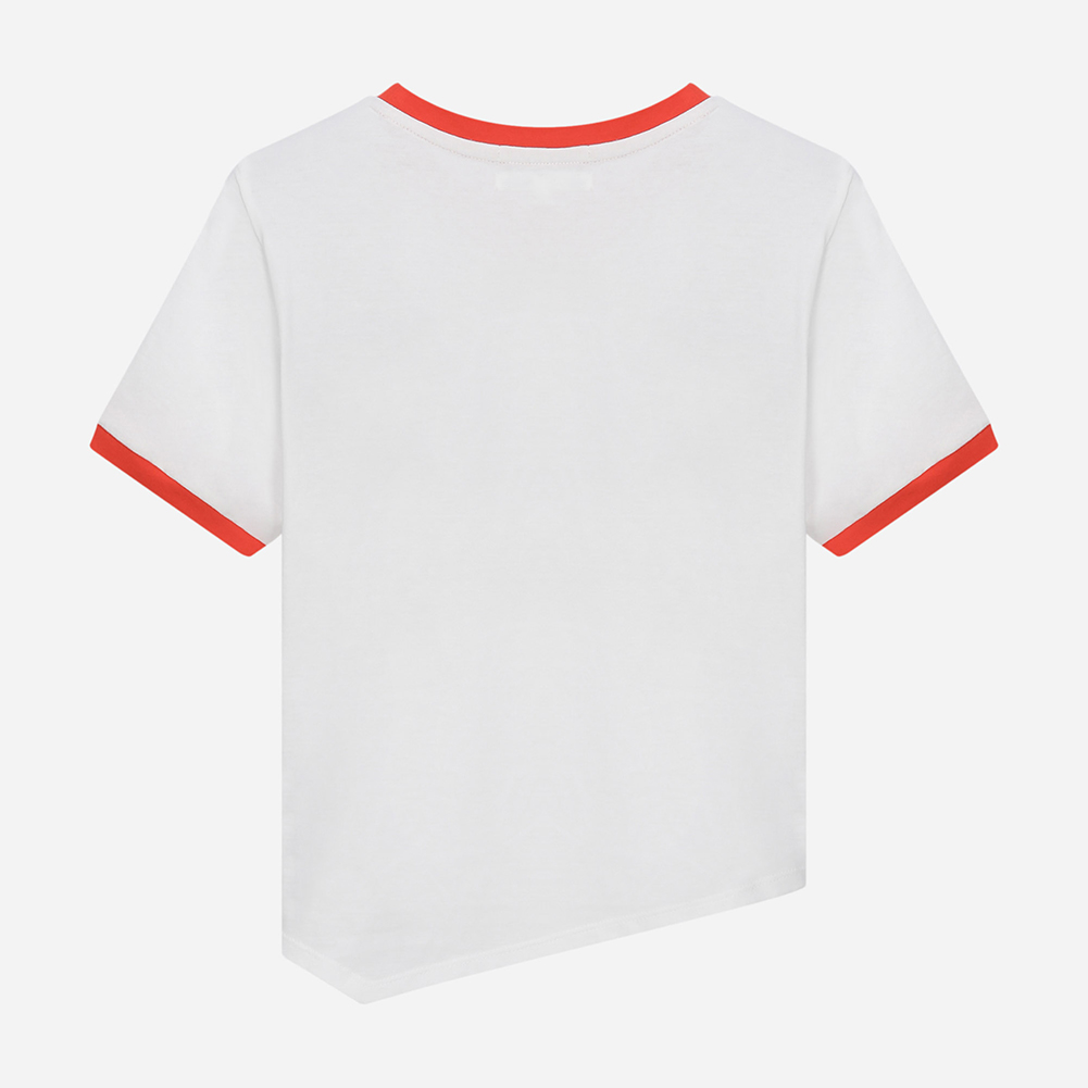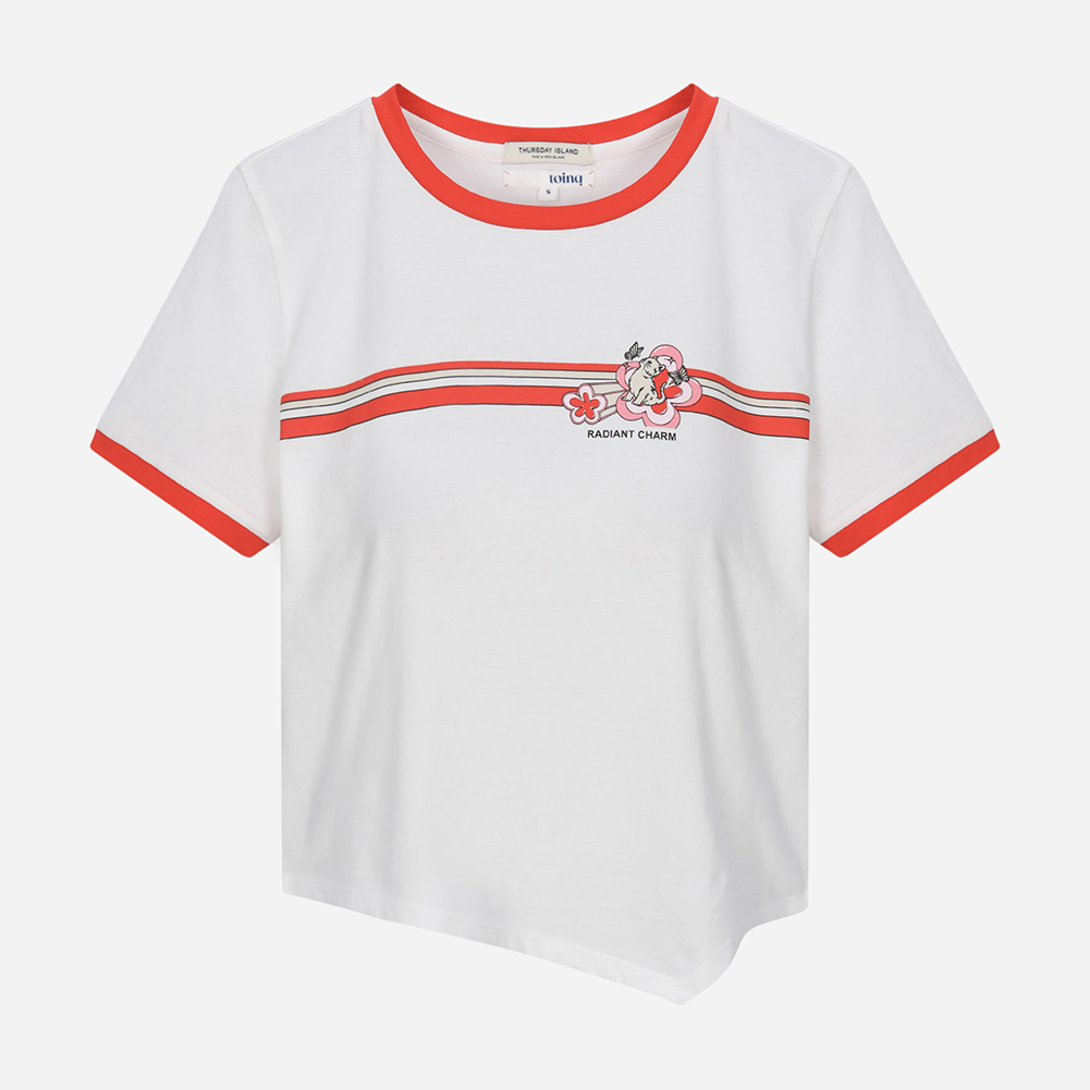 밑단 언발란스가 포인트인 크롭형 링거 티셔츠.