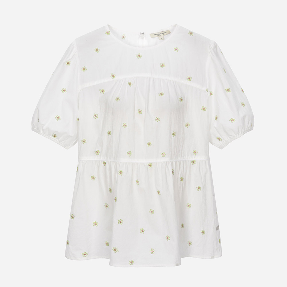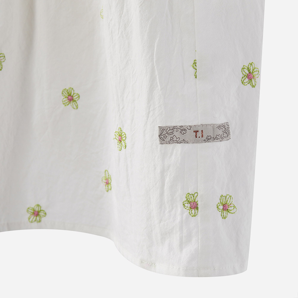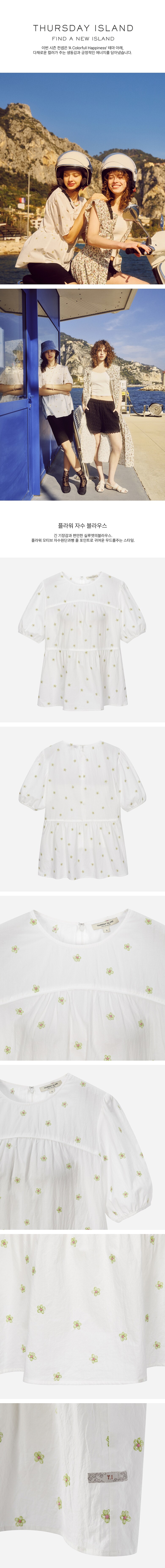 긴 기장감과 편안한 실루엣의 블라우스.플라워 모티브 자수원단과 삥 줄 포인트로 귀여운 무드를 주는 스타일.
