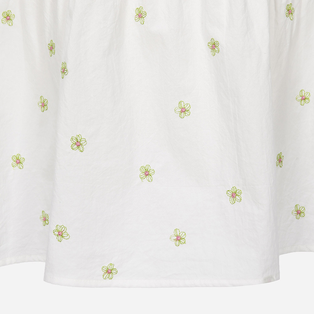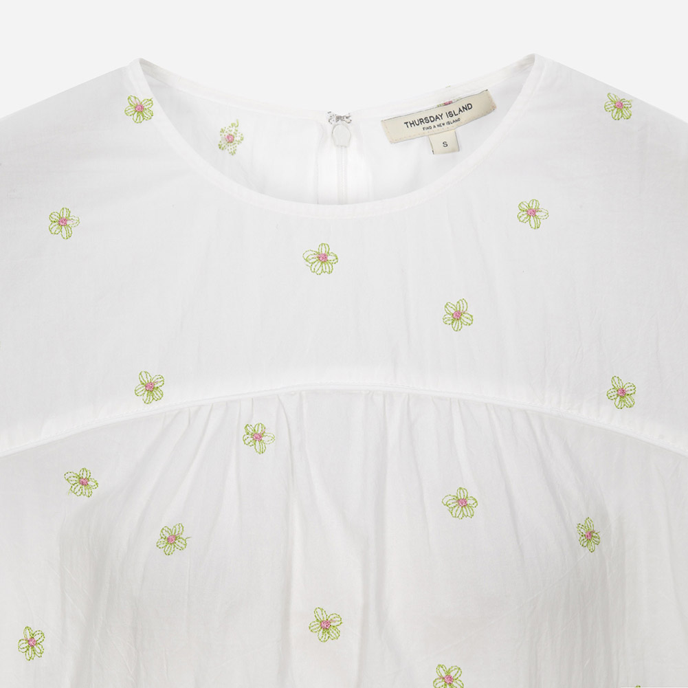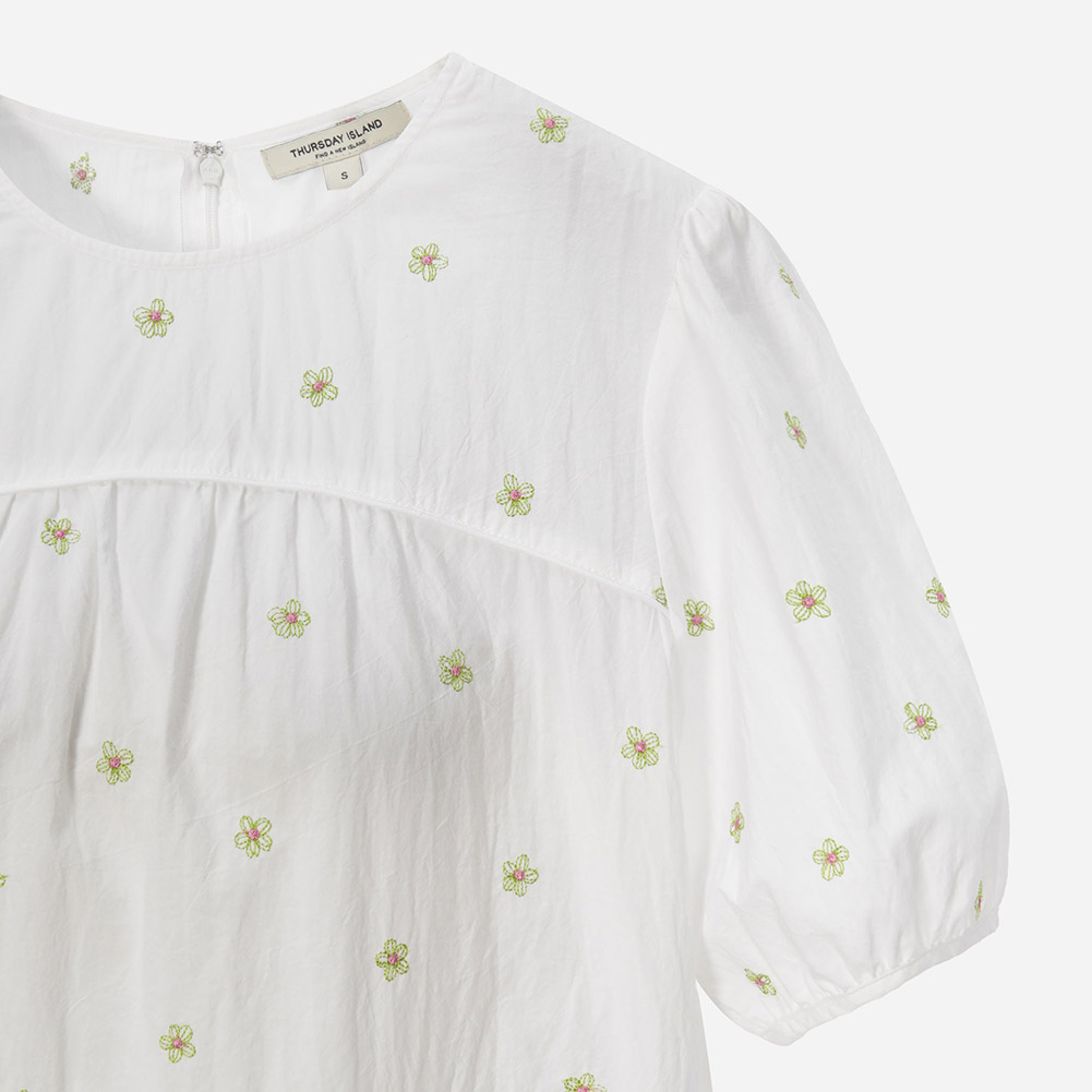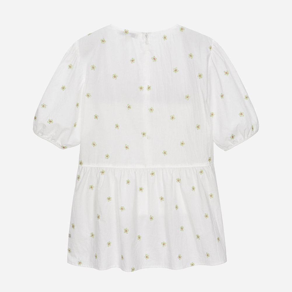 긴 기장감과 편안한 실루엣의 블라우스.플라워 모티브 자수원단과 삥 줄 포인트로 귀여운 무드를 주는 스타일.