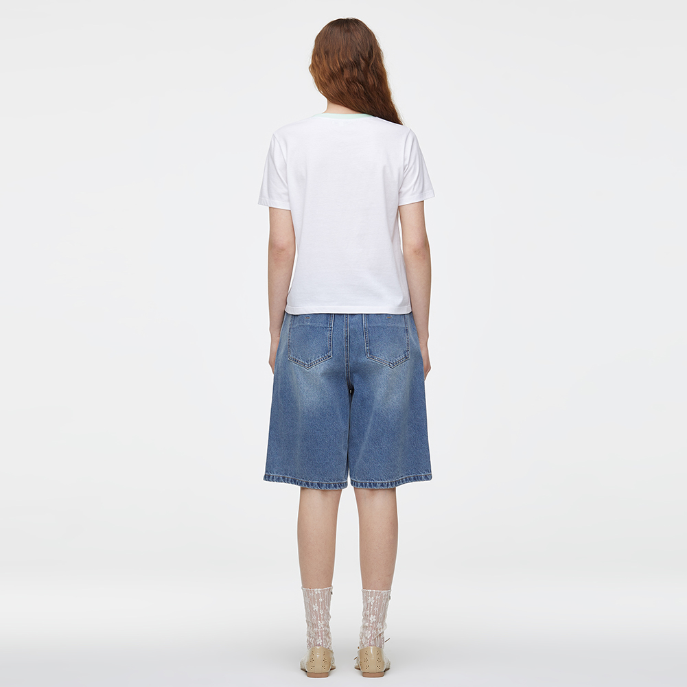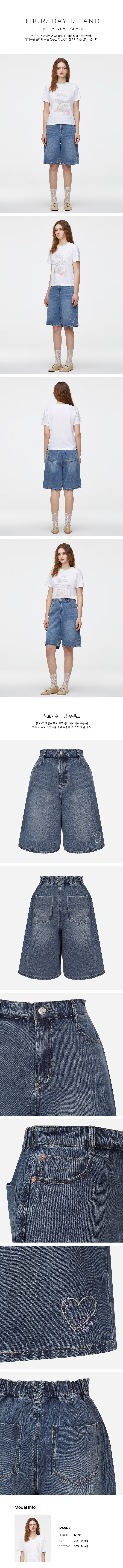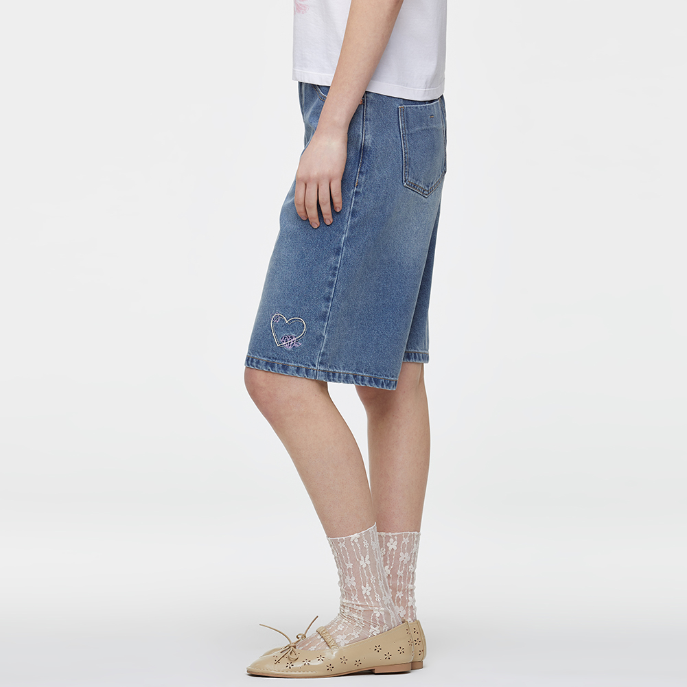 톤 다운된 워싱톤의 무릎 윗기장의 데님 끝단에 하트 자수로 포인트를 준 캐주얼한 숏 기장 데님 팬츠.