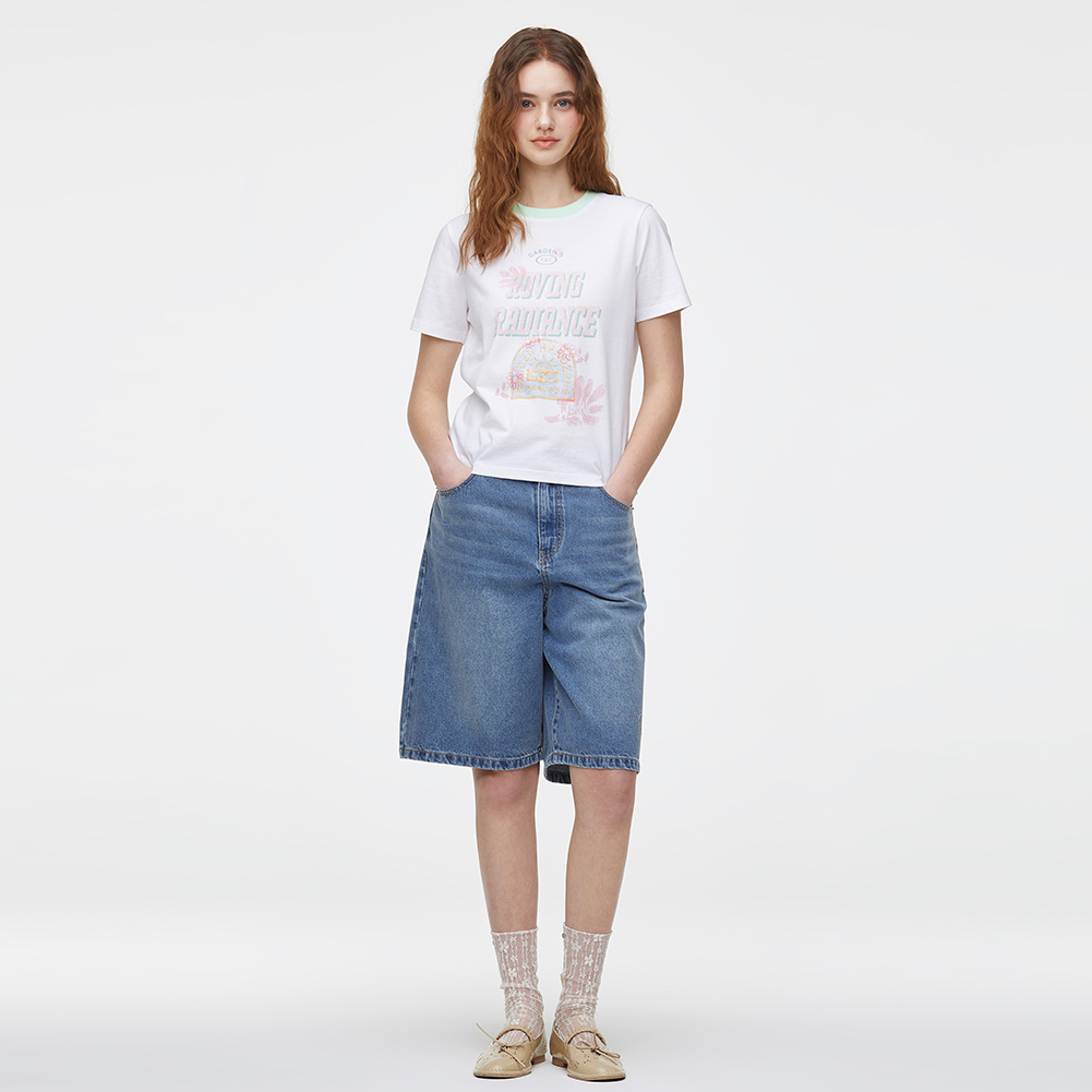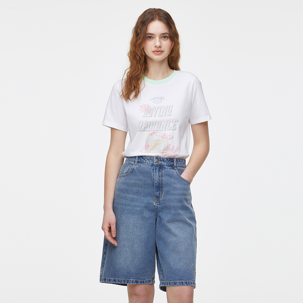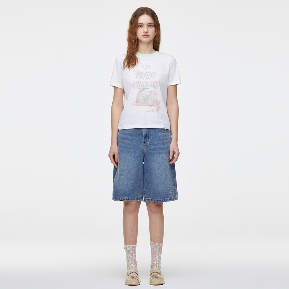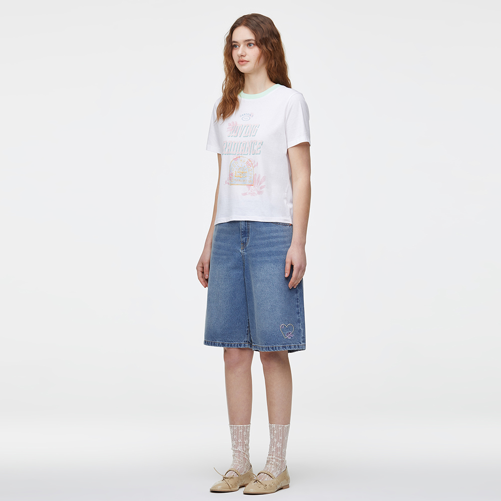 톤 다운된 워싱톤의 무릎 윗기장의 데님 끝단에 하트 자수로 포인트를 준 캐주얼한 숏 기장 데님 팬츠.